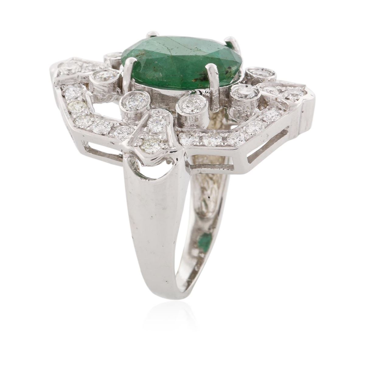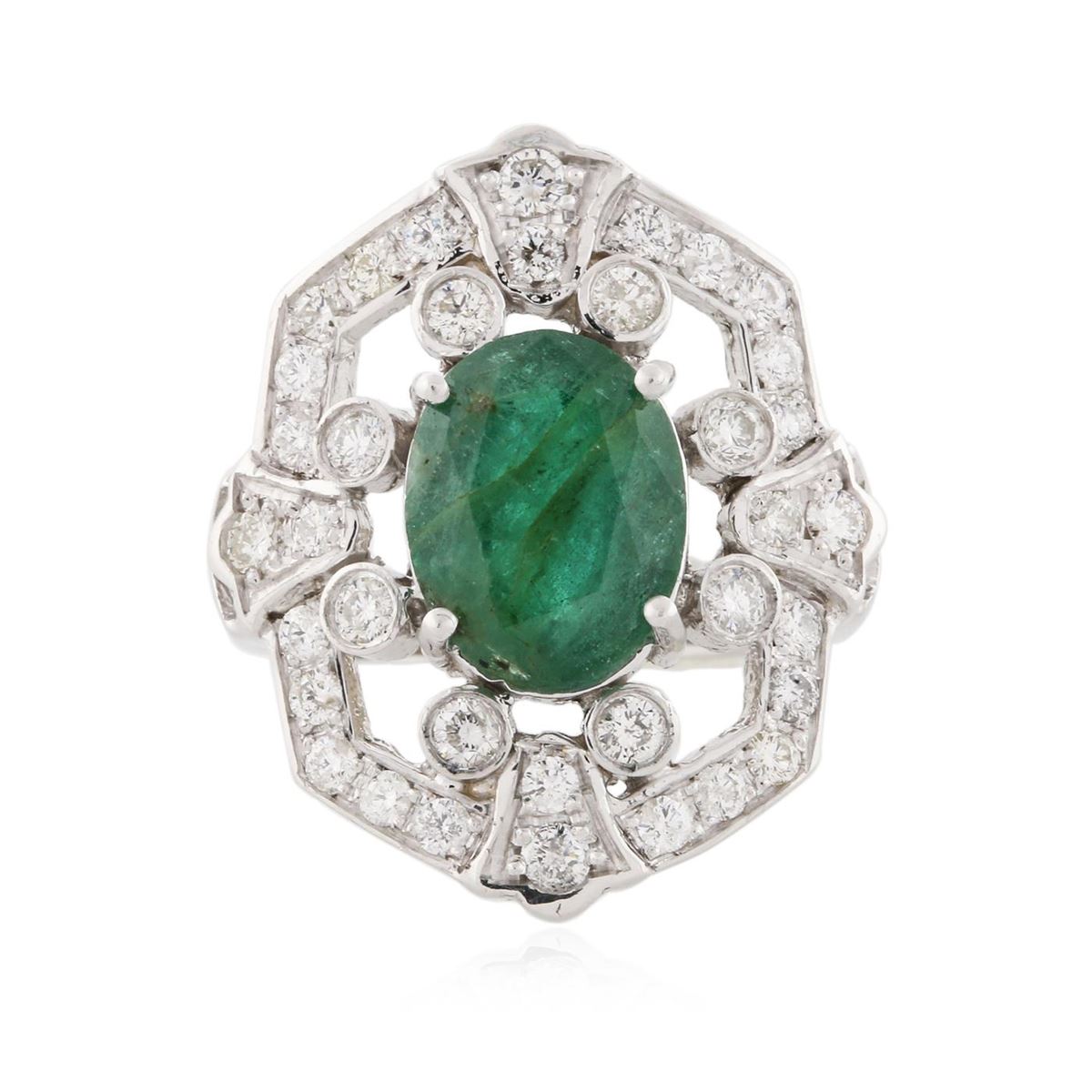 One electronically tested 14KT white gold Ladies combination cast & assembled fancy ring with a high polish finish. Condition is new. Identified with markings of "14K". Containing: One prong set oval modified brilliant cut natural emerald, measuring 11.60 x 9.00 x 5.70mm, approximate weight of 3.29ct., clarity is heavily included, type III, medium dark, moderately strong, green color, (GIA G 6/4), cut is good. Colored gemstones are presumed to have been subjected to commonly used and possible undetectable color/clarity enhancement processes. Ten bezel set round brilliant cut diamonds, measuring 2.50 - 2.50 x 1.66mm (depth est.) approximate total weight of 10 Stones = 0.63ct. Clarity of SI-1 to I-1, Color of J - K, Cut is Good. Twenty-Seven bead set round brilliant cut diamonds, measuring 2.10 - 1.80 x 1.17mm (depth est.) approximate total weight of 27 Stones = 0.73ct. Clarity of SI-1 to SI-2, Color of J - L, Cut is Good. Total Weight of Colored Stones 3.29ct. Total Weight of Diamonds 1.36ct. Total Weight of Ring 8.60 grams. GGL Appraised at $12,065.00.