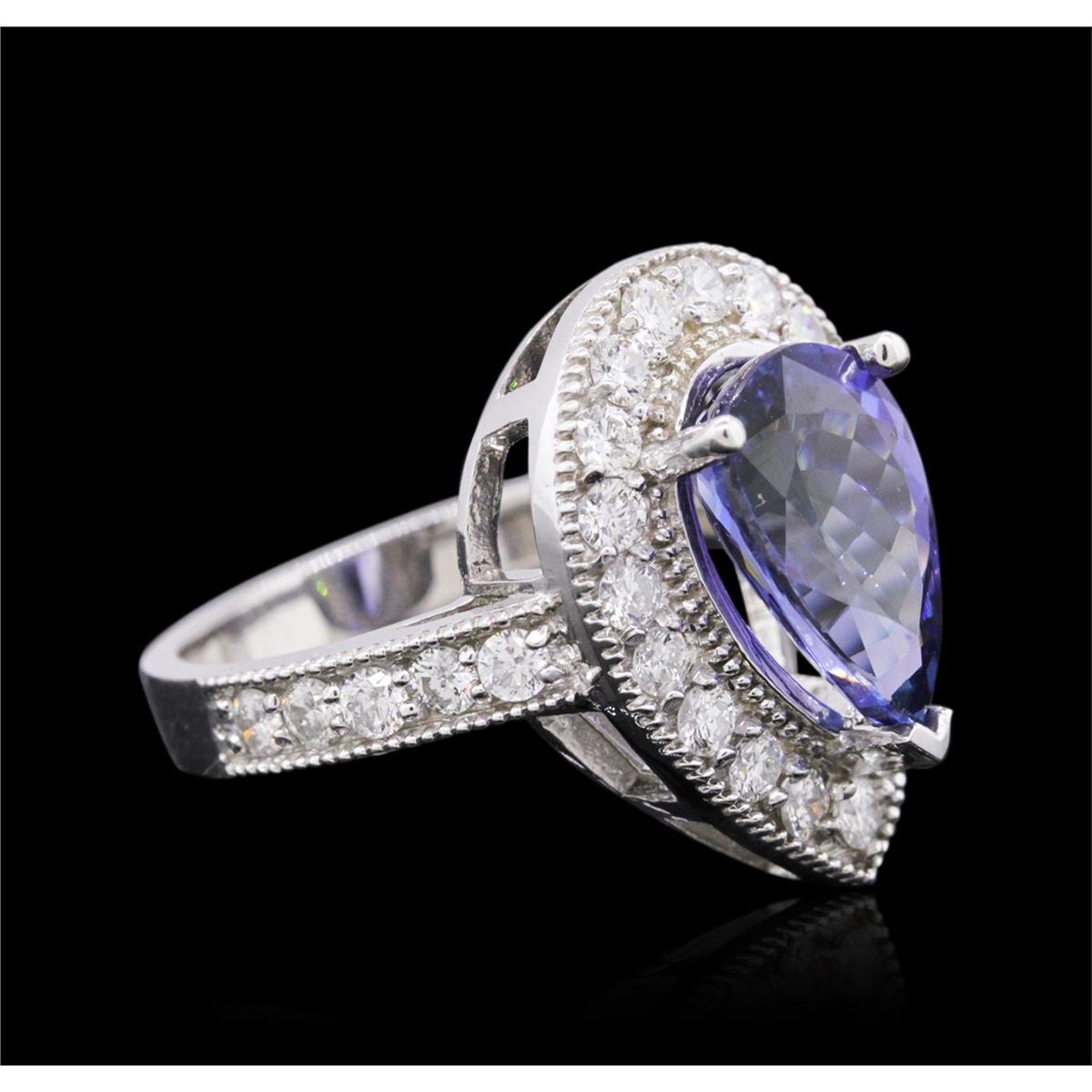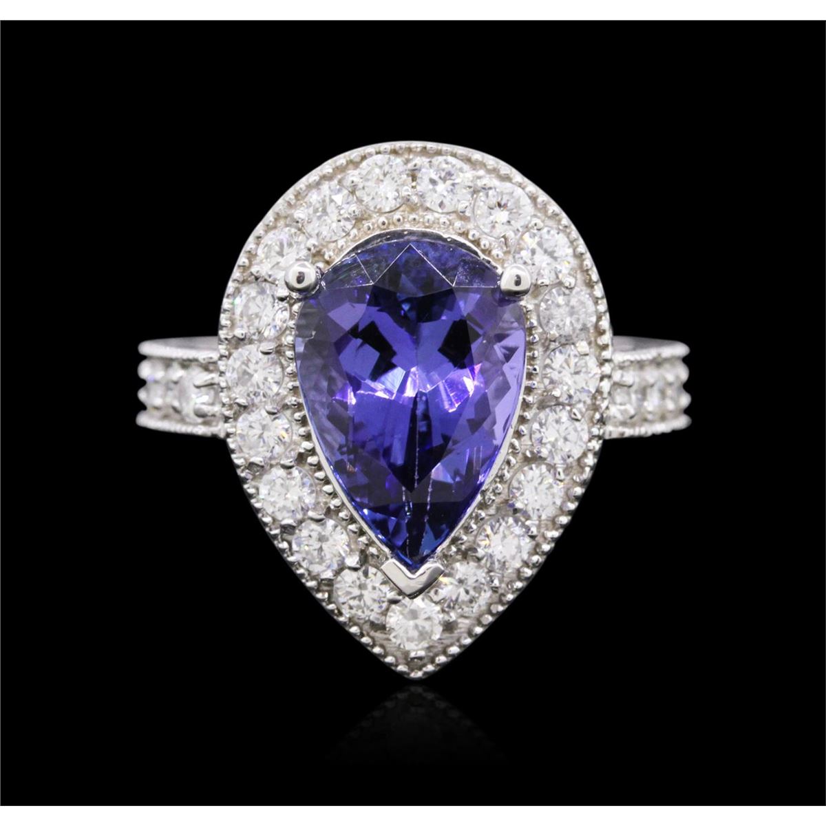 One electronically tested 14KT white gold ladies combination cast & assembled tanzanite and diamond ring with a flat shank with a bright polish finish. Identified with markings of "K14". Condition is new. Containing: One prong set pear modified brilliant cut natural tanzanite, measuring 12.00 x 8.71 x 4.71mm, approximate weight of 3.30ct., clarity is eye clean, type I, medium, moderately strong, violet color, (GIA V 5/4), cut is good. Twenty-Nine prong set round brilliant cut diamonds, measuring 2.00 - 2.00 x 1.20mm (depth est.) approximate total  weight of 29 Stones = 0.85ct. Clarity: SI-2. Color: I - J, Cut is Good. Colored gemstones are presumed to have been subjected to commonly used enhancement processes. All diamonds and colored gemstones are graded in the mounting, unless otherwise stated. Total Weight of Colored Stones 3.30ct. Total Weight of Diamonds 0.85ct. Total Weight of Ring 7.20 grams. GGL Appraised at $6,740.00.