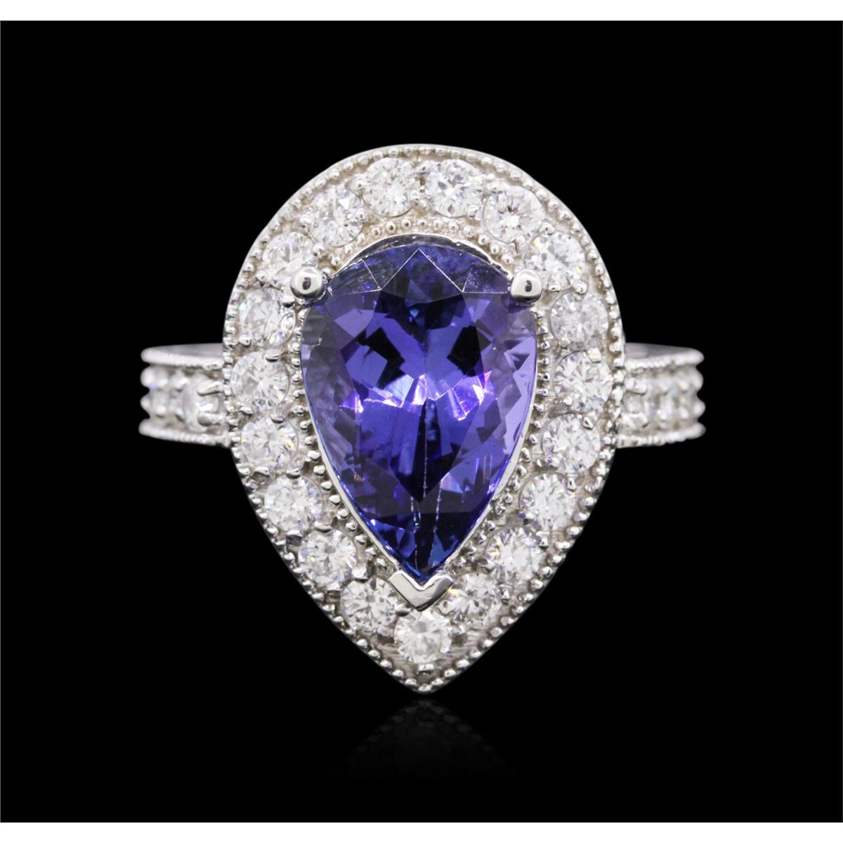 One electronically tested 14KT white gold ladies combination cast & assembled tanzanite and diamond ring with a flat shank with a bright polish finish. Identified with markings of "K14". Condition is new. Containing: One prong set pear modified brilliant cut natural tanzanite, measuring 12.00 x 8.71 x 4.71mm, approximate weight of 3.30ct., clarity is eye clean, type I, medium, moderately strong, violet color, (GIA V 5/4), cut is good. Twenty-Nine prong set round brilliant cut diamonds, measuring 2.00 - 2.00 x 1.20mm (depth est.) approximate total weight of 29 Stones = 0.85ct. Clarity: SI-2. Color: I - J, Cut is Good. Colored gemstones are presumed to have been subjected to commonly used enhancement processes. All diamonds and colored gemstones are graded in the mounting, unless otherwise stated. Total Weight of Colored Stones 3.30ct. Total Weight of Diamonds 0.85ct. Total Weight of Ring 7.20 grams. GGL Appraised at $6,740.00.