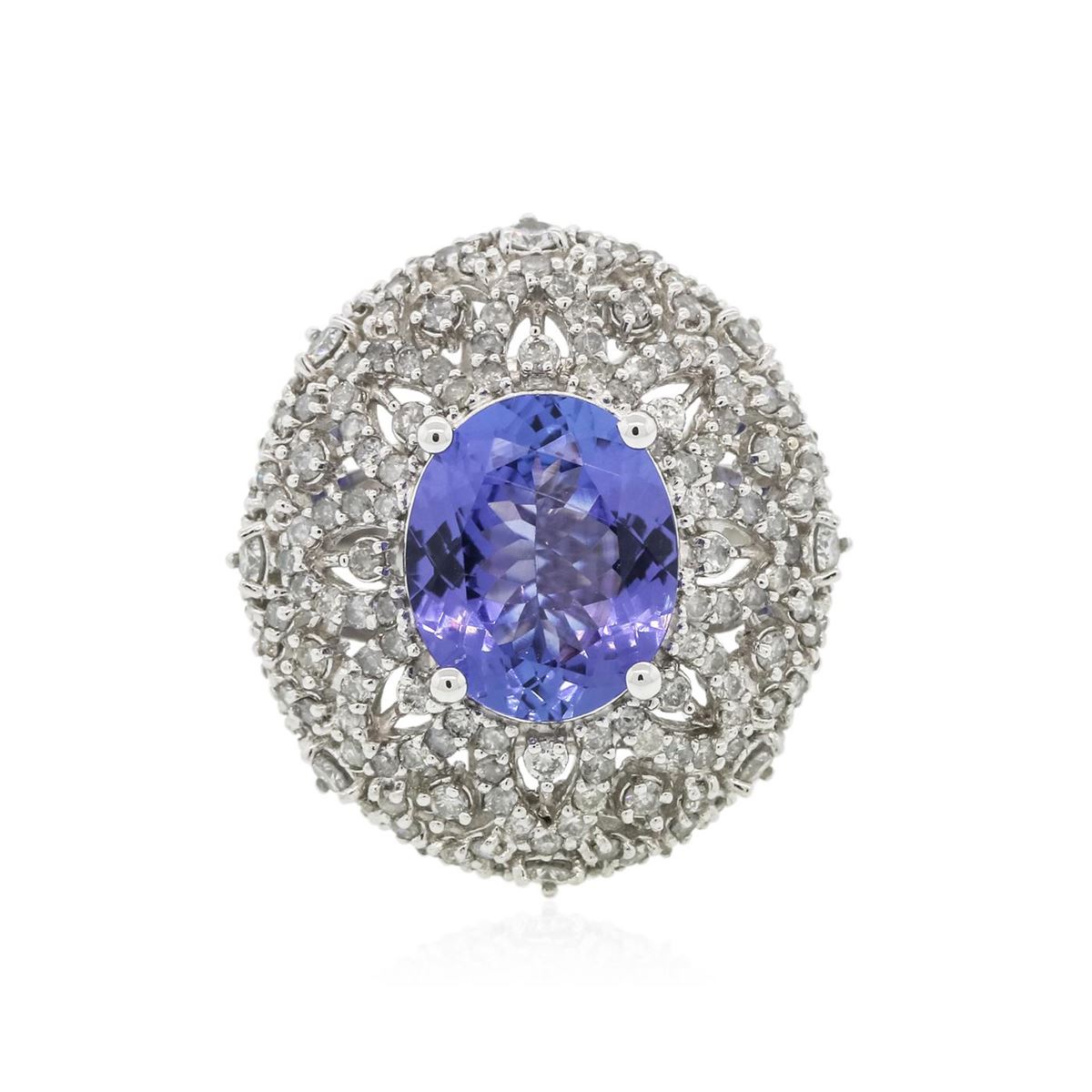 One electronically tested 14KT white gold Ladies combination cast & assembled ring with a bright polish finish. Condition is new. Identified with markings of "K14". Containing: One prong set oval modified brilliant cut natural tanzanite, measuring 11.30 x 9.40 x 4.63mm, approximate weight of 3.32ct., clarity is eye clean, type I, medium light, very slightly grayish, violet color, (GIA V 4/3), cut is good. Colored gemstones are presumed to have been subjected to commonly used color/clarity enhancement processes. One Hundred Sixty-Eight prong set round brilliant cut diamonds, measuring 1.30 - 1.30 x 0.78mm (depth est.) approximate. Total Weight of 168 Stones = 1.34ct. Clarity: I-1 to I-2. Color: I - J, Cut is Good. Eight prong set round brilliant cut diamonds, measuring 2.00 - 2.00 x 1.20mm (depth est.) approximate. Total Weight of 8 Stones = 0.23ct. Clarity: SI-2. Color: I - J, Cut is Good. Total Weight of Colored Stones 3.32ct. Total Weight of Diamonds 1.58ct. Total Weight of Ring 9.40 grams. GGL Appraised at $11,345.00.