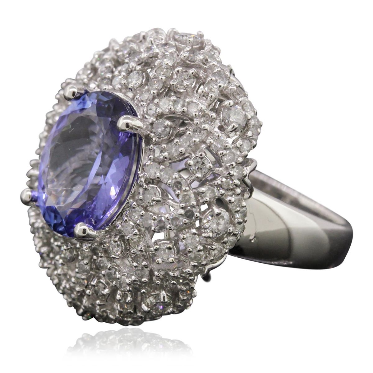 One electronically tested 14KT white gold Ladies combination cast & assembled ring with a bright polish finish. Condition is new. Identified with markings of "K14". Containing: One prong set oval modified brilliant cut natural tanzanite, measuring 11.30 x 9.40 x 4.63mm, approximate weight of 3.32ct., clarity is eye clean, type I, medium light, very slightly grayish, violet color, (GIA V 4/3), cut is good. Colored gemstones are presumed to have been subjected to commonly used color/clarity enhancement processes. One Hundred Sixty-Eight prong set round brilliant cut diamonds, measuring 1.30 - 1.30 x 0.78mm (depth est.) approximate. Total Weight of 168 Stones = 1.34ct. Clarity: I-1 to I-2. Color: I - J, Cut is Good. Eight prong set round brilliant cut diamonds, measuring 2.00 - 2.00 x 1.20mm (depth est.) approximate. Total Weight of 8 Stones = 0.23ct. Clarity: SI-2. Color: I - J, Cut is Good. Total Weight of Colored Stones 3.32ct. Total Weight of Diamonds 1.58ct. Total Weight of Ring 9.40 grams. GGL Appraised at $11,345.00.