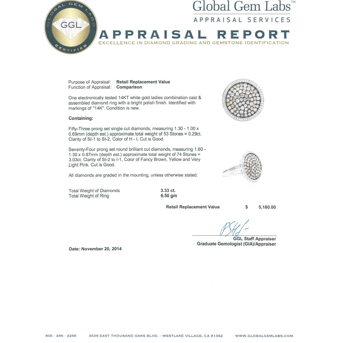 One electronically tested 14KT white gold ladies combination cast & assembled diamond ring with a bright polish finish. Identified with markings of "14K". Condition is new. Containing: Fifty-Three prong set single cut diamonds, measuring 1.30 - 1.00 x 0.69mm (depth est.) approximate total weight of 53 Stones = 0.29ct. Clarity: SI-1 to SI-2. Color: H - I, Cut is Good. Seventy-Four prong set round brilliant cut diamonds, measuring 1.60 - 1.30 x 0.87mm (depth est.) approximate total weight of 74 Stones = 3.03ct. Clarity: SI-2 to I-1, Cut is Good. All diamonds are graded in the mounting, unless otherwise stated. Total Weight of Diamonds 3.33ct. Total Weight of Ring 6.50 grams. GGL Appraised at $5,180.00.