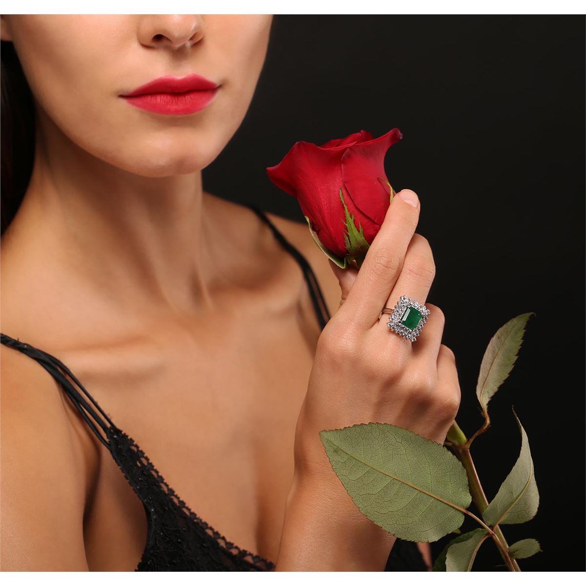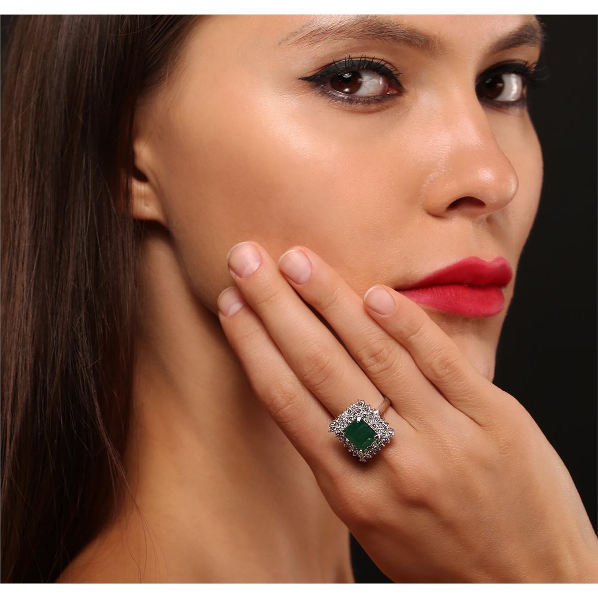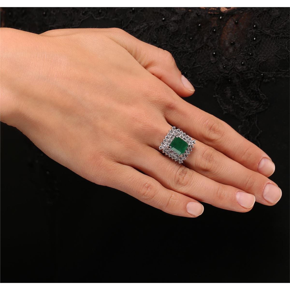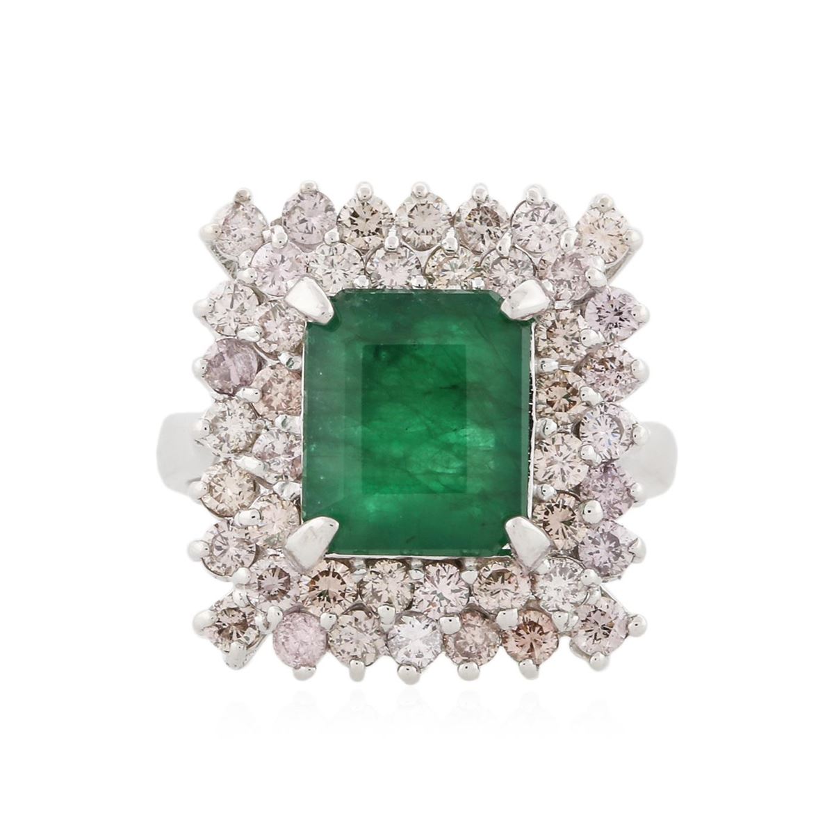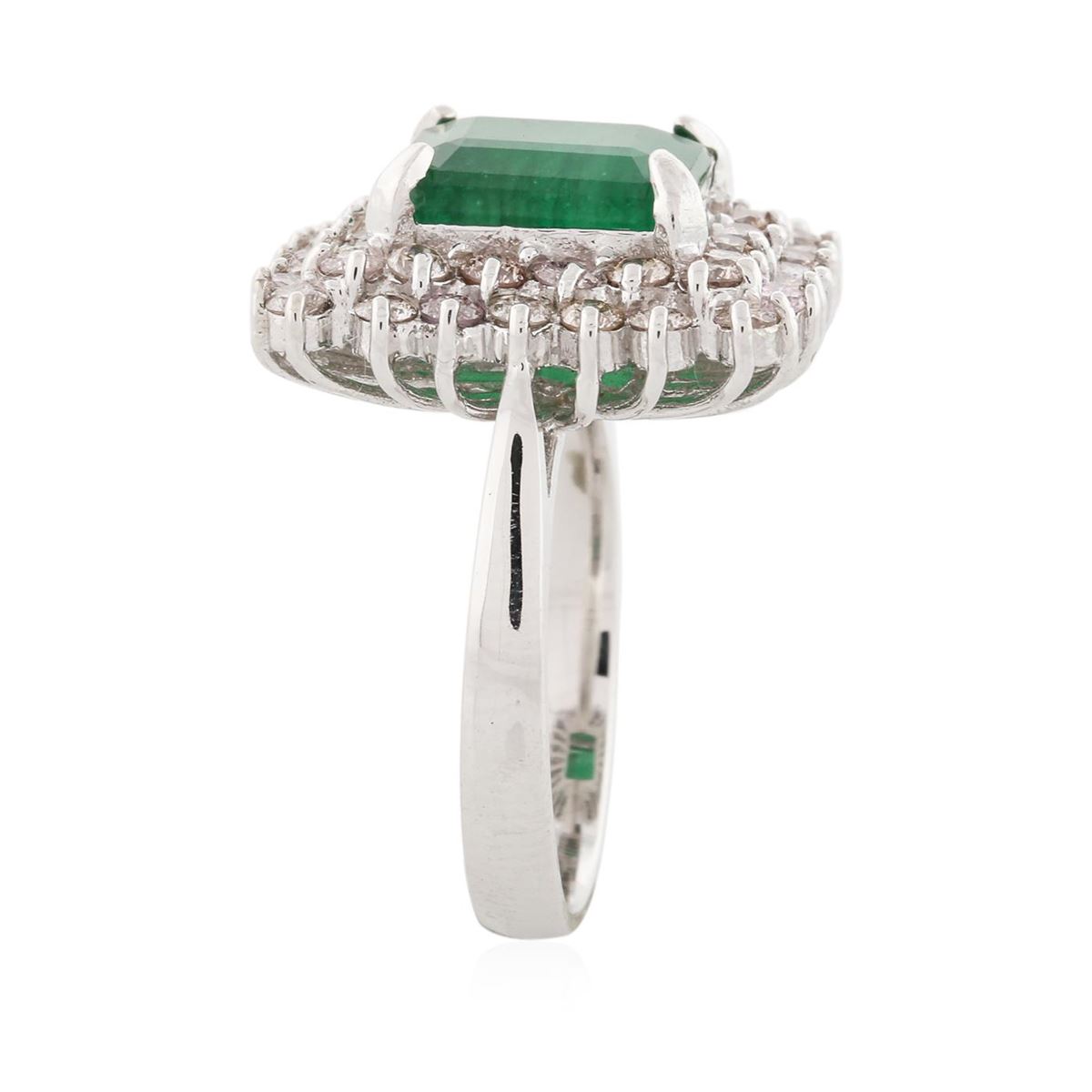 One electronically tested 14KT white gold ladies cast emerald and diamond ring with a bright polish finish. Condition is good. The featured emerald is set within a two tiered diamond lattice gallery, completed by a three millimeter wide band. Identified with markings of "K14". Containing: One prong set rectangular step cut natural emerald, measuring 9.80 x 8.25 x 4.80mm, approximate weight of 3.34ct., clarity is severely included, type III, medium dark, very slightly grayish, very slightly bluish green color, (GIA vslbG 6/3), cut is good. Transmitting light somewhat diffusely, translucent to opaque. Naturally occurring internal & external characteristics are present. Indications of oil residue. Graded in the setting. Forty-four prong set round brilliant cut diamonds, measuring 2.10 - 2.00 x 1.23mm (depth est.) approximate total weight of 44 Stones = 1.68ct. Graded in the setting. Clarity SI-1 to I-1. Color Very Light Brown. Total Weight of Colored Stones 3.34ct. Total Weight of Diamonds 1.68ct. Total Weight of Ring 7.80gm. AIG Appraised at $7,260.00.