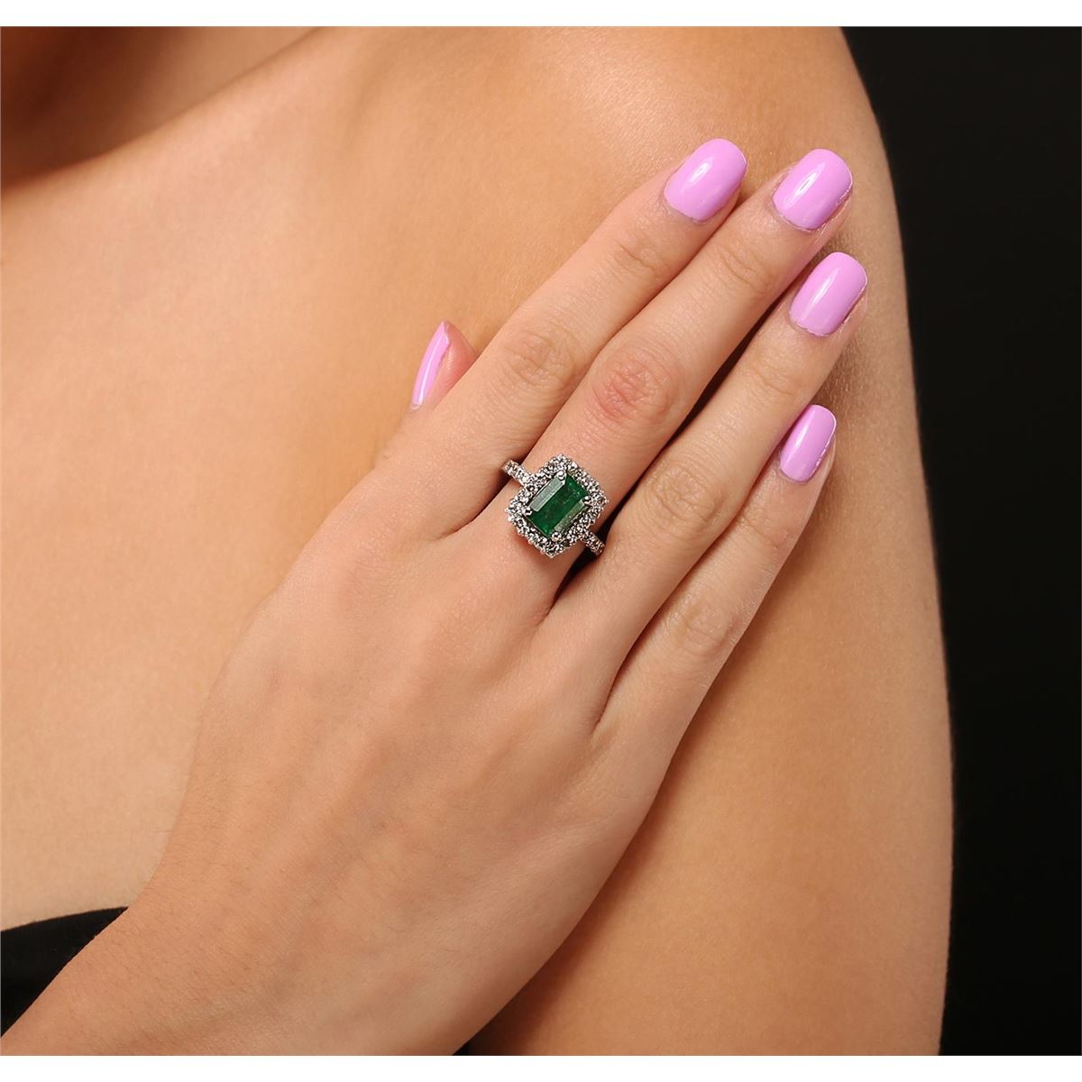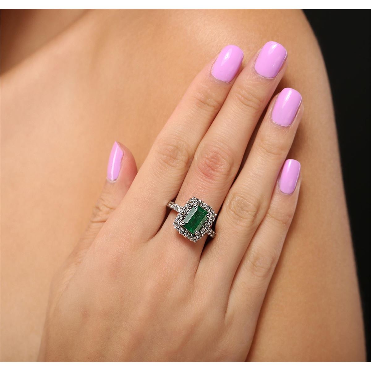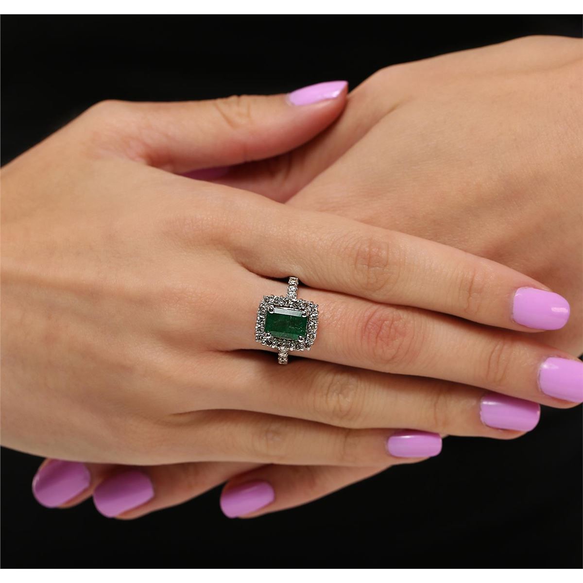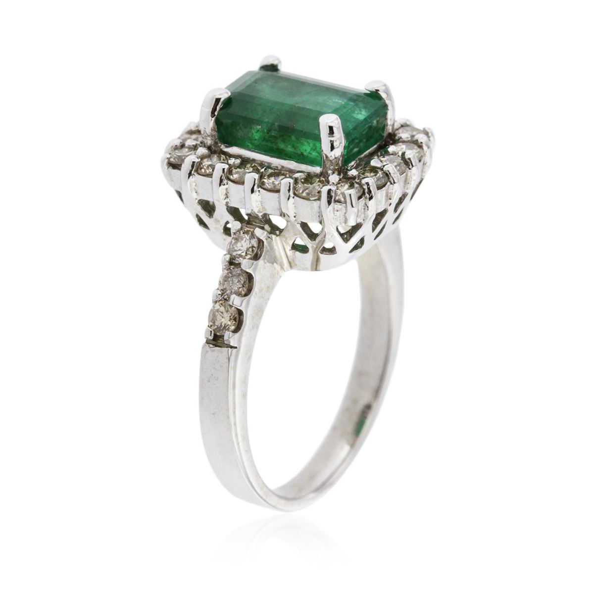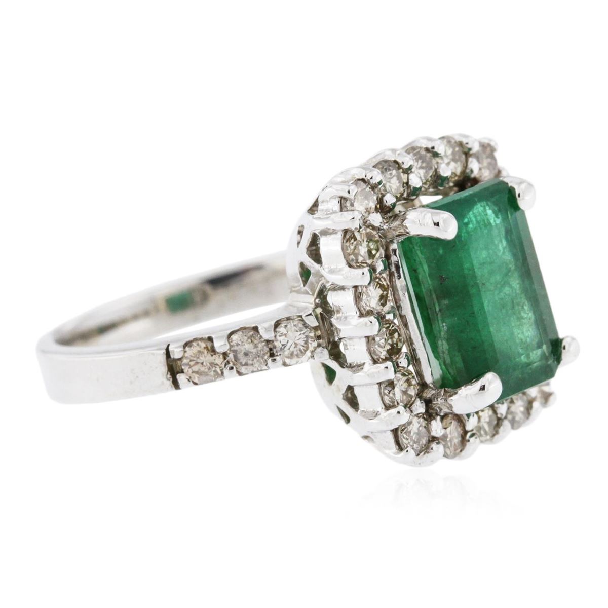 One electronically tested 14KT white gold ladies cast emerald and diamond ring with a bright polish finish. The featured emerald is set within a diamond bezel, supported by diamond set shoulders and completed by a two millimeter wide band. Identified with markings of "K14". Condition is new, good workmanship. Containing: One prong set rectangular step cut natural emerald, measuring 9.60 x 6.70 x 5.90mm, 8%. bulge factor, approximate weight of 3.34ct., clarity is heavily included, type III, medium, very slightly grayish, very slightly bluish green color, (GIA vslbG 5/3), cut is good. Transmitting light with a minimum of distortion, transparent to translucent. Naturally occurring internal & external characteristics are present. Indications of oil residue. Graded in the setting. Twenty-Four prong set round brilliant cut diamonds, measuring 2.00 - 1.80 x 1.14mm (depth est.) approximate. Total Weight of 24 Stones = 0.70ct. Graded in the setting. Clarity: SI-2 to I-1 . Color: H - J. Total Weight of Colored Stones 3.34ct. Total Weight of Diamonds 0.70ct. AIG Appraised at $8,040.00.