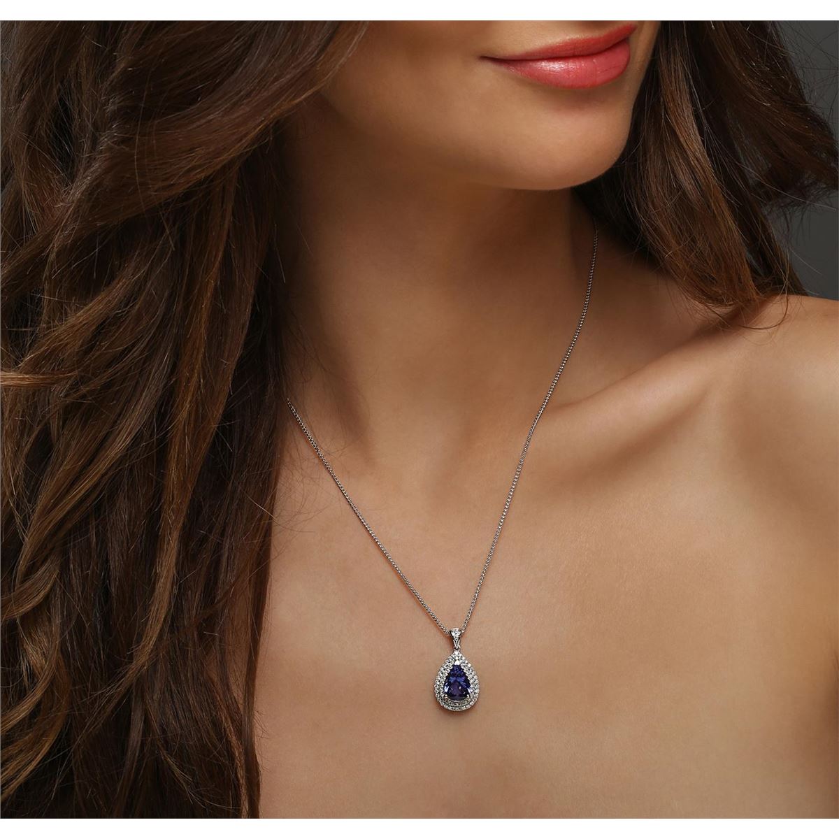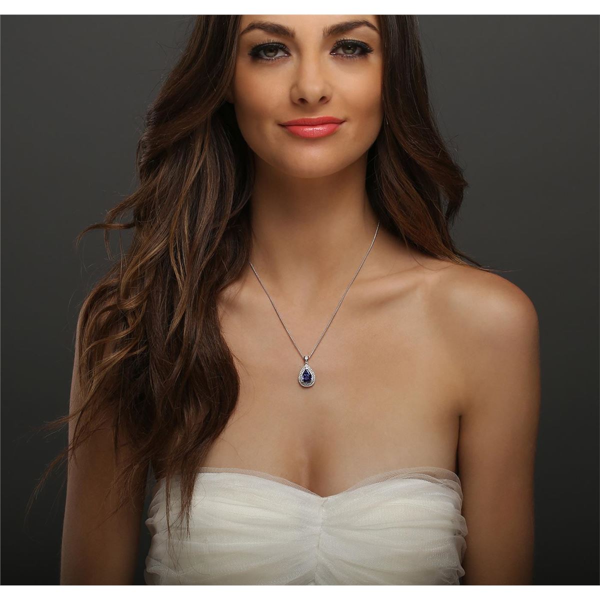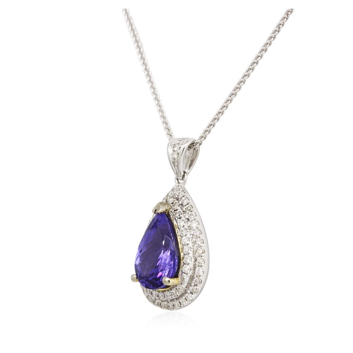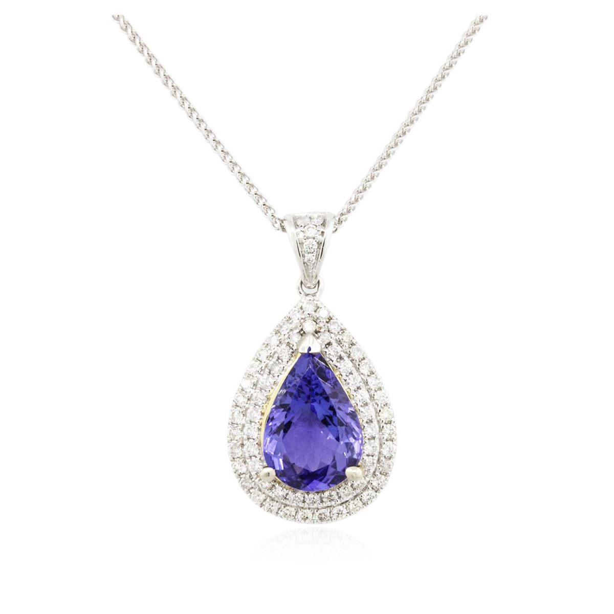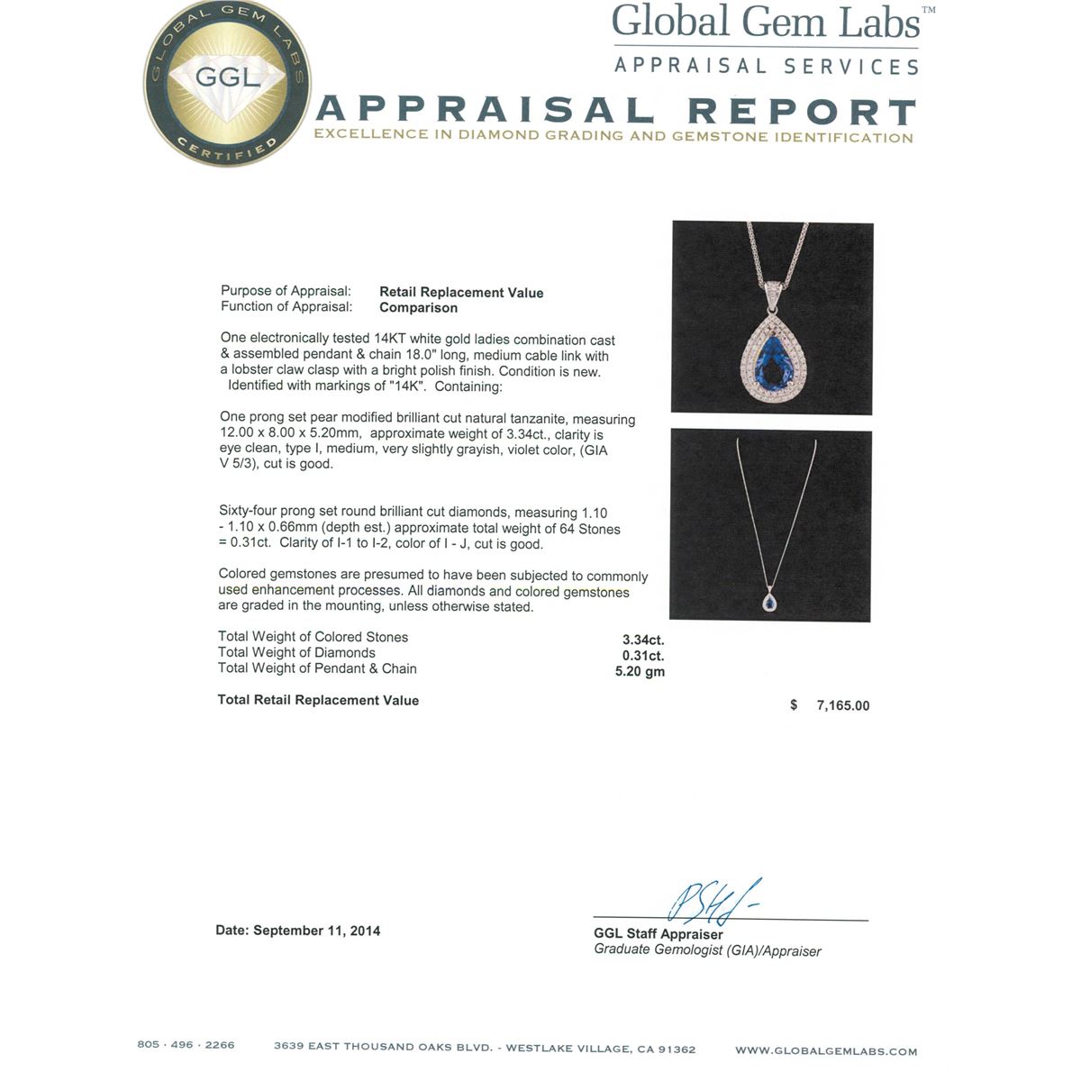 One electronically tested 14KT white gold ladies combination cast & assembled pendant & chain 18.0" long, medium cable link with a lobster claw clasp with a bright polish finish. Identified with markings of "14K". Condition is new. Containing: One prong set pear modified brilliant cut natural tanzanite, measuring 12.00 x 8.00 x 5.20mm, approximate weight of 3.34ct., clarity is eye clean, type I, medium, very slightly grayish, violet color, (GIA V 5/3), cut is good. Sixty-Four prong set round brilliant cut diamonds, measuring 1.10 - 1.10 x 0.66mm (depth est.) approximate total weight of 64 Stones = 0.31ct. . Clarity: I-1 to I-2. Color: I - J, Cut is Good. Colored gemstones are presumed to have been subjected to commonly used enhancement processes. All diamonds and colored gemstones are graded in the mounting, unless otherwise stated.. Total Weight of Colored Stones 3.34ct.. Total Weight of Diamonds 0.31ct.. Total Weight of Pendant & Chain 5.20 grams. GGL Appraised at $7,165.00.