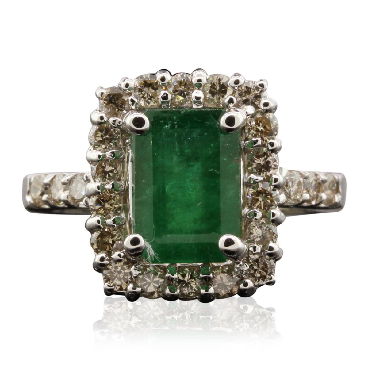 One electronically tested 14KT white gold ladies cast emerald and diamond ring with a bright polish finish. The featured emerald is set within a diamond bezel, supported by diamond set shoulders and completed by a two millimeter wide band. Identified with markings of "K14". Condition is new, good workmanship. Containing: One prong set rectangular step cut natural emerald, measuring 9.60 x 6.70 x 5.90mm, 8%. bulge factor, approximate weight of 3.34ct., clarity is heavily included, type III, medium, very slightly grayish, very slightly bluish green color, (GIA vslbG 5/3), cut is good. Transmitting light with a minimum of distortion, transparent to translucent. Naturally occurring internal & external characteristics are present. Indications of oil residue. Graded in the setting. Twenty-Four prong set round brilliant cut diamonds, measuring 2.00 - 1.80 x 1.14mm (depth est.) approximate. Total Weight of 24 Stones = 0.70ct. Graded in the setting. Clarity: SI-2 to I-1 . Color: H - J. Total Weight of Colored Stones 3.34ct. Total Weight of Diamonds 0.70ct. AIG Appraised at $8,040.00.