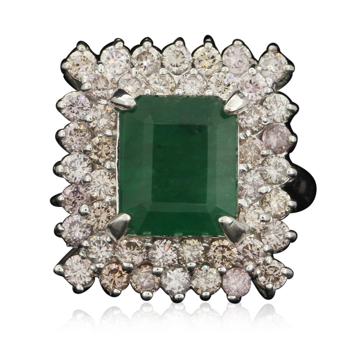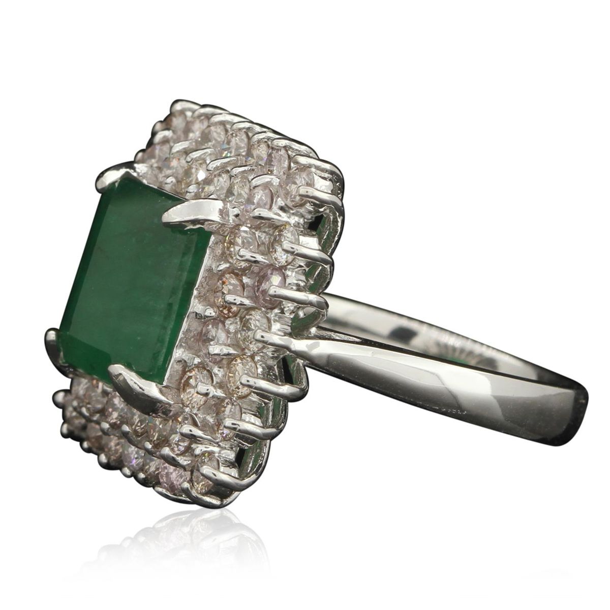 One electronically tested 14KT white gold ladies cast emerald and diamond ring with a bright polish finish. Condition is good. The featured emerald is set within a two tiered diamond lattice gallery, completed by a three millimeter wide band. Identified with markings of "K14". Containing: One prong set rectangular step cut natural emerald, measuring 9.80 x 8.25 x 4.80mm, approximate weight of 3.34ct., clarity is severely included, type III, medium dark, very slightly grayish, very slightly bluish green color, (GIA vslbG 6/3), cut is good. Transmitting light somewhat diffusely, translucent to opaque. Naturally occurring internal & external characteristics are present. Indications of oil residue. Graded in the setting. Forty-four prong set round brilliant cut diamonds, measuring 2.10 - 2.00 x 1.23mm (depth est.) approximate total weight of 44 Stones = 1.68ct. Graded in the setting. Clarity SI-1 to I-1. Color Very Light Brown. Total Weight of Colored Stones 3.34ct. Total Weight of Diamonds 1.68ct. Total Weight of Ring 7.80gm. AIG Appraised at $7,260.00.