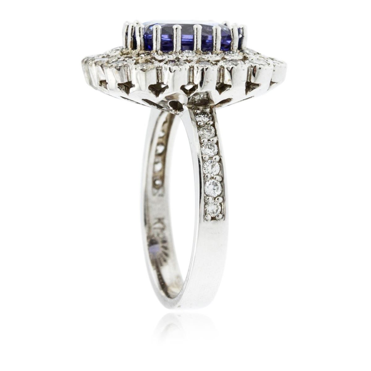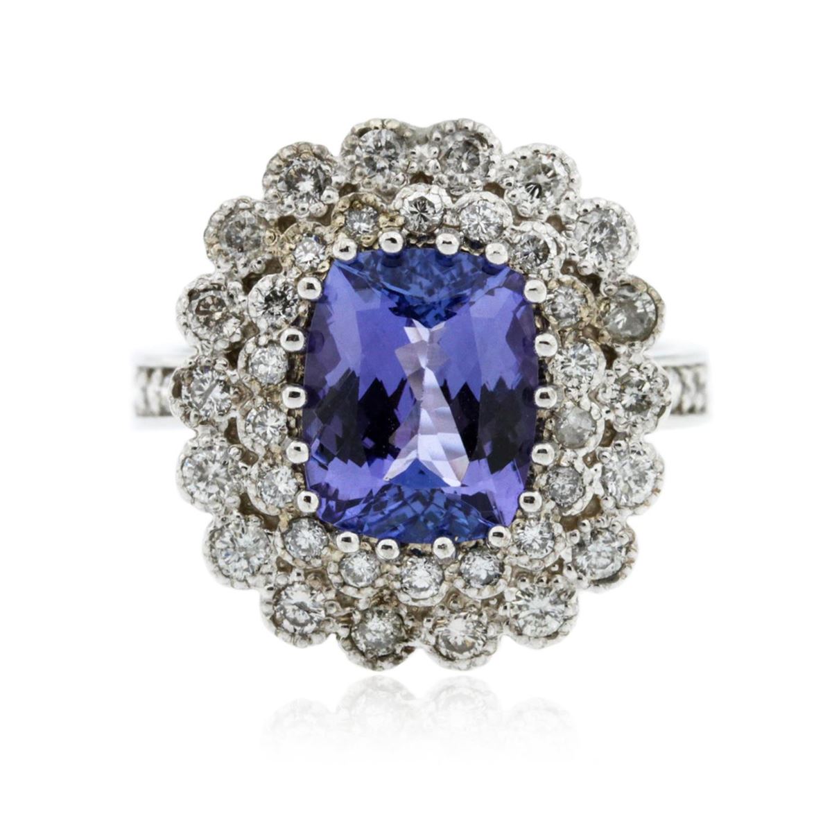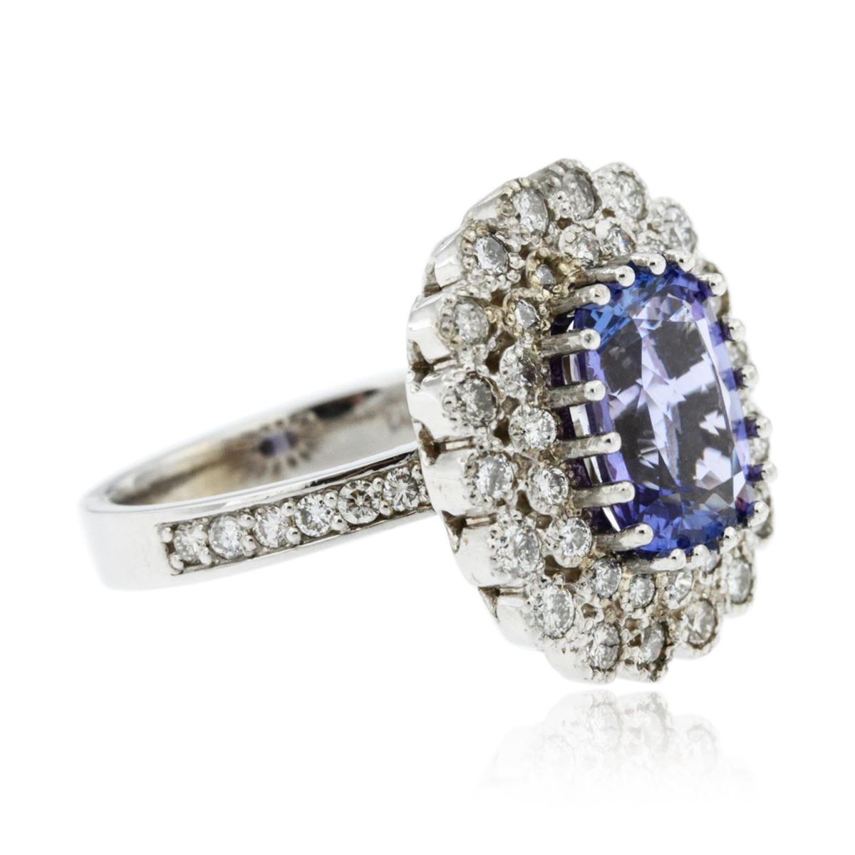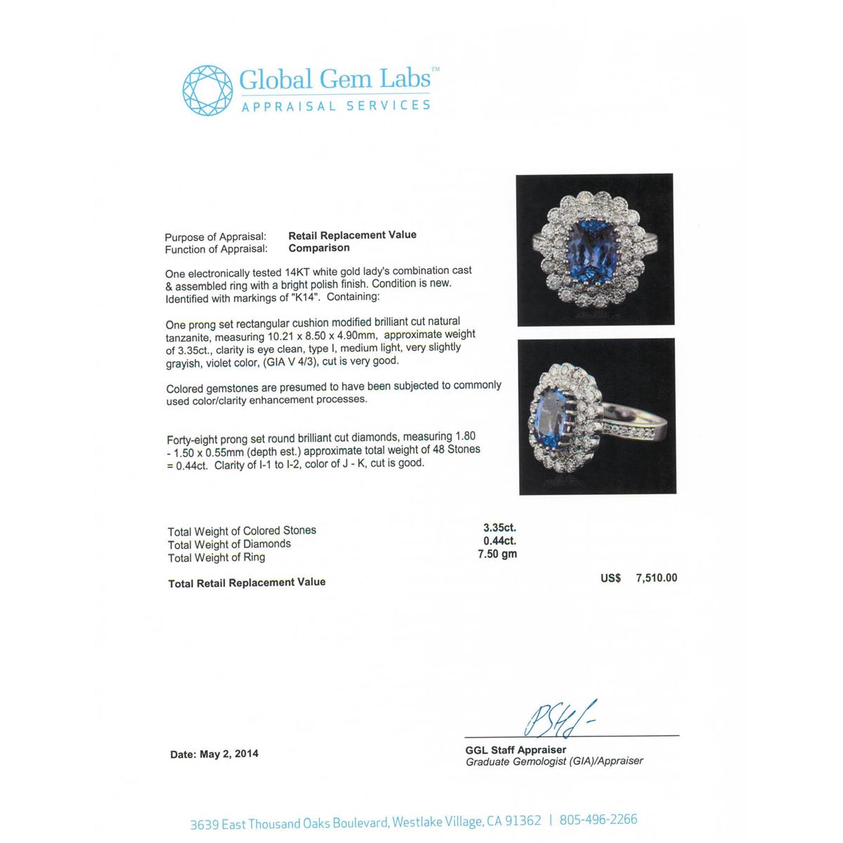One electronically tested 14KT white gold Ladies combination cast & assembled ring with a bright polish finish. Condition is new. Identified with markings of "K14". Containing: One prong set rectangular cushion modified brilliant cut natural tanzanite, measuring 10.21 x 8.50 x 4.90mm, approximate weight of 3.35ct., clarity is eye clean, type I, medium light, very slightly grayish, violet color, (GIA V 4/3), cut is very good. Colored gemstones are presumed to have been subjected to commonly used color/clarity enhancement processes. Forty-Eight prong set round brilliant cut diamonds, measuring 1.80 - 1.50 x 0.55mm (depth est.) approximate. Total Weight of 48 Stones = 0.44ct. Clarity: I-1 to I-2. Color: J - K, Cut is Good. Total Weight of Colored Stones 3.35ct. Total Weight of Diamonds 0.44ct. Total Weight of Ring 7.50 grams. GGL Appraised at $7,510.00.