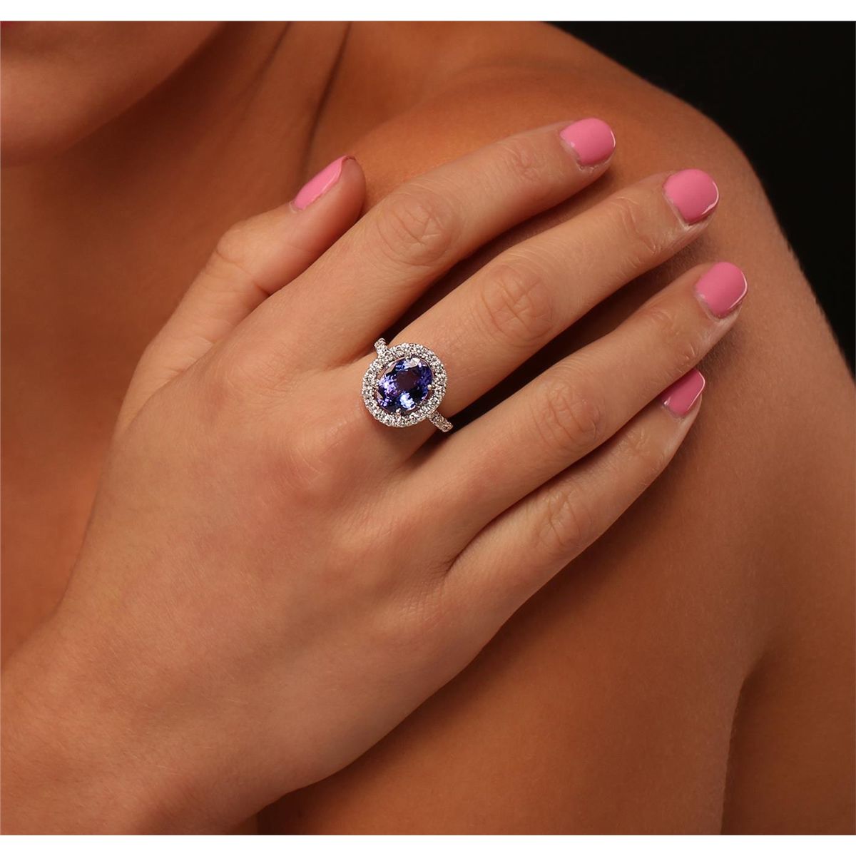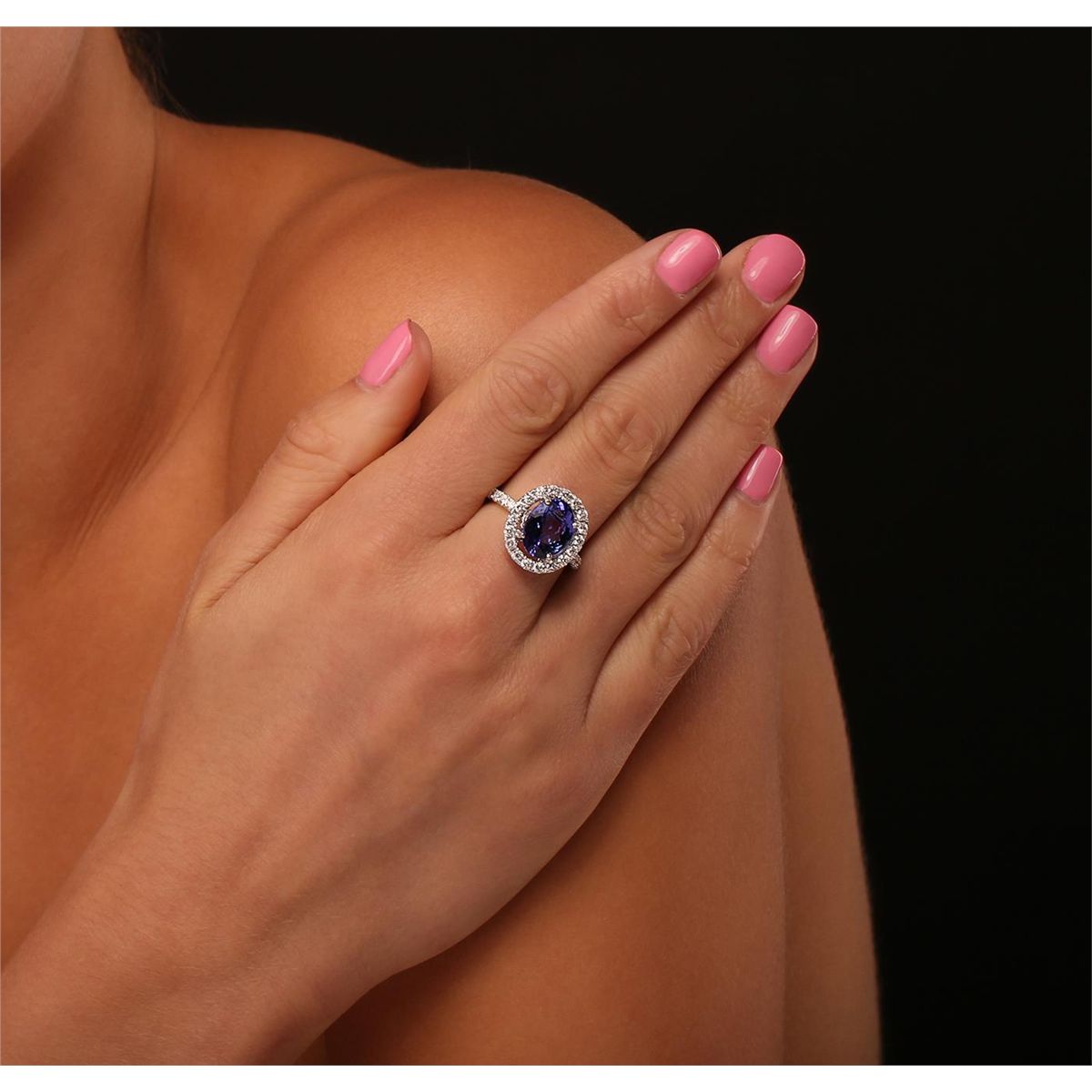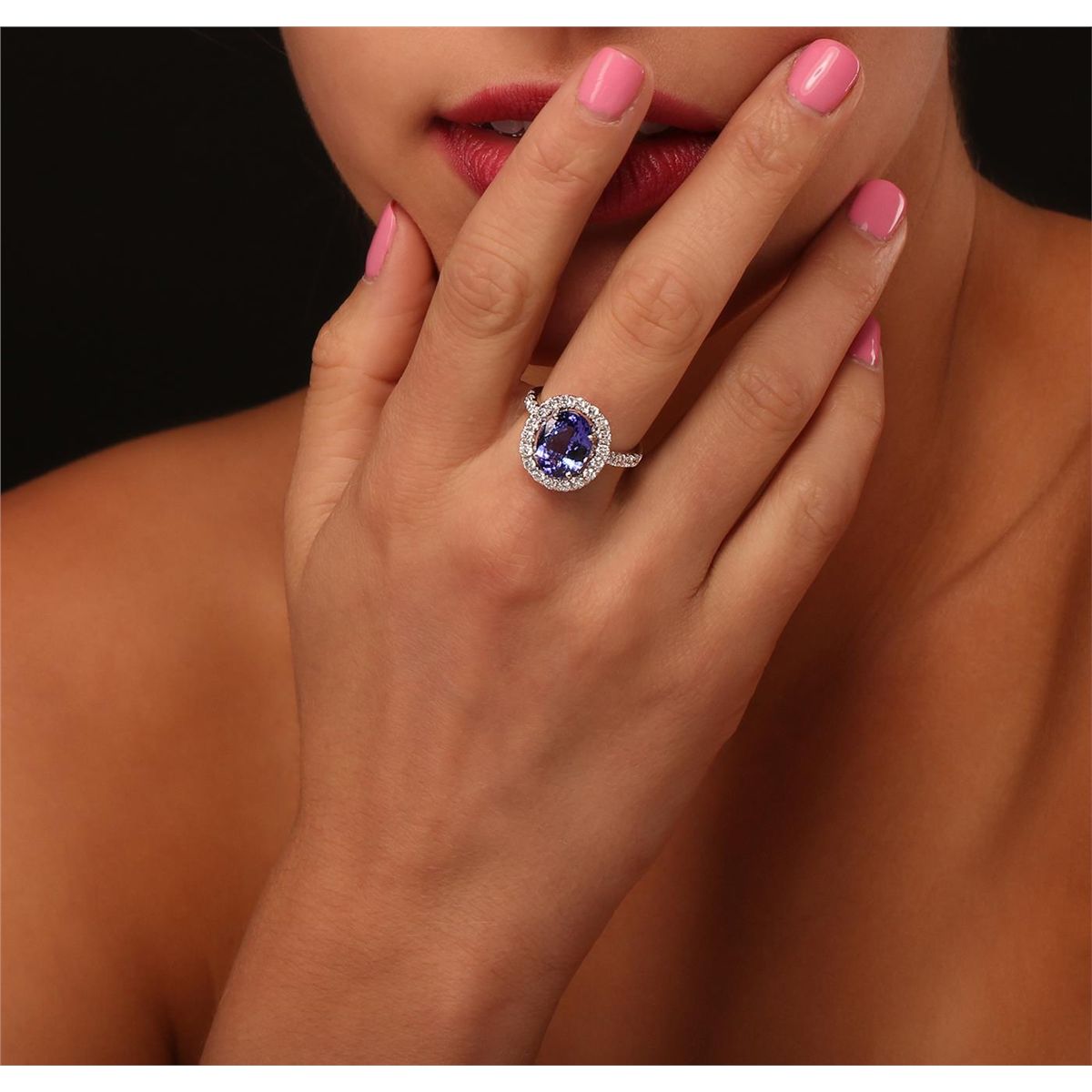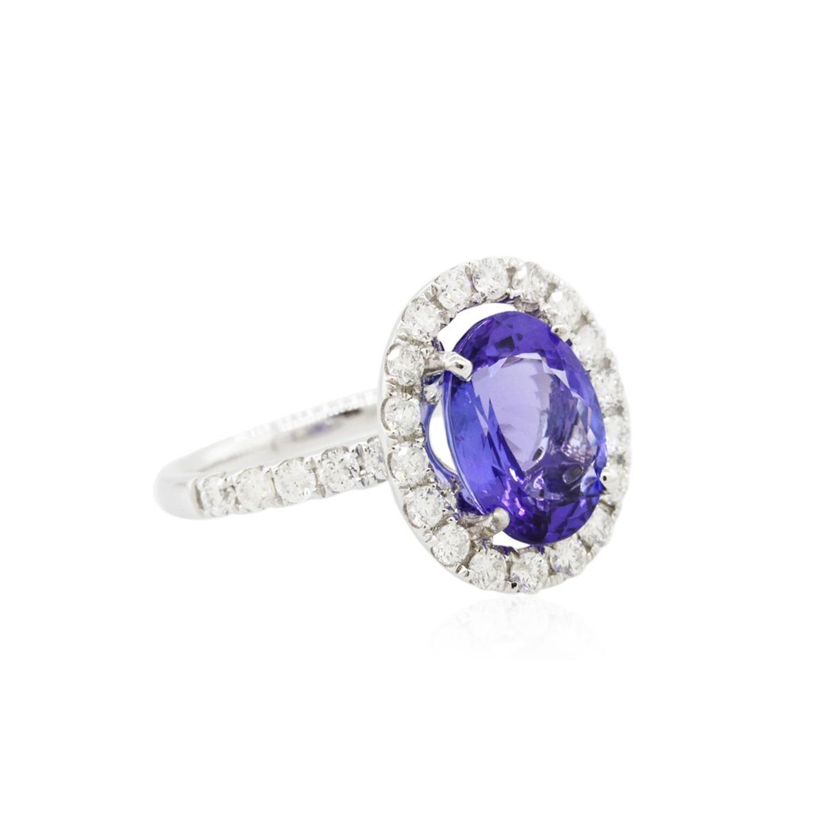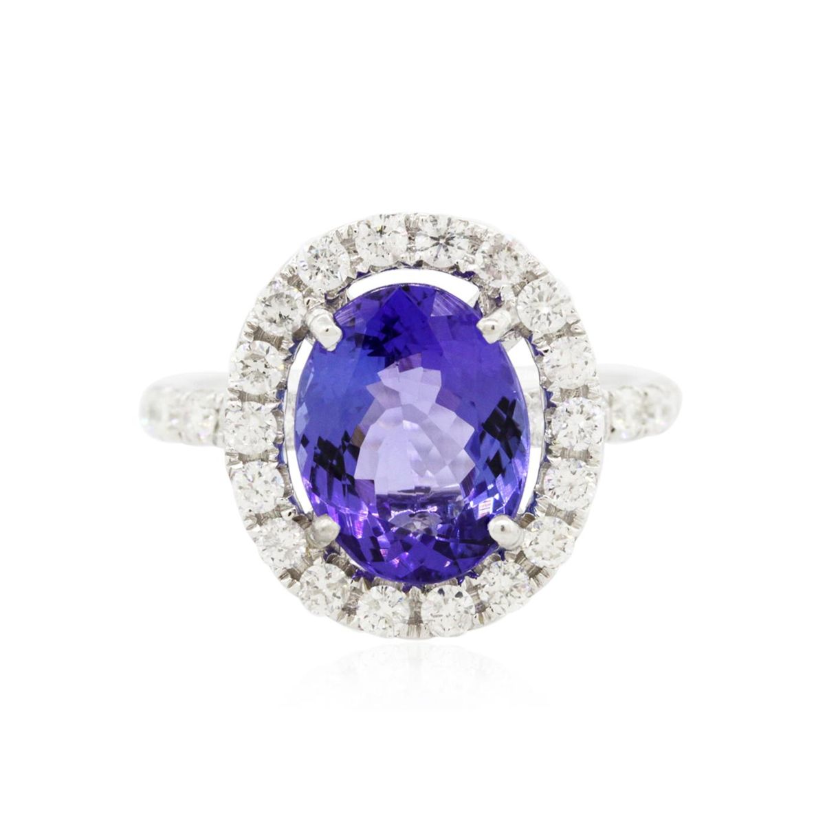 One electronically tested 14KT white gold Ladies combination cast & assembled ring with a bright polish finish. Condition is new. Identified with markings of "14K". Containing: One prong set oval modified brilliant cut natural tanzanite, measuring 11.50 x 8.50 x 5.00mm, approximate weight of 3.35ct., clarity is eye clean, type I, medium, moderately strong, bluish violet color, (GIA bV 5/4), cut is good. Colored gemstones are presumed to have been subjected to commonly used color/clarity enhancement processes. Thirty-Five prong set round brilliant cut diamonds, measuring 2.00 - 2.00 x 1.20mm (depth est.) approximate. Total Weight of 35 Stones = 1.02ct. Clarity: I-1 to I-2. Color: H - I, Cut is Good. Total Weight of Colored Stones 3.35ct. Total Weight of Diamonds 1.02ct. Total Weight of Ring 4.70 grams. GGL Appraised at $8,155.00.