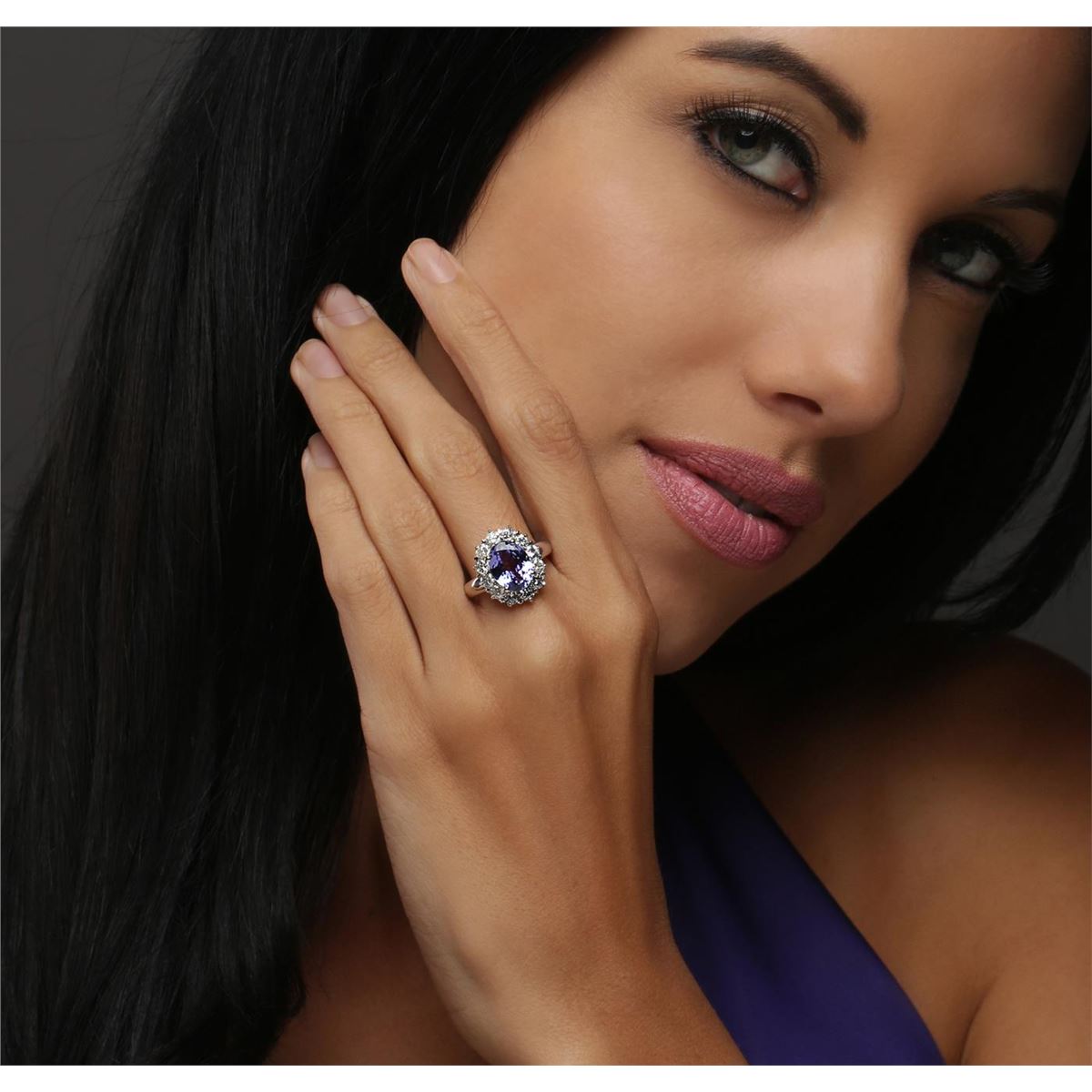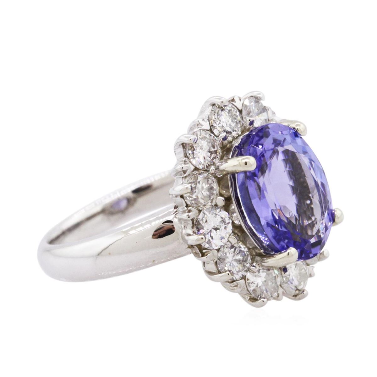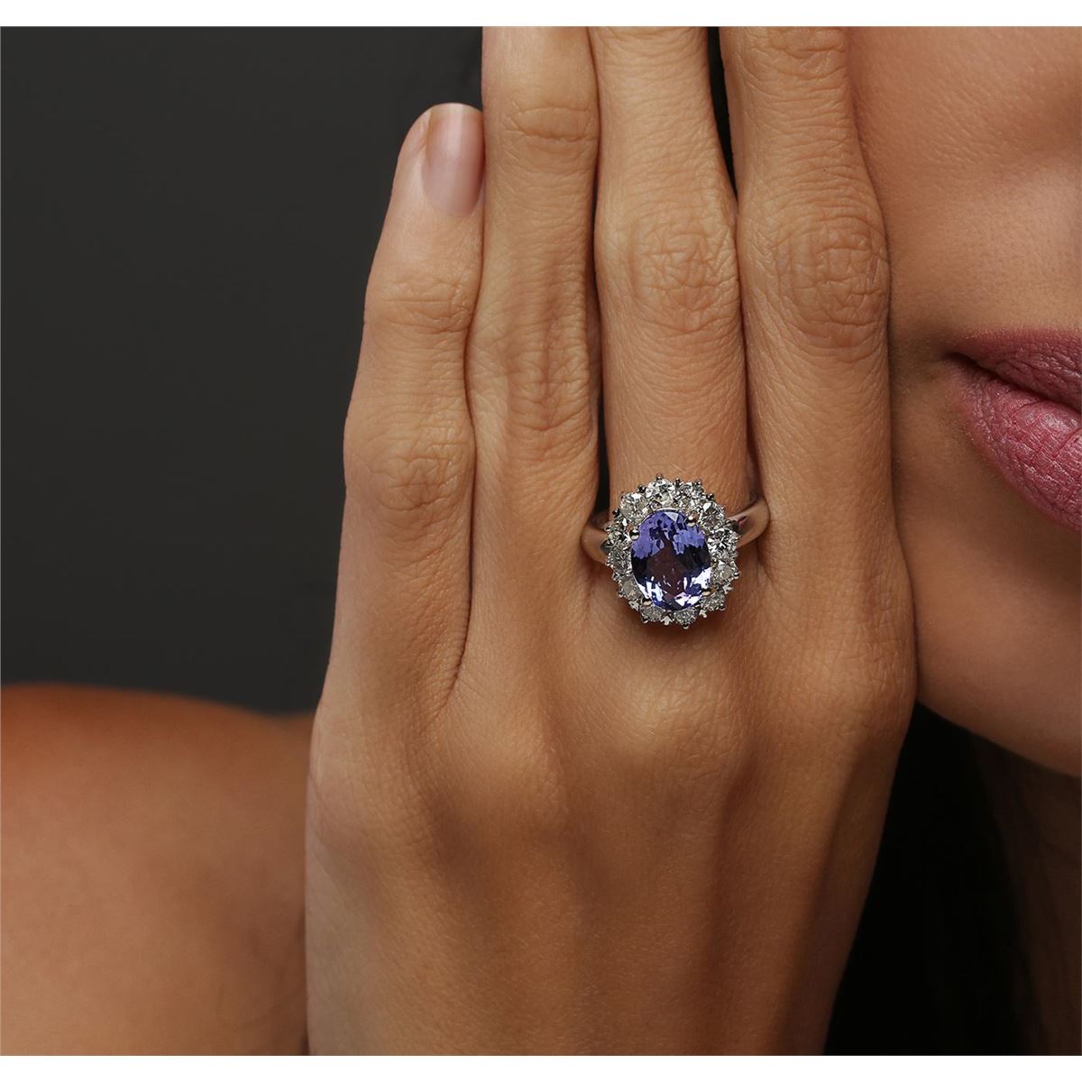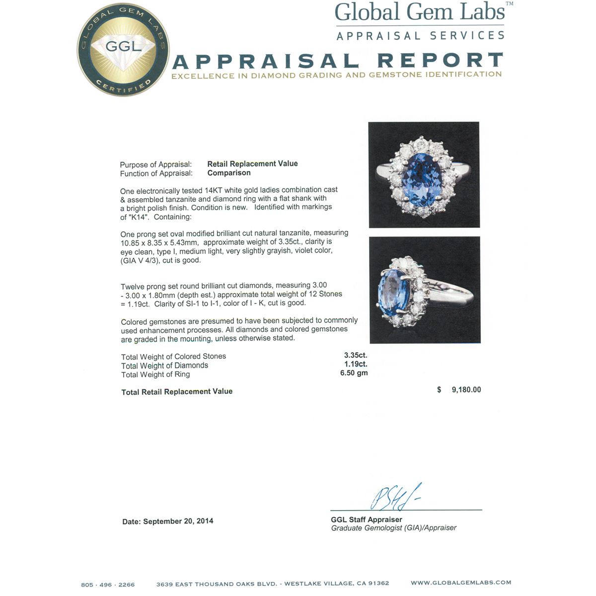 One electronically tested 14KT white gold ladies combination cast & assembled tanzanite and diamond ring with a flat shank with a bright polish finish. Identified with markings of "K14". Condition is new. Containing: One prong set oval modified brilliant cut natural tanzanite, measuring 10.85 x 8.35 x 5.43mm, approximate weight of 3.35ct., clarity is eye clean, type I, medium light, very slightly grayish, violet color, (GIA V 4/3), cut is good. Twelve prong set round brilliant cut diamonds, measuring 3.00 - 3.00 x 1.80mm (depth est.) approximate total weight of 12 Stones = 1.19ct. Clarity: SI-1 to I-1. Color: I - K, Cut is Good. Colored gemstones are presumed to have been subjected to commonly used enhancement processes. All diamonds and colored gemstones are graded in the mounting, unless otherwise stated. Total Weight of Colored Stones 3.35ct. Total Weight of Diamonds 1.19ct. Total Weight of Ring 6.50 grams. GGL Appraised at $9,180.00.