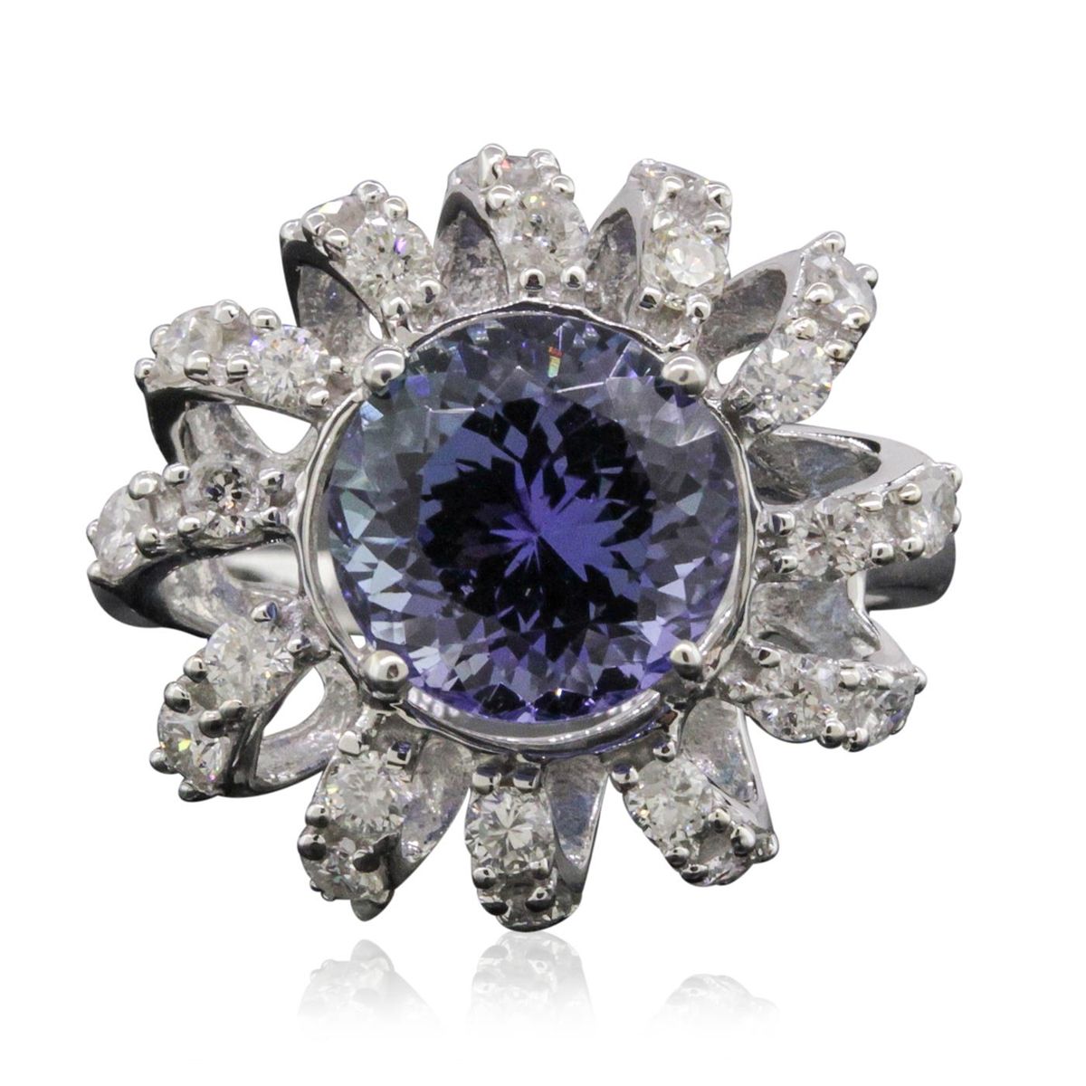 One electronically tested 14KT white gold ladies combination cast & assembled tanzanite and diamond ring with a flat shank with a bright polish finish. Identified with markings of "14K". Condition is new. Containing: One prong set round modified brilliant cut natural tanzanite, measuring 9.17 - 9.16 x 5.96 mm, approximate weight of 3.36ct., clarity is eye clean, type I, medium, very slightly grayish, violet color, (GIA V 5/3), cut is good. Twenty-Four prong set round brilliant cut diamonds, measuring 1.90 - 1.80 x 1.11mm (depth est.) approximate total weight of 24 Stones = 0.55ct. Clarity: SI-1 to I-1. Color: I - J, Cut is Good. Colored gemstones are presumed to have been subjected to commonly used enhancement processes. All diamonds and colored gemstones are graded in the mounting, unless otherwise stated. Total Weight of Colored Stones 3.36ct. Total Weight of Diamonds 0.55ct. Total Weight of Ring 4.70 grams. GGL Appraised at $7,970.00.