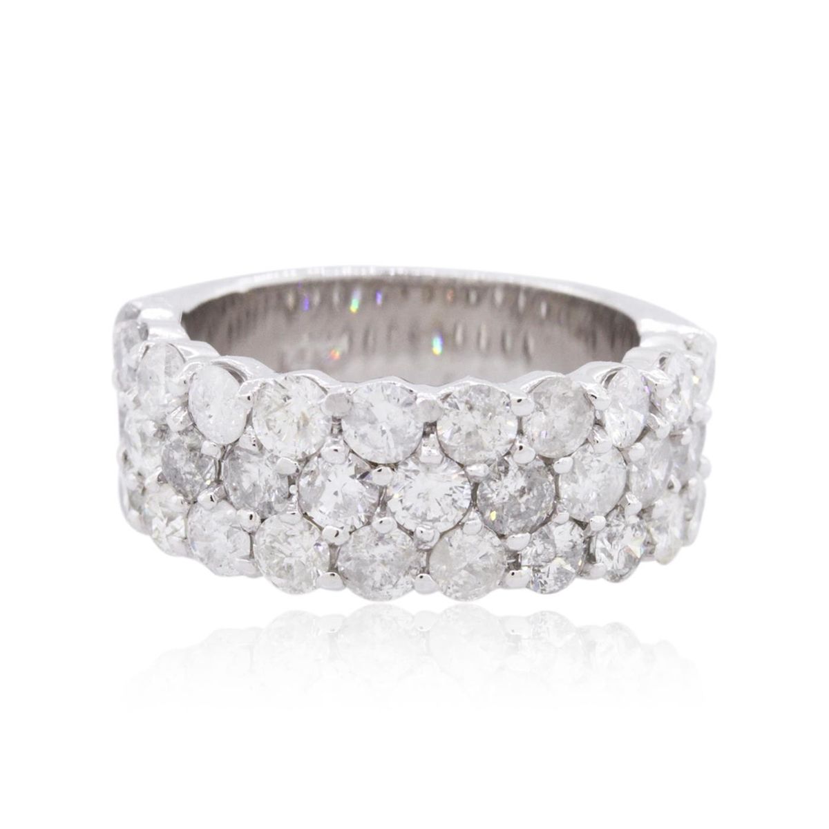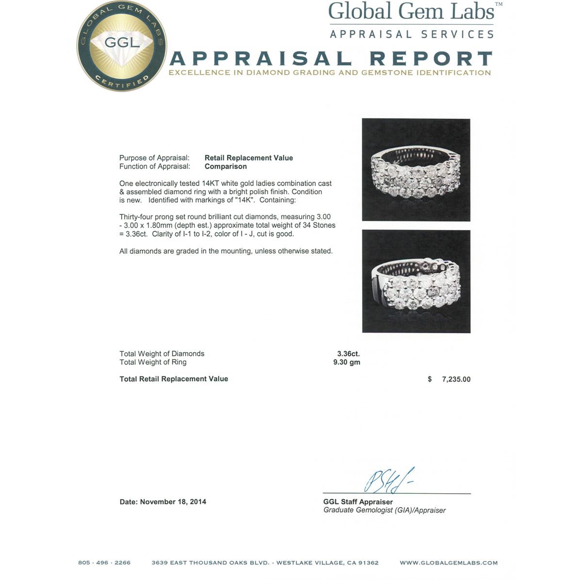 One electronically tested 14KT white gold ladies combination cast & assembled diamond ring with a bright polish finish. Identified with markings of "14K". Condition is new. Containing: Thirty-Four prong set round brilliant cut diamonds, measuring 3.00 - 3.00 x 1.80mm (depth est.) approximate total weight of 34 Stones = 3.36ct. Clarity: I-1 to I-2. Color: I - J, Cut is Good. All diamonds are graded in the mounting, unless otherwise stated. Total Weight of Diamonds 3.36ct. Total Weight of Ring 9.30 grams. GGL Appraised at $7,235.00.