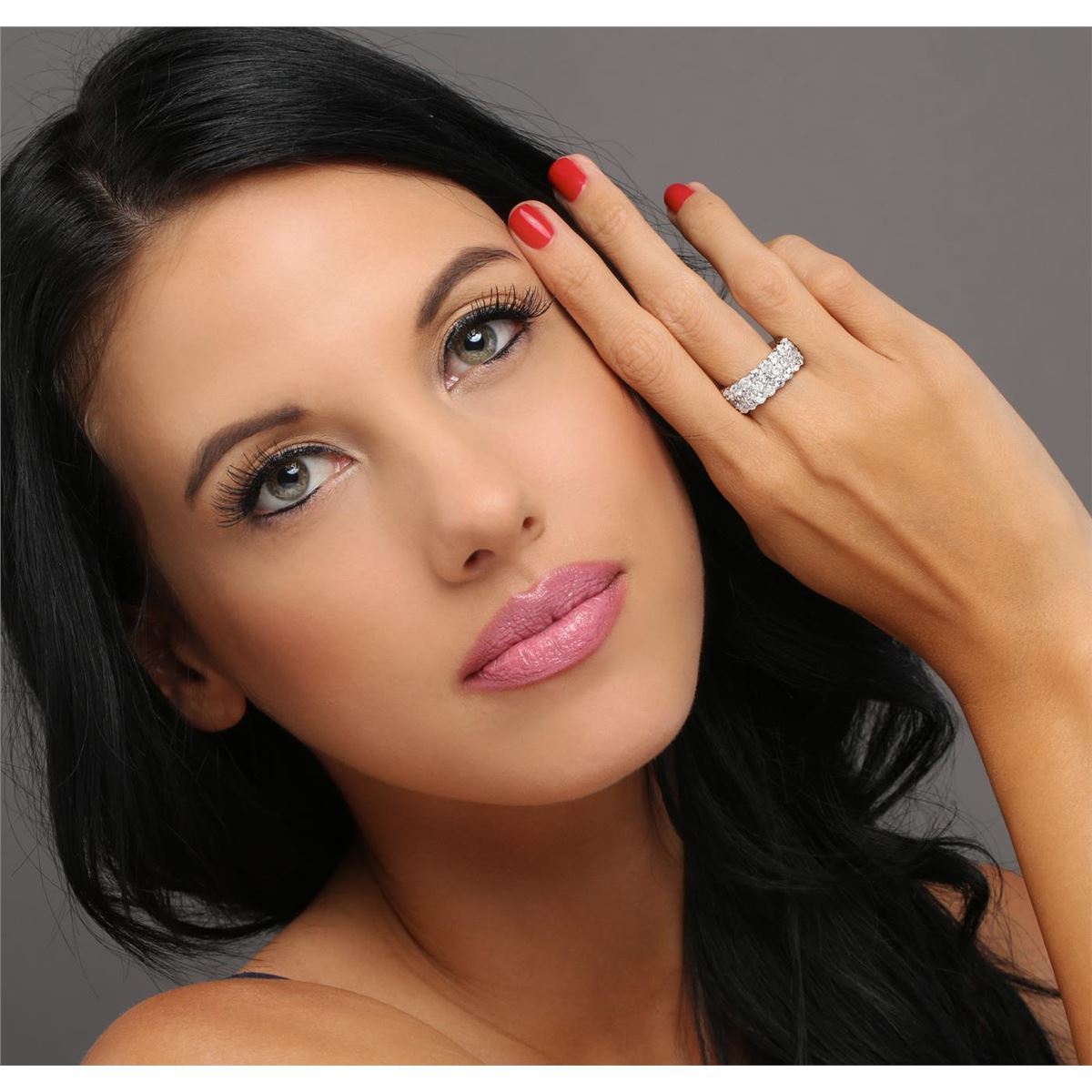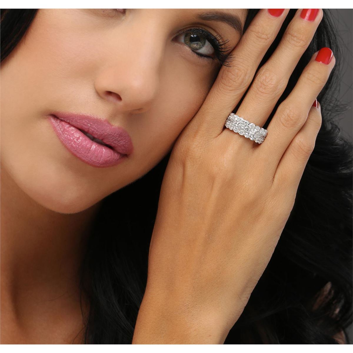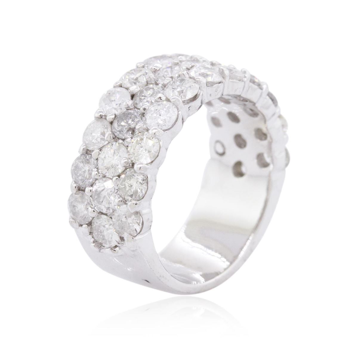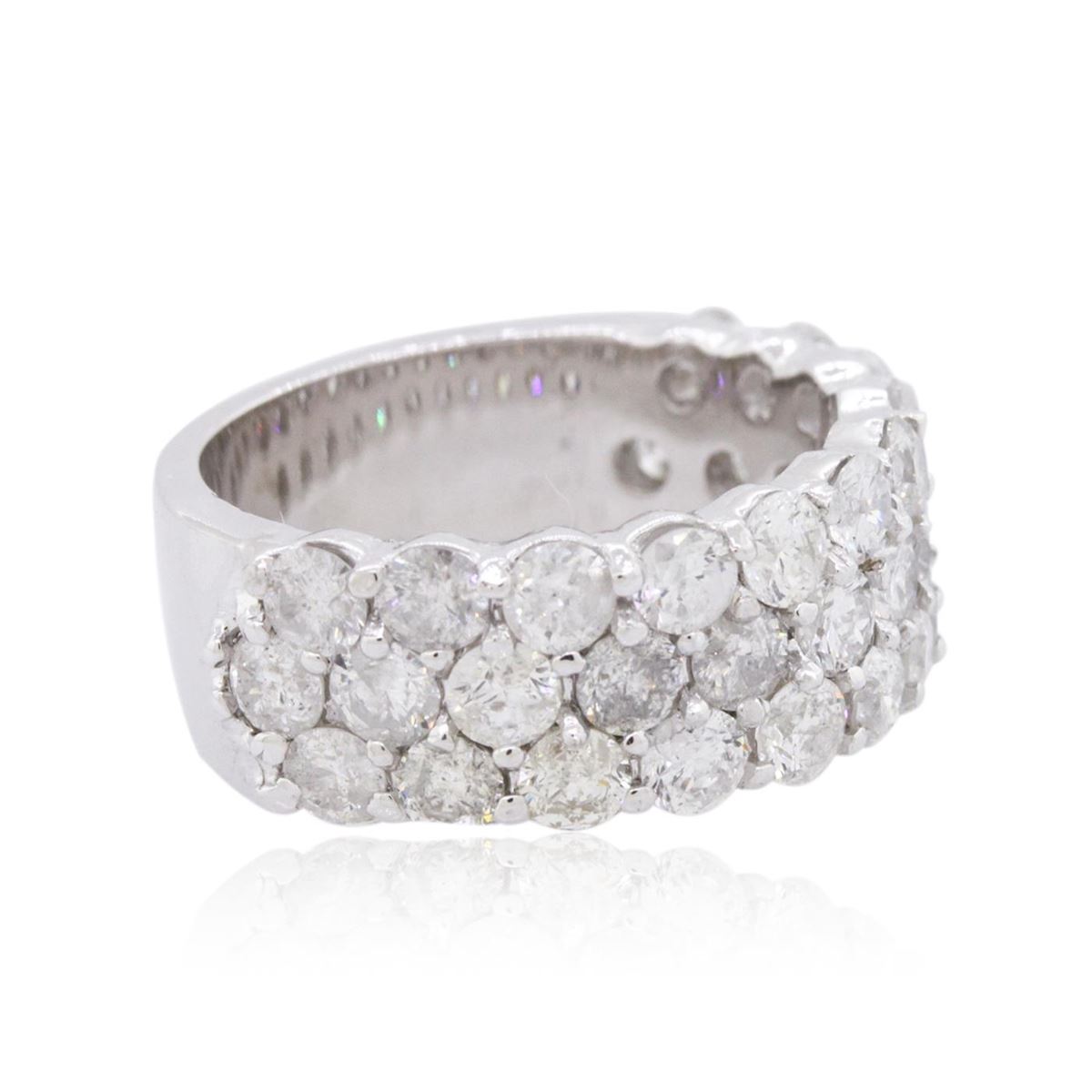 One electronically tested 14KT white gold ladies combination cast & assembled diamond ring with a bright polish finish. Identified with markings of "14K". Condition is new. Containing: Thirty-Four prong set round brilliant cut diamonds, measuring 3.00 - 3.00 x 1.80mm (depth est.) approximate total weight of 34 Stones = 3.36ct. Clarity: I-1 to I-2. Color: I - J, Cut is Good. All diamonds are graded in the mounting, unless otherwise stated. Total Weight of Diamonds 3.36ct. Total Weight of Ring 9.30 grams. GGL Appraised at $7,235.00.