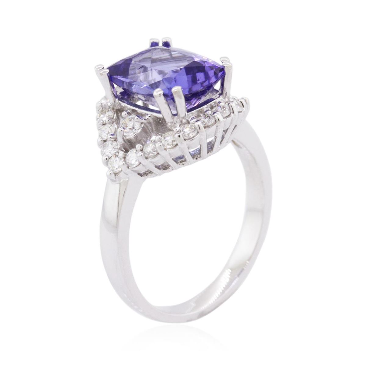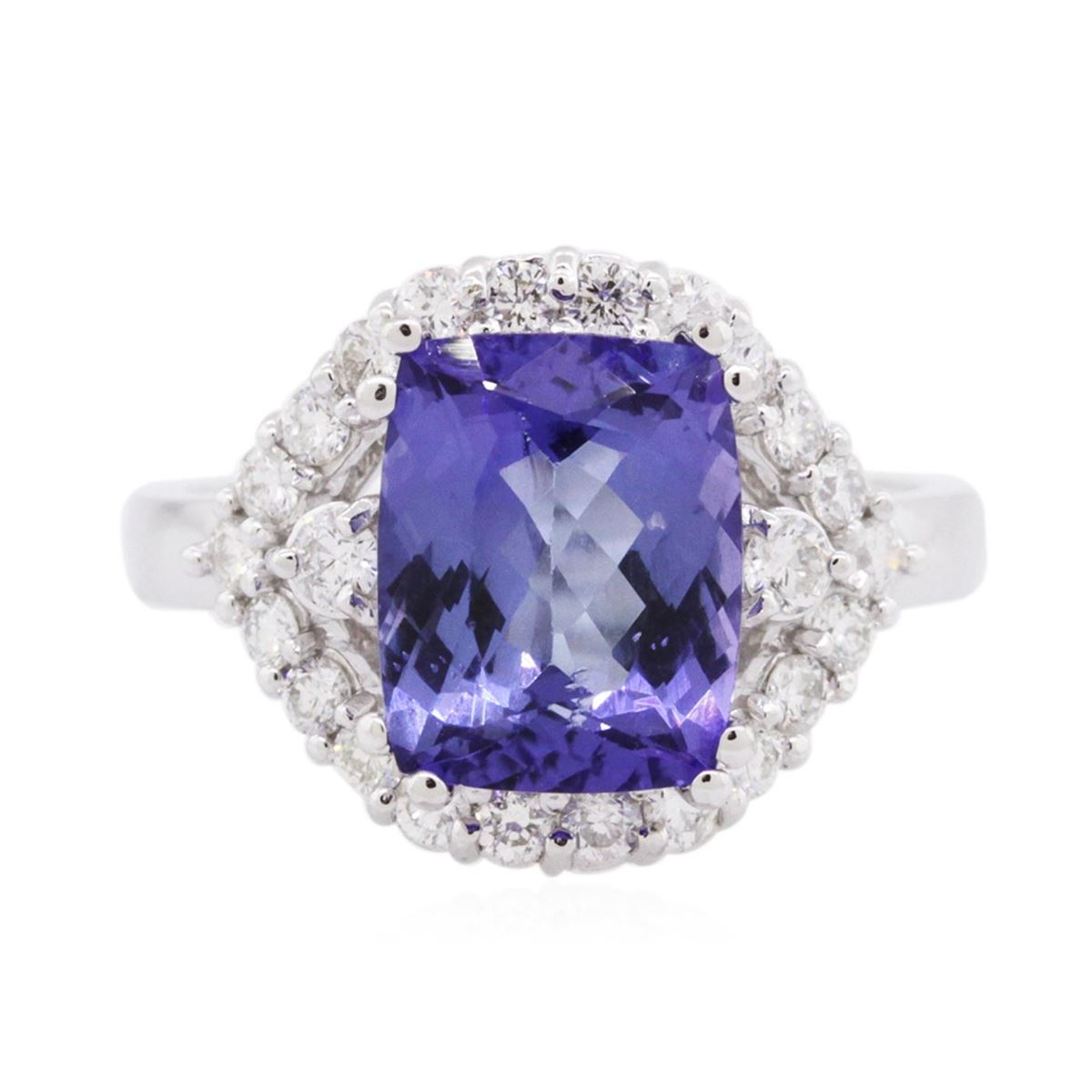 One electronically tested 14KT white gold ladies cast tanzanite & diamond ring with a bright finish. The featured tanzanite is set within a diamond bezel, supported by a ribbed under gallery, completed by a two and one half millimeter wide band. Identified with markings of "K14". Condition is new, good workmanship. Containing: One prong set rectangular cushion brilliant cut natural tanzanite, measuring 10.00 x 8.00 x 5.15mm, 4% bulge factor, approximate weight of 3.37ct., clarity is slightly included, type I, medium dark, slightly grayish, bluish violet color, (GIA bV 6/2), cut is good. Transmitting light with no distortion, transparent. Graded in the setting. Tanzanite is a very rare gemstone that is only found in the country of Tanzania. Originally discovered in 1967. Tiffany & Company, named the stone Tanzanite. It is found in the Usumburu Mountains that border the Umba Valley of northern Tanzania. Tanzanite occurs in gray, brown, violet, blue, reddish-purple, & green. The gem is interesting because of its exceptional pleochroism. Rotated in different directions a tanzanite will exhibit multiple changes of color. Tanzanite has a low tolerance to ultrasonic cleaning, and should not be cleaned using this method. Twenty-Four prong set round brilliant cut diamonds, measuring 2.30 - 1.80 x 1.23mm (depth est.) approximate total weight of 24 Stones = 0.64ct. Graded in the setting. Clarity: SI-2 to I-1. Color: G - I. Total Weight of Colored Stones 3.37ct. Total Weight of Diamonds 0.64ct. Total Weight of Ring 5.45 grams. AIG Appraised at $8,780.00.