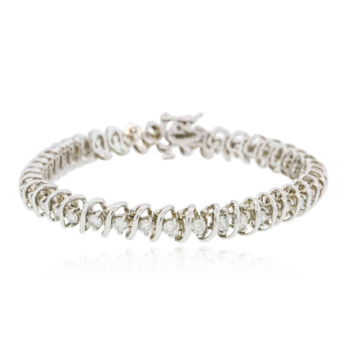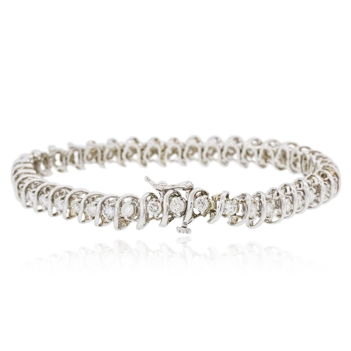 One electronically tested 14KT white gold ladies combination cast & assembled tennis bracelet with a hidden box clasp with a bright polish finish. Condition is new. Measurements: 7" in length. Containing: Forty-Two prong set round brilliant cut diamonds, measuring 2.80 - 2.80 x 1.68mm (depth est.) approximate total weight of 42 Stones = 3.37ct. Clarity: SI-2 to I-1. Color: H - J, Cut is Good. All diamonds are graded in the mounting, unless otherwise stated. Total Weight of Diamonds 3.37ct. Total Weight of Bracelet 15.10 grams. GGL Appraised at $14,100.00.