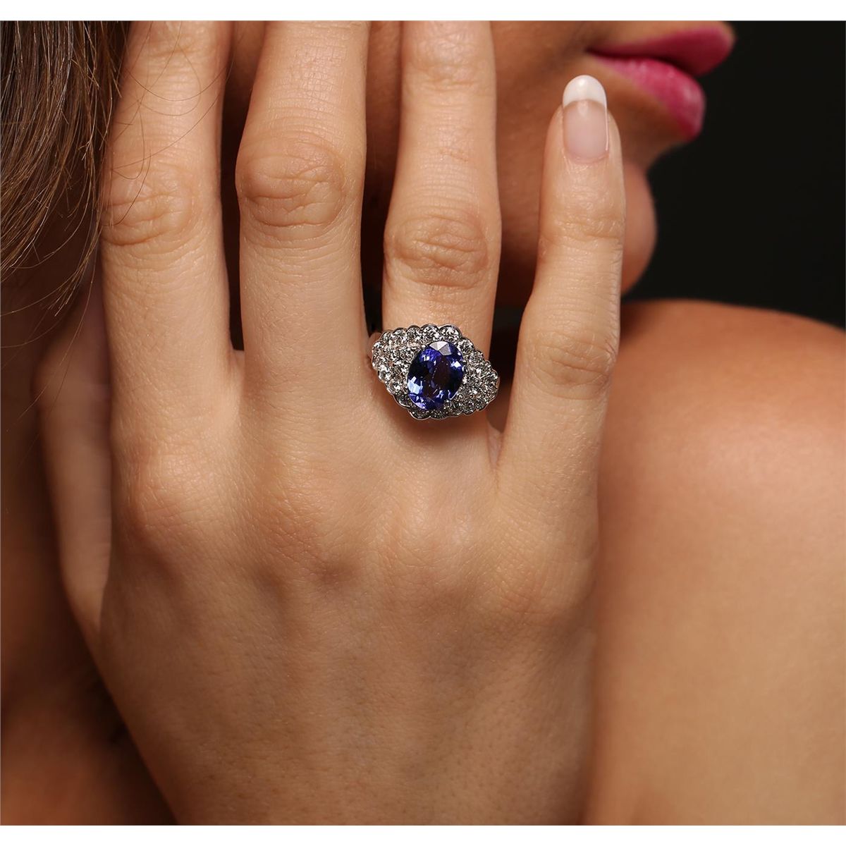 One electronically tested 14KT white gold ladies cast tanzanite and diamond ring with a bright polish finish. The featured tanzanite is set within a diamond gallery, completed by a three millimeter wide band. Identified with markings of "K14". Condition is new, good workmanship. Containing: One prong set oval mixed cut natural tanzanite, measuring 10.50 x 7.80 x 4.50mm, 8%. bulge factor, approximate weight of 2.73ct., clarity is eye clean, type I, medium, very slightly grayish, bluish violet color, (GIA bV 5/3), cut is good. Transmitting light with no distortion, transparent. Graded in the setting. Tanzanite is a very rare gemstone that is only found in the country of Tanzania. Originally discovered in 1967. Tiffany & Company, named the stone Tanzanite. It is found in the Usumburu Mountains that border the Umba Valley of northern Tanzania. Tanzanite occurs in gray, brown, violet, blue, reddish-purple, & green. The gem is interesting because of its exceptional pleochroism. Rotated in different directions a tanzanite will exhibit multiple changes of color. Tanzanite has a low tolerance to ultrasonic cleaning, and should not be cleaned using this method. Twenty-Six prong and bezel set round brilliant cut diamonds, measuring 2.70 - 2.20 x 1.47mm (depth est.) approximate. Total Weight of 26 Stones = 1.15ct. Graded in the setting. Clarity: SI-1 to SI-2 . Color: F - H. Total Weight of Colored Stones 2.73ct.. Total Weight of Diamonds 1.15ct. AIG Appraised at $11,125.00.