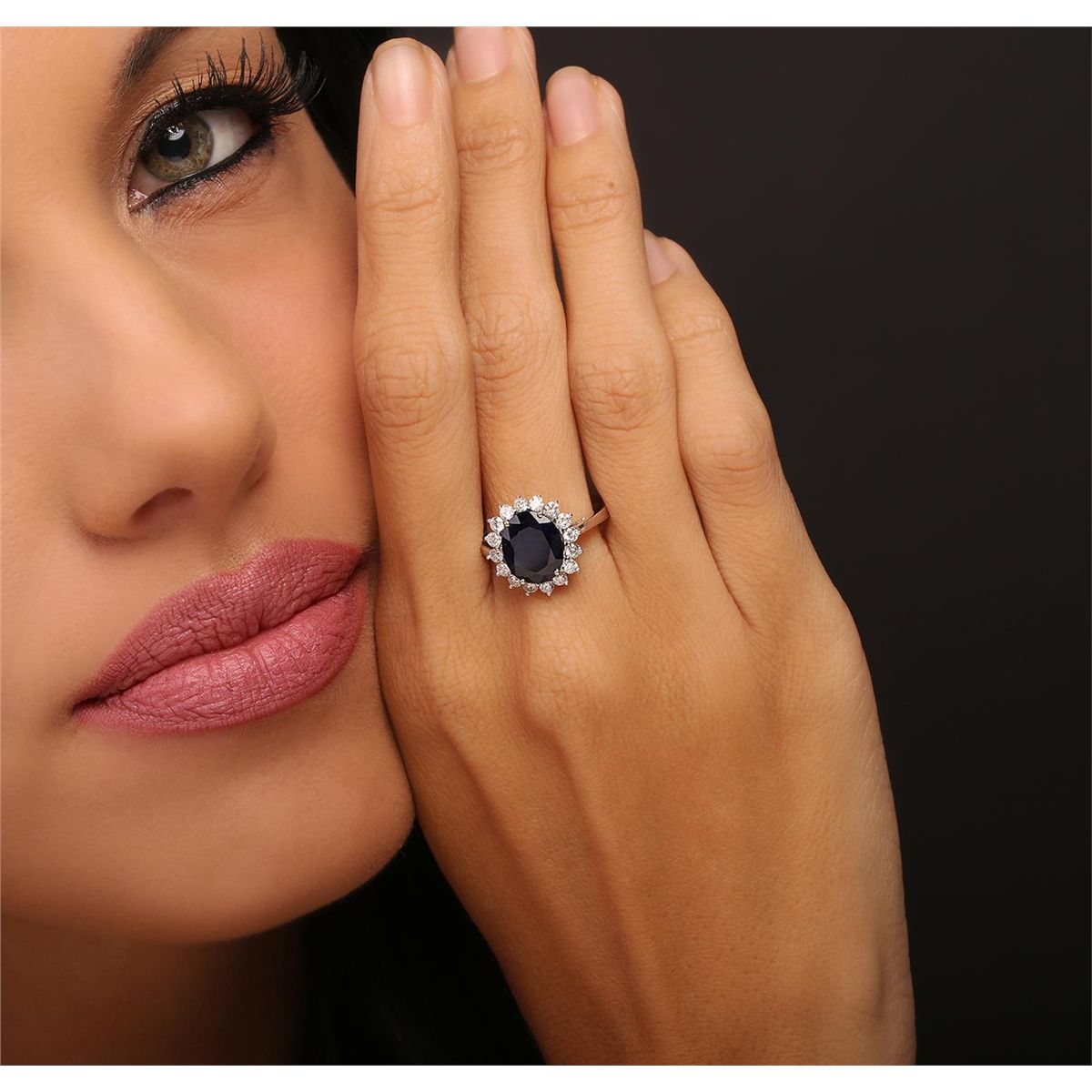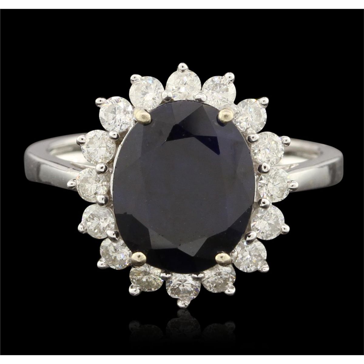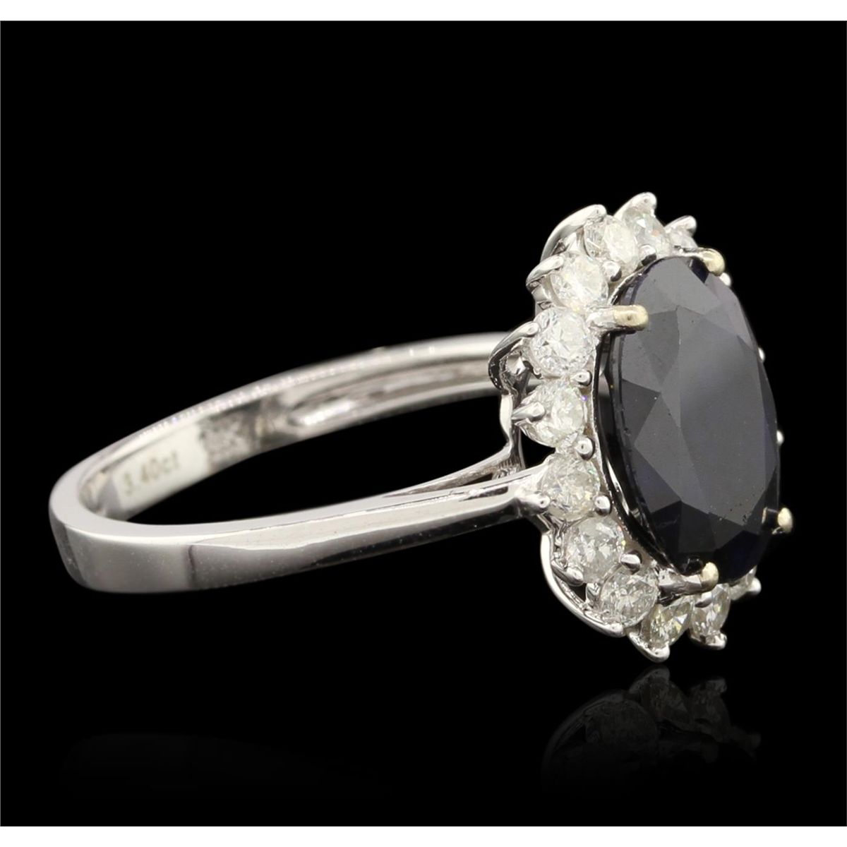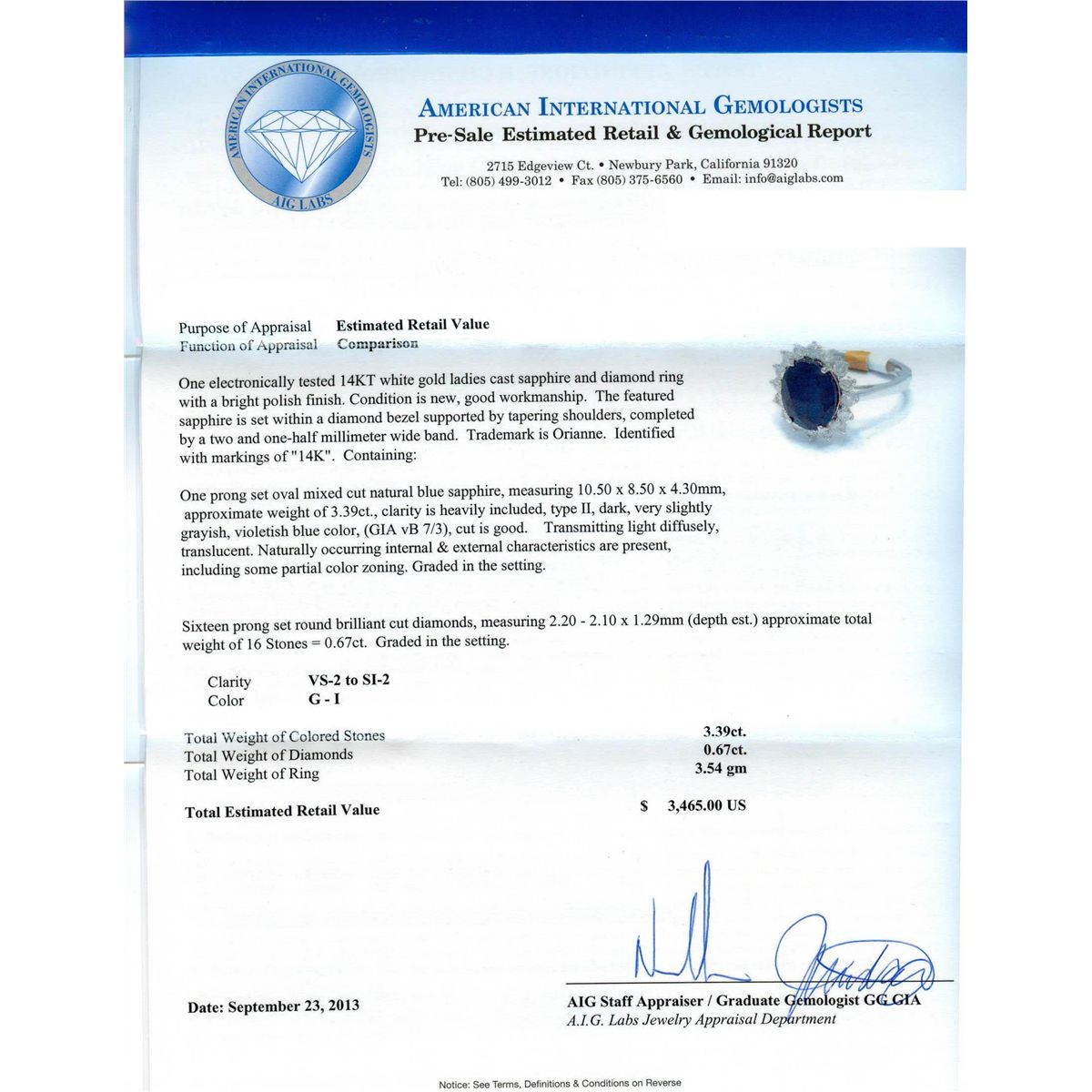 One electronically tested 14KT white gold ladies cast sapphire and diamond ring with a bright polish finish. The featured sapphire is set within a diamond bezel supported by tapering shoulders, completed by a two and one-half millimeter wide band. Trademark is Orianne. Identified with markings of "14K". Condition is new, good workmanship. Containing: One prong set oval mixed cut natural blue sapphire, measuring 10.50 x 8.50 x 4.30mm, approximate weight of 3.39ct., clarity is heavily included, type II, dark, very slightly grayish, violetish blue color, (GIA vB 7/3), cut is good. Transmitting light diffusely, translucent. Naturally occurring internal & external characteristics are present, including some partial color zoning. Graded in the setting. Sixteen prong set round brilliant cut diamonds, measuring 2.20 - 2.10 x 1.29mm (depth est.) approximate. Total Weight of 16 Stones = 0.67ct. Graded in the setting. Clarity: VS-2 to SI-2. Color: G - I. Total Weight of Colored Stones 3.39ct.. Total Weight of Diamonds 0.67ct. AIG Appraised at $3,465.00.