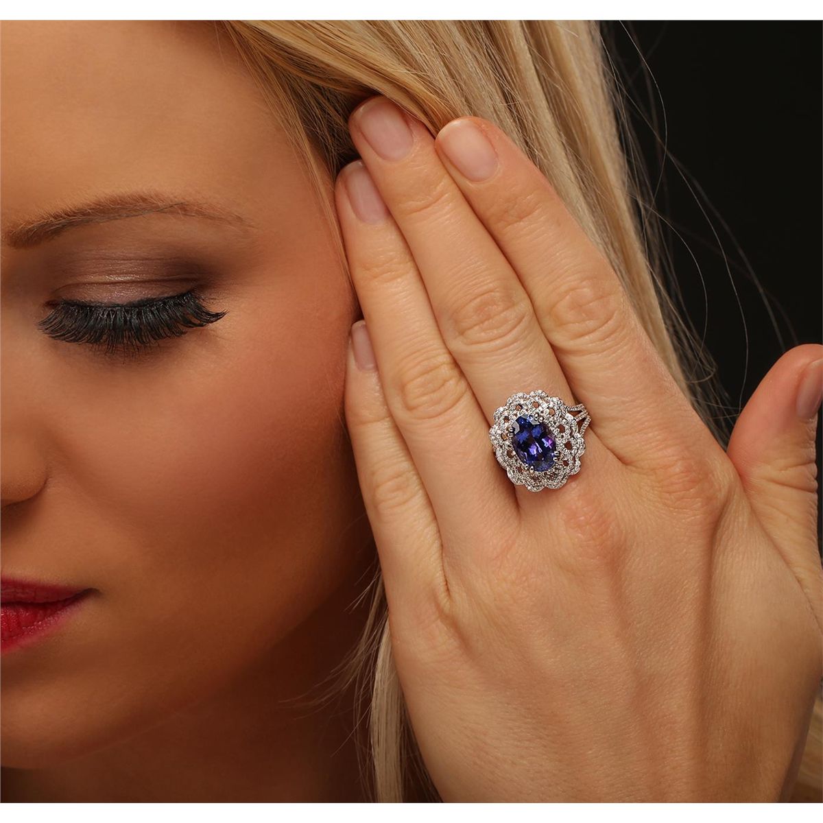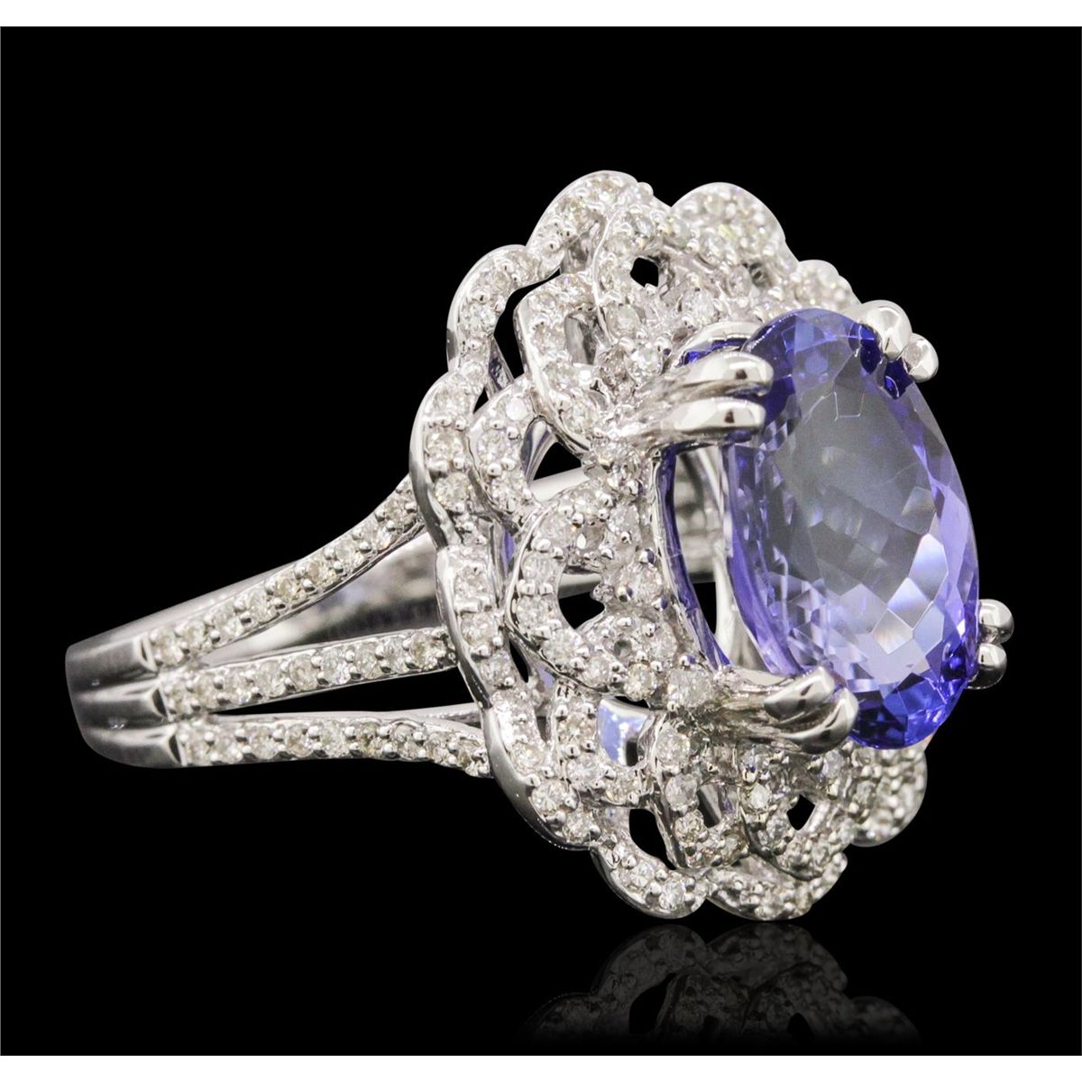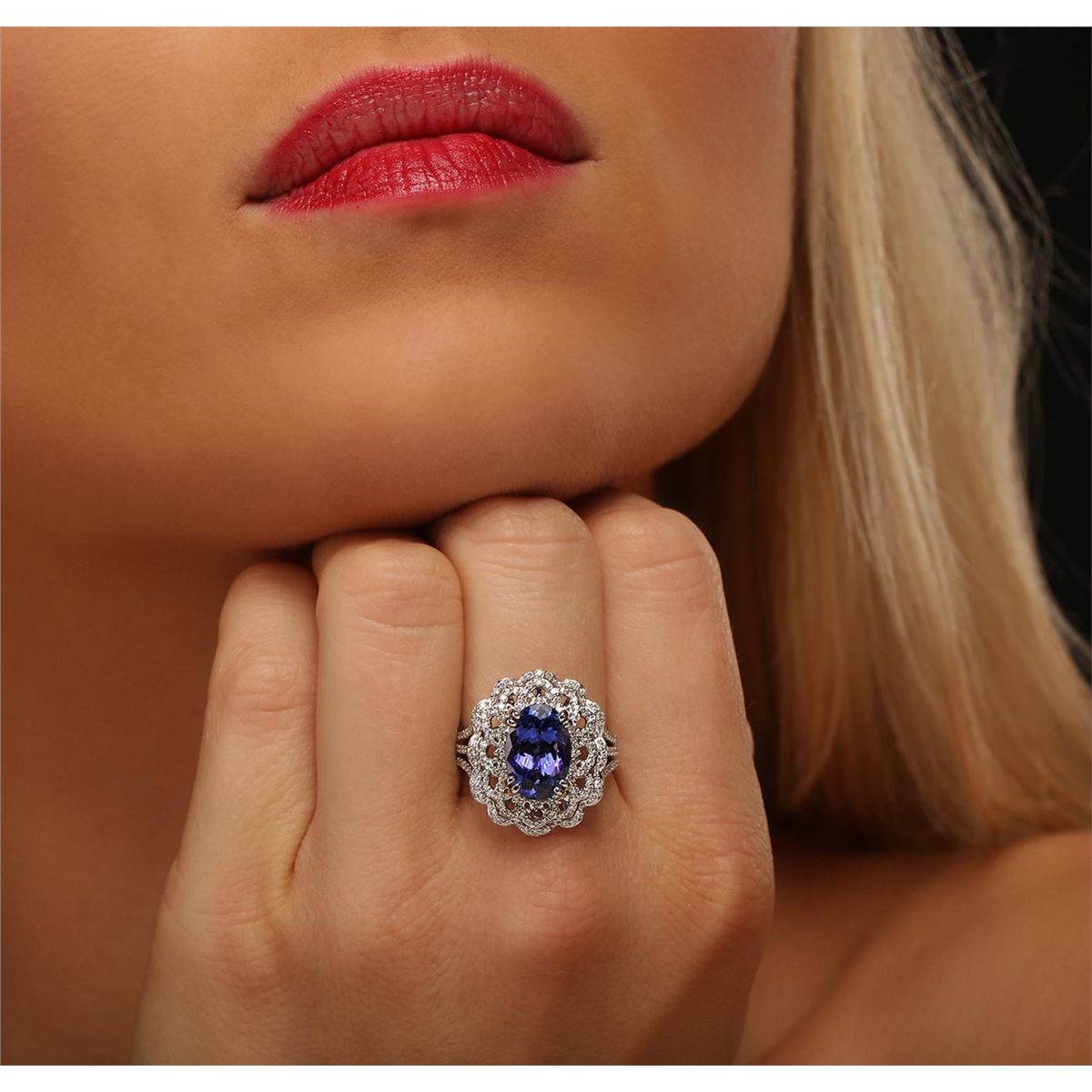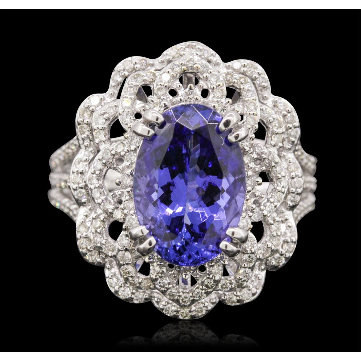 One electronically tested 14KT white gold ladies combination cast & assembled ring with a bright polish finish. Condition is new. Identified with markings of "14K". Containing: One prong set oval modified brilliant cut natural tanzanite, measuring 11.73 x 8.00 x 5.20mm, approximate weight of 3.39ct., clarity is eye clean, type I, medium, moderately strong, bluish violet color, (GIA bV 5/4), cut is good. One Hundred Ninety prong set round brilliant cut diamonds, measuring 1.00 - 1.00 x 0.60mm (depth est.) approximate total weight of 190 Stones = 0.68ct. Clarity: I-1 to I-2. Color: H - I, Cut is Good. Colored gemstones are presumed to have been subjected to commonly used enhancement processes. All diamonds and colored gemstones are graded in the mounting, unless otherwise stated. Total Weight of Colored Stones 3.39ct. Total Weight of Diamonds 0.68ct. Total Weight of Ring 6.80 grams. GGL Appraised at $8,675.00.
