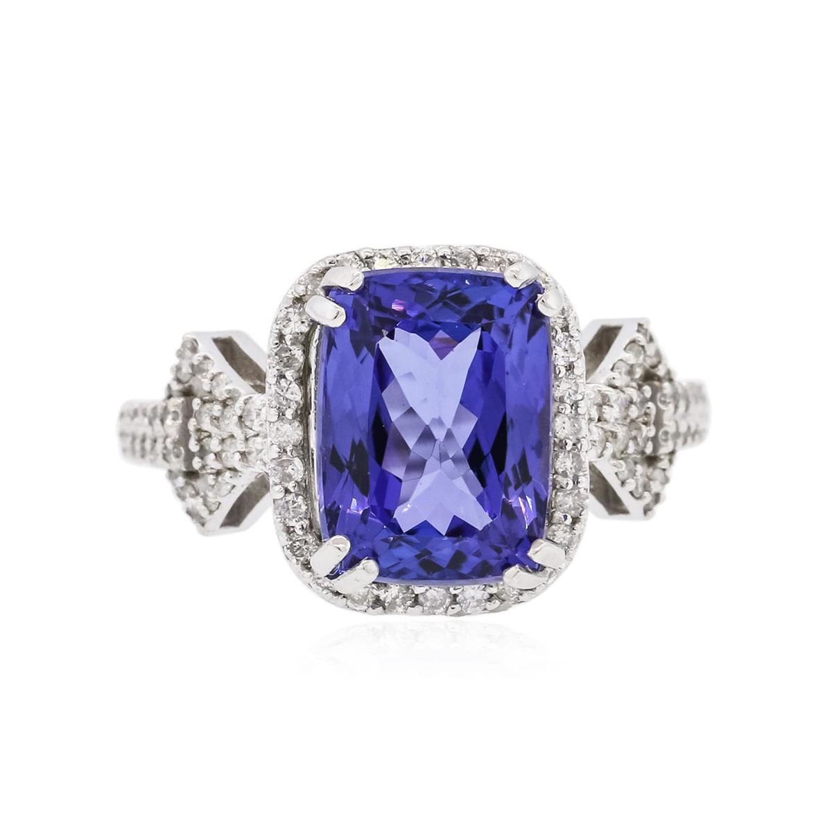 One electronically tested 14KT white gold ladies combination cast & assembled ring with a bright polish finish. Condition is new. Identified with markings of "14K". Containing: One prong set oval modified brilliant cut natural tanzanite, measuring 11.21 x 8.30 x 5.34mm, approximate weight of 3.40ct., clarity is eye clean, type I, medium, moderately strong, bluish violet color, (GIA bV 5/4), cut is good. Seventy-Nine prong set round brilliant cut diamonds, measuring 1.10 - 1.10 x 0.66mm (depth est.) approximate total weight of 79 Stones = 0.38ct. Clarity: I-2 to I-3. Color: H - I, Cut is Good. Colored gemstones are presumed to have been subjected to commonly used enhancement processes. All diamonds and colored gemstones are graded in the mounting, unless otherwise stated. Total Weight of Colored Stones 3.40ct. Total Weight of Diamonds 0.38ct. Total Weight of Ring 6.10 grams. GGL Appraised at $7,190.00.