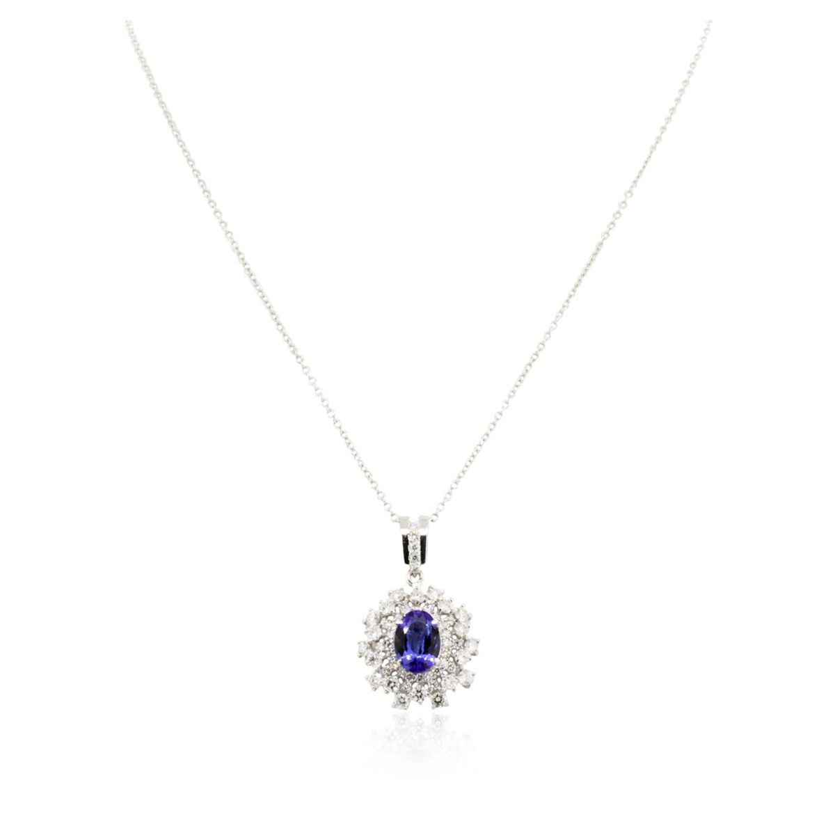 One electronically tested 14KT white gold ladies cast & assembled tanzanite and diamond pendant with chain. The pendant features a tanzanite set within a stylized diamond bezel, completed by a diamond set bail. The pendant is supported by an eighteen inch length 14KT white gold designer style chain, terminating in a lobster claw clasp. Bright polish finish. Identified with markings of "585". Condition is new, good workmanship. Containing: One prong set oval mixed cut natural tanzanite, measuring 12.00. x 8.40 x 4.60mm, 6%. bulge factor, approximate weight of 3.40ct., clarity is eye clean, type I, medium dark, very slightly grayish, bluish violet color, (GIA bV 6/3), cut is good. Transmitting light with no distortion, transparent. Graded in the setting. Tanzanite is a very rare gemstone that is only found in the country of Tanzania. Originally discovered in 1967. Tiffany & Company, named the stone Tanzanite. It is found in the Usumburu Mountains that border the Umba Valley of northern Tanzania. Tanzanite occurs in gray, brown, violet, blue, reddish-purple, & green. The gem is interesting because of its exceptional pleochroism. Rotated in different directions a tanzanite will exhibit multiple changes of color. Tanzanite has a low tolerance to ultrasonic cleaning, and should not be cleaned using this method. Twenty prong set round brilliant cut diamonds, measuring 3.00. - 2.90 x 1.77mm (depth est.) approximate total weight of 20 Stones = 1.97ct. Graded in the setting. Clarity: SI-1 to I-1 . Color: G - I Thirty-Five prong set round brilliant cut diamonds, measuring 2.00. - 1.90 x 1.17mm (depth est.) approximate total weight of 35 Stones = 1.05ct. Graded in the setting. Clarity: SI-1 to I-1 . Color: G - I. Total Weight of Colored Stones 3.40ct. Total Weight of Diamonds 3.02ct. Total Weight of Pendant With Chain 9.68 grams. AIG Appraised at $18,750.00.