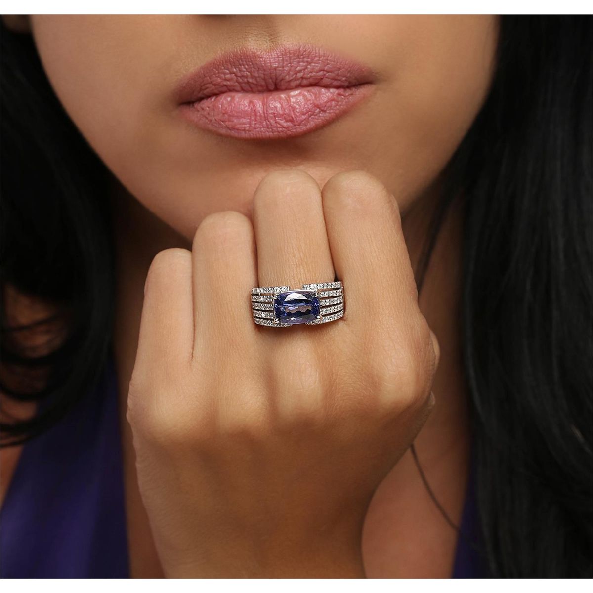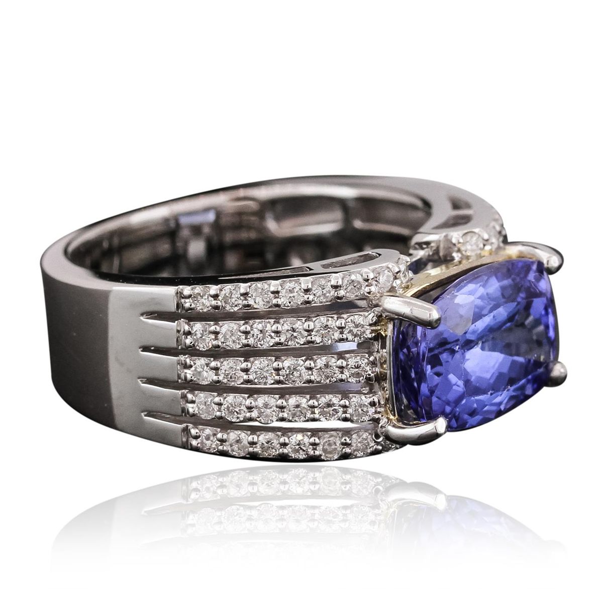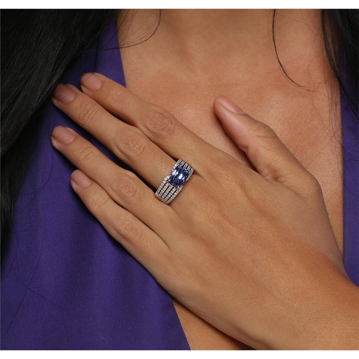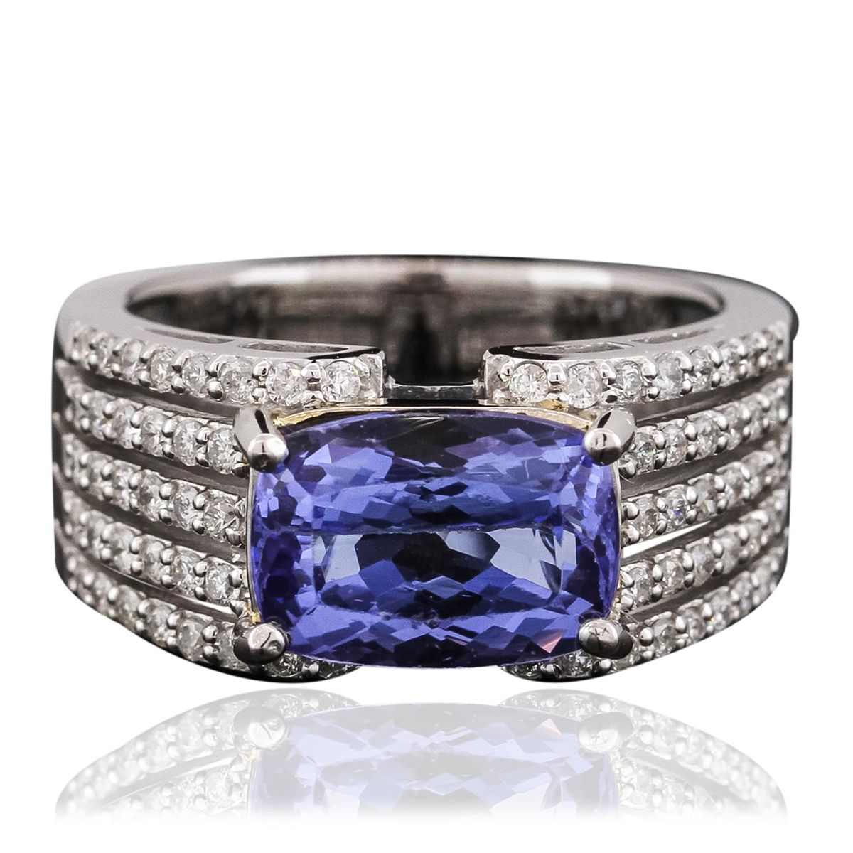 One electronically tested 14KT white gold ladies cast tanzanite and diamond ring. The featured tanzanite is supported by diamond set shoulders, completed by a five and one-half millimeter wide band. Bright polish finish with yellow gold accents. Identified with markings of "14K". Condition is new, good workmanship. Containing: One prong set rectangular cushion mixed cut natural tanzanite, measuring 10.45 x 7.50 x 5.10mm, 8% bulge factor, approximate weight of 3.40ct., clarity is eye clean, type I, medium dark, very slightly grayish, bluish violet color, (GIA bV 6/3), cut is good. Transmitting light with no distortion, transparent. Graded in the setting. Tanzanite is a very rare gemstone that is only found in the country of Tanzania. Originally discovered in 1967. Tiffany & Company, named the stone Tanzanite. It is found in the Usumburu Mountains that border the Umba Valley of northern Tanzania. Tanzanite occurs in gray, brown, violet, blue, reddish-purple, & green. The gem is interesting because of its exceptional pleochroism. Rotated in different directions a tanzanite will exhibit multiple changes of color. Tanzanite has a low tolerance to ultrasonic cleaning, and should not be cleaned using this method. Sixty-Eight prong set round brilliant cut diamonds, measuring 1.40 - 1.30 x 0.81mm (depth est.) approximate total weight of 68 Stones = 0.71ct. Graded in the setting. Clarity: SI-1 to I-1. Color: G - I. Total Weight of Colored Stones 3.40ct. Total Weight of Diamonds 0.71ct. Total Weight of Ring 8.09 grams. AIG Appraised at $12,190.00.