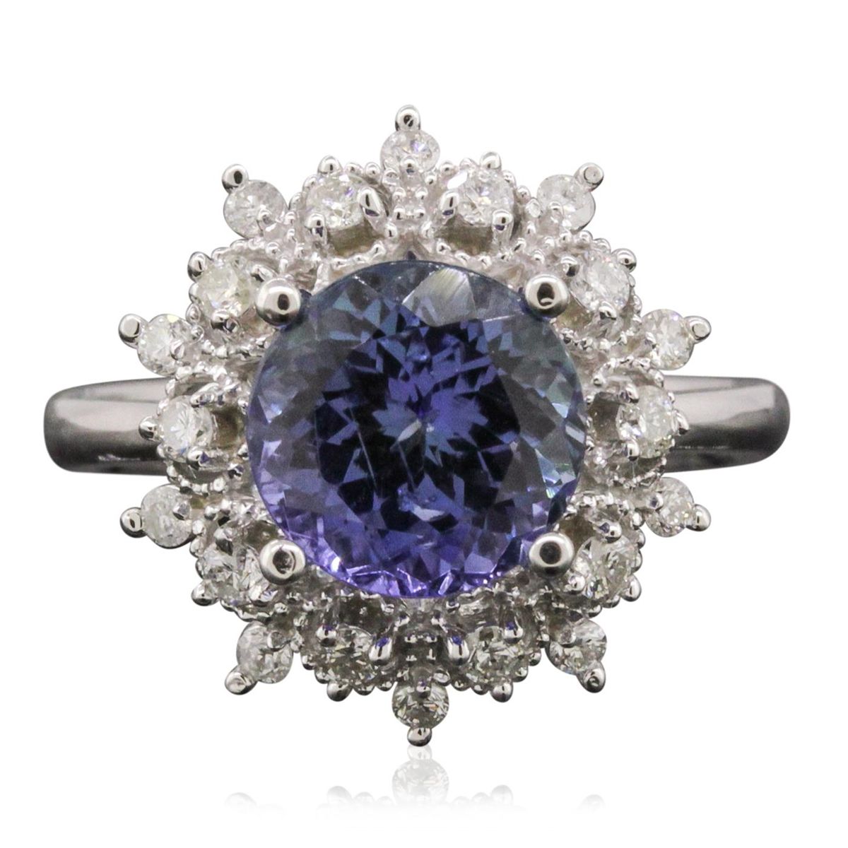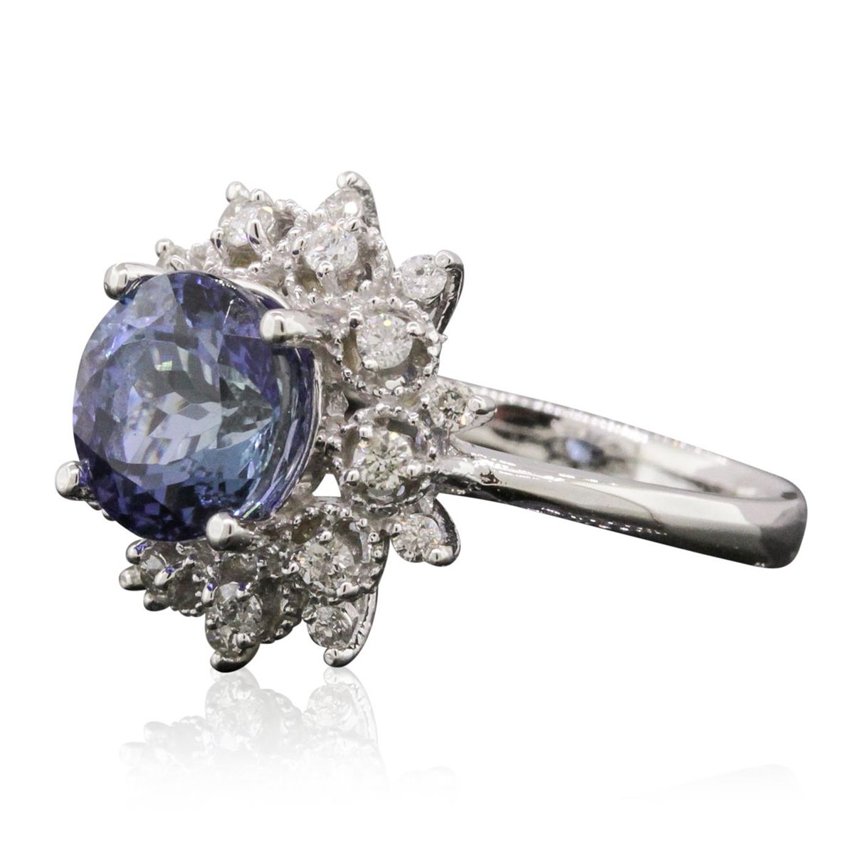 One electronically tested 14KT white gold ladies cast tanzanite and diamond ring. Condition is new, good workmanship. The featured tanzanite is set within a stylized diamond bezel, completed by a two and one-half millimeter wide band. Bright polish finish with milgrain detailing. Identified with markings of "K14". Containing: One prong set round brilliant cut natural tanzanite, measuring 8.65 - 8.60 x 6.40 mm, 6%. bulge factor, approximate weight of 3.40ct., clarity is eye clean, type I, medium dark, very slightly grayish, violetish blue color, (GIA vB 6/3), cut is good. Transmitting light with no distortion, transparent. Graded in the setting.Tanzanite is a very rare gemstone that is only found in the country of Tanzania. Originally discovered in 1967. Tiffany & Company, named the stone Tanzanite. It is found in the Usumburu Mountains that border the Umba Valley of northern Tanzania. Tanzanite occurs in gray, brown, violet, blue, reddish-purple, & green. The gem is interesting because of its exceptional pleochroism. Rotated in different directions a tanzanite will exhibit multiple changes of color. Tanzanite has a low tolerance to ultrasonic cleaning, and should not be cleaned using this method.Twenty prong set round brilliant cut diamonds, measuring 1.80 - 1.60 x 1.02mm (depth est.) approximate. Total Weight of 20 Stones = 0.45ct. Graded in the setting. Clarity: I-1 to I-2. Color: G - I. Total Weight of Colored Stones 3.40ct. Total Weight of Diamonds 0.45ct. Total Weight of Ring 5.06gm. AIG Appraised at $10,445.00.