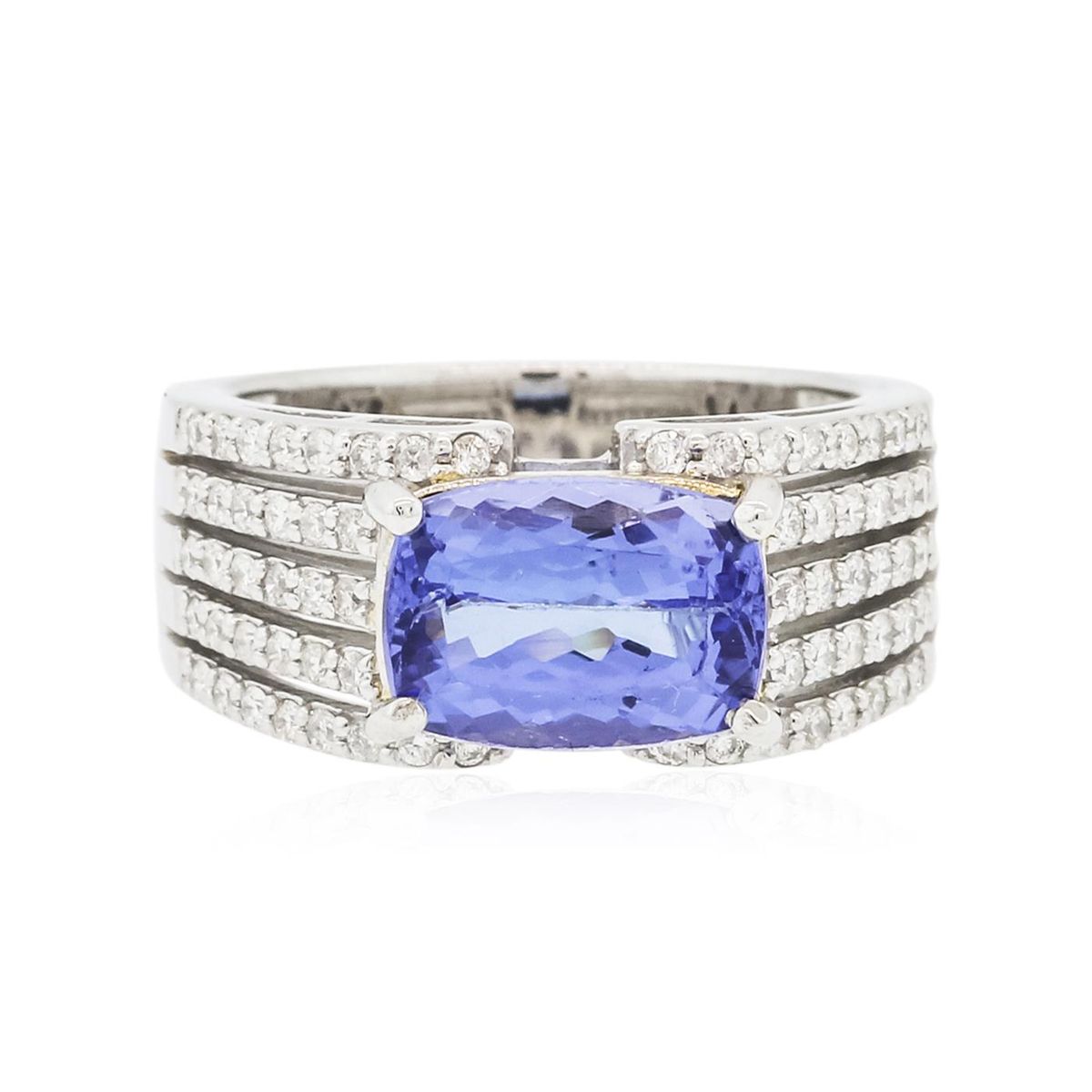 One electronically tested 14KT white gold ladies cast tanzanite and diamond ring. The featured tanzanite is supported by diamond set shoulders, completed by a five and one-half millimeter wide band. Bright polish finish with yellow gold accents. Identified with markings of "14K". Condition is new, good workmanship. Containing: One prong set rectangular cushion mixed cut natural tanzanite, measuring 10.45 x 7.50 x 5.10mm, 8% bulge factor, approximate weight of 3.40ct., clarity is eye clean, type I, medium dark, very slightly grayish, bluish violet color, (GIA bV 6/3), cut is good. Transmitting light with no distortion, transparent. Graded in the setting. Tanzanite is a very rare gemstone that is only found in the country of Tanzania. Originally discovered in 1967. Tiffany & Company, named the stone Tanzanite. It is found in the Usumburu Mountains that border the Umba Valley of northern Tanzania. Tanzanite occurs in gray, brown, violet, blue, reddish-purple, & green. The gem is interesting because of its exceptional pleochroism. Rotated in different directions a tanzanite will exhibit multiple changes of color. Tanzanite has a low tolerance to ultrasonic cleaning, and should not be cleaned using this method. Sixty-Eight prong set round brilliant cut diamonds, measuring 1.40 - 1.30 x 0.81mm (depth est.) approximate total weight of 68 Stones = 0.71ct. Graded in the setting. Clarity: SI-1 to I-1. Color: G - I. Total Weight of Colored Stones 3.40ct. Total Weight of Diamonds 0.71ct. Total Weight of Ring 8.09 grams. AIG Appraised at $12,190.00.