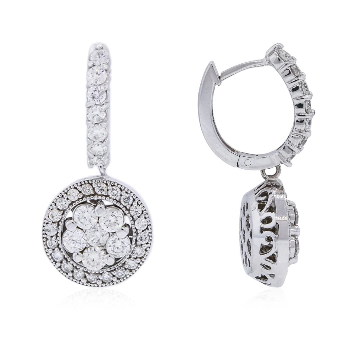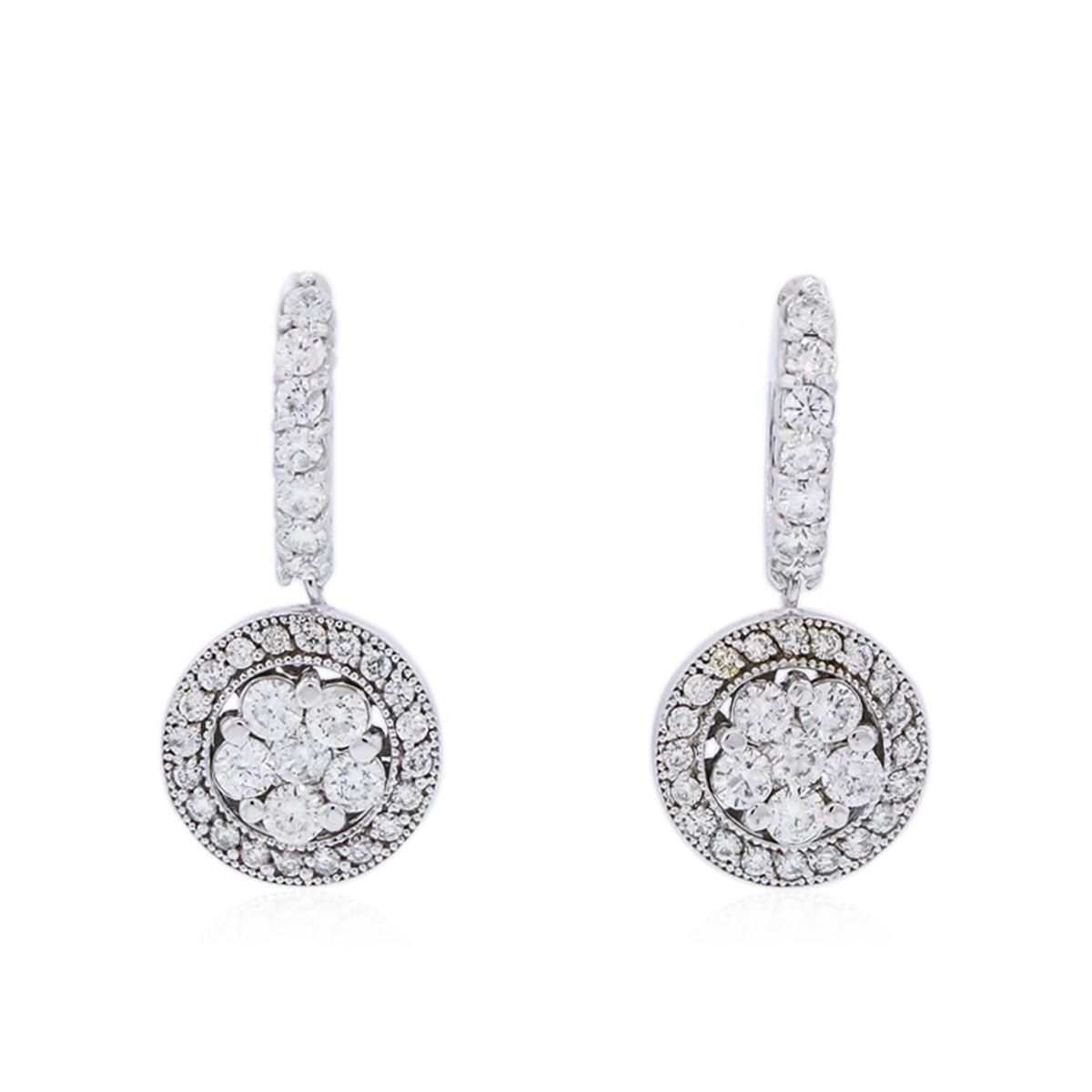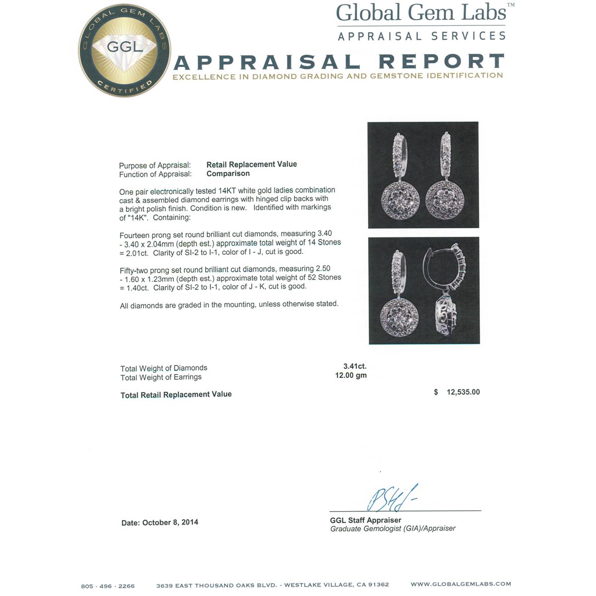 One pair electronically tested 14KT white gold ladies combination cast & assembled diamond earrings with hinged clip backs with a bright polish finish. Identified with markings of "14K". Condition is new. Containing: Fourteen prong set round brilliant cut diamonds, measuring 3.40 - 3.40 x 2.04mm (depth est.) approximate total weight of 14 Stones = 2.01ct. Clarity: SI-2 to I-1. Color: I - J, Cut is Good. Fifty-Two prong set round brilliant cut diamonds, measuring 2.50 - 1.60 x 1.23mm (depth est.) approximate total weight of 52 Stones = 1.40ct. Clarity: SI-2 to I-1. Color: J - K, Cut is Good. All diamonds are graded in the mounting, unless otherwise stated. Total Weight of Diamonds 3.41ct. Total Weight of Earrings 12.00 grams. GGL Appraised at $12,535.00.