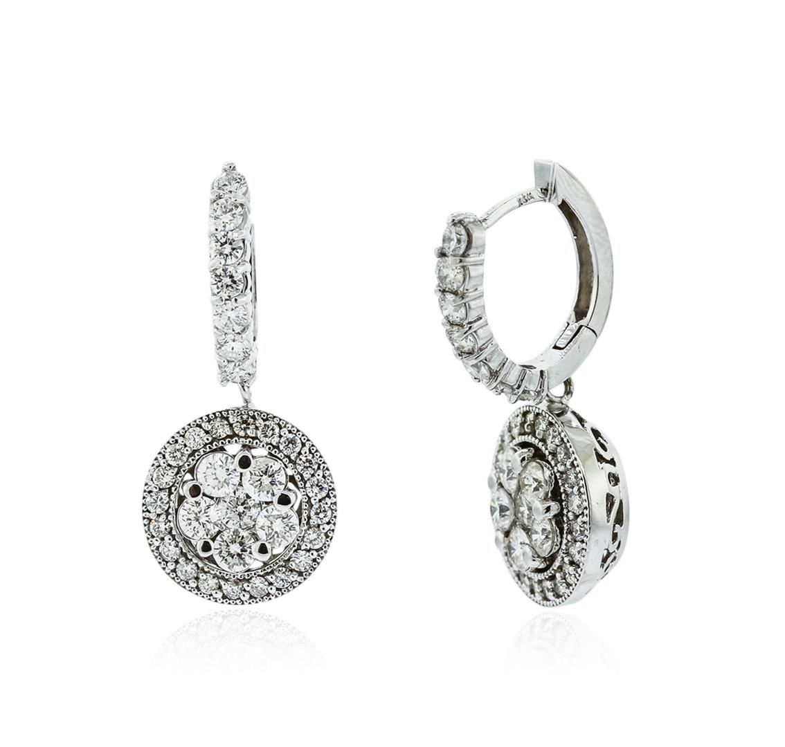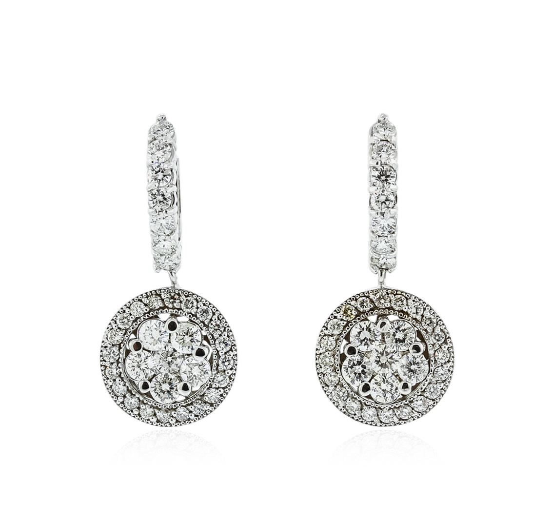 One pair electronically tested 14KT white gold ladies combination cast & assembled diamond earrings with hinged clip backs with a bright polish finish. Identified with markings of "14K". Condition is new. Containing: Fourteen prong set round brilliant cut diamonds, measuring 3.40 - 3.40 x 2.04mm (depth est.) approximate total weight of 14 Stones = 2.01ct. Clarity: SI-2 to I-1. Color: I - J, Cut is Good. Fifty-Two prong set round brilliant cut diamonds, measuring 2.50 - 1.60 x 1.23mm (depth est.) approximate total weight of 52 Stones = 1.40ct. Clarity: SI-2 to I-1. Color: J - K, Cut is Good. All diamonds are graded in the mounting, unless otherwise stated. Total Weight of Diamonds 3.41ct. Total Weight of Earrings 12.00 grams. GGL Appraised at $12,535.00.