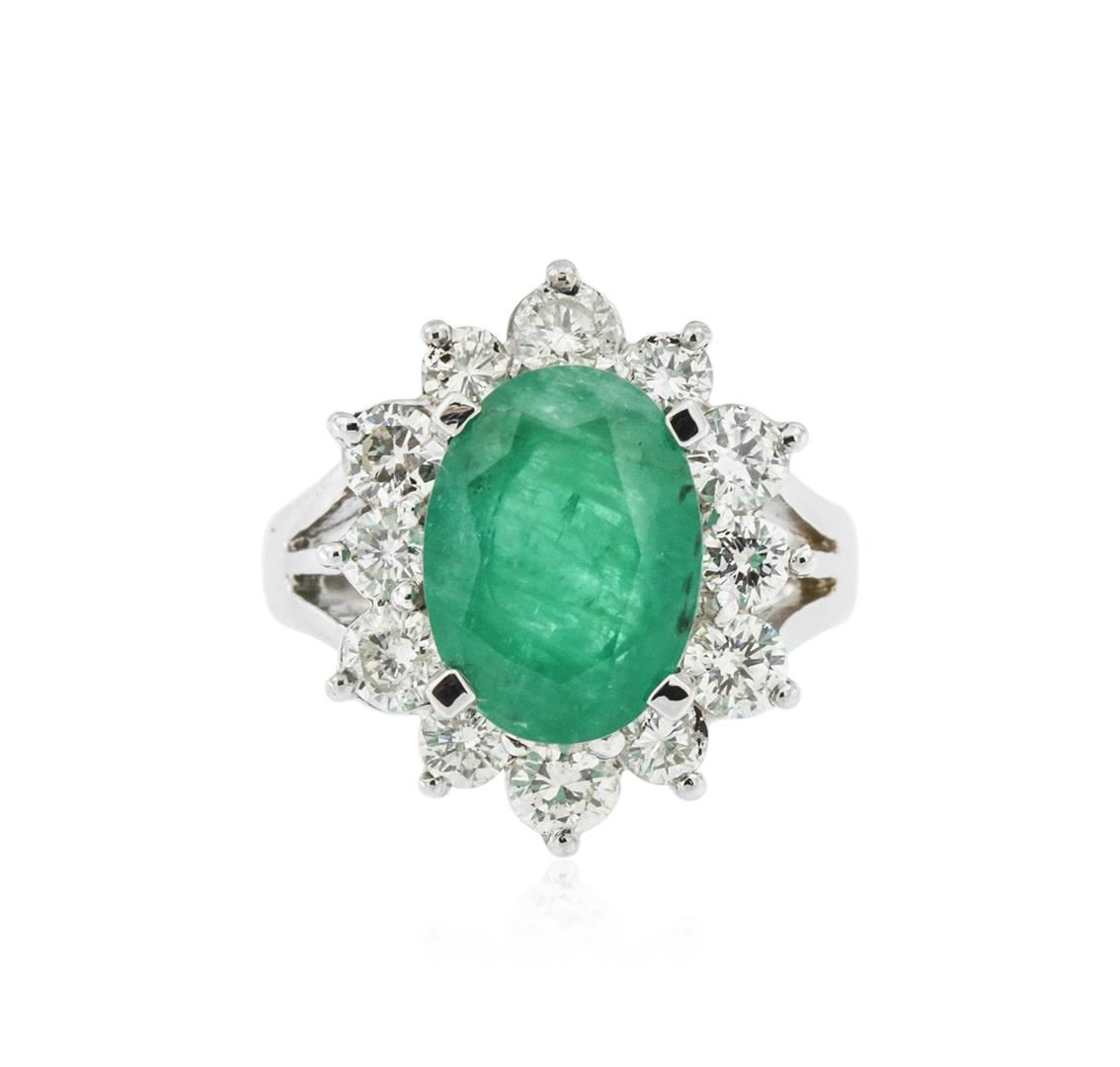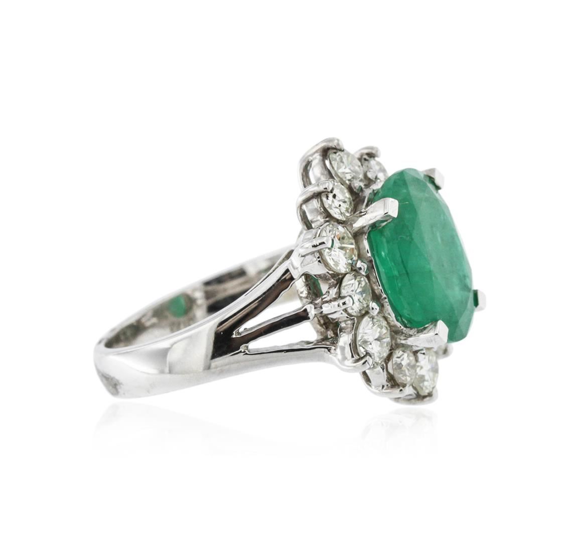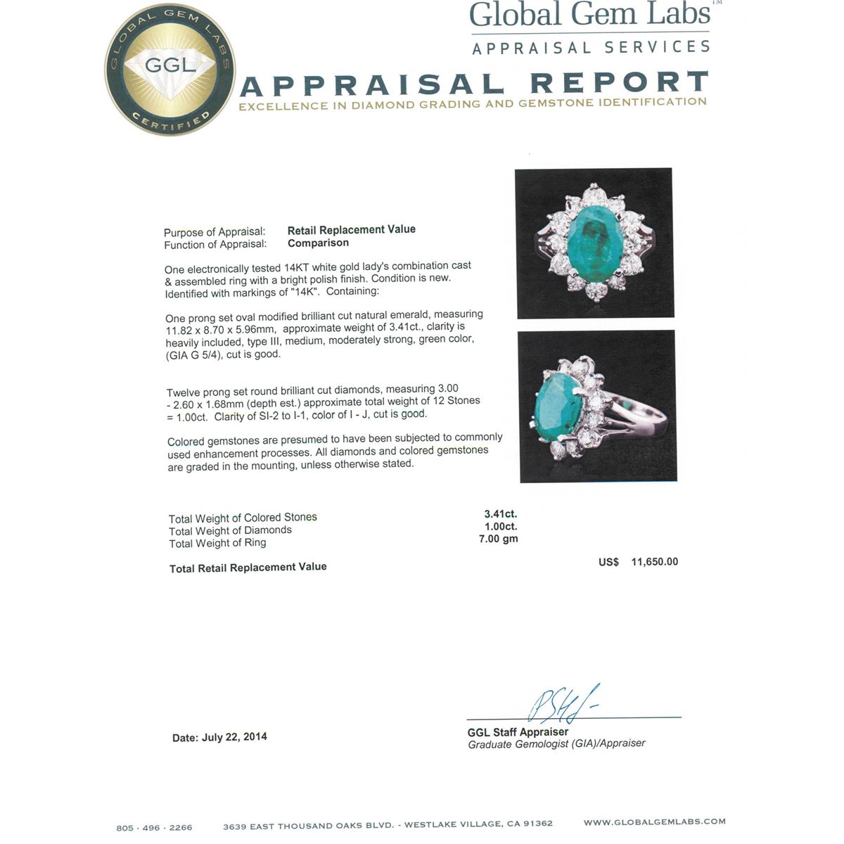 One electronically tested 14KT white gold ladies combination cast & assembled ring with a bright polish finish. Condition is new. Identified with markings of "14K". Containing: One prong set oval modified brilliant cut natural emerald, measuring 11.82 x 8.70 x 5.96mm, approximate weight of 3.41ct., clarity is heavily included, type III, medium, moderately strong, green color, (GIA G 5/4), cut is good. Twelve prong set round brilliant cut diamonds, measuring 3.00 - 2.60 x 1.68mm (depth est.) approximate total weight of 12 Stones = 1.00ct. Clarity: SI-2 to I-1. Color: I - J, Cut is Good. Colored gemstones are presumed to have been subjected to commonly used enhancement processes. All diamonds and colored gemstones are graded in the mounting, unless otherwise stated. Total Weight of Colored Stones 3.41ct. Total Weight of Diamonds 1.00ct. Total Weight of Ring 7.00 grams. GGL Appraised at $11,650.00.
