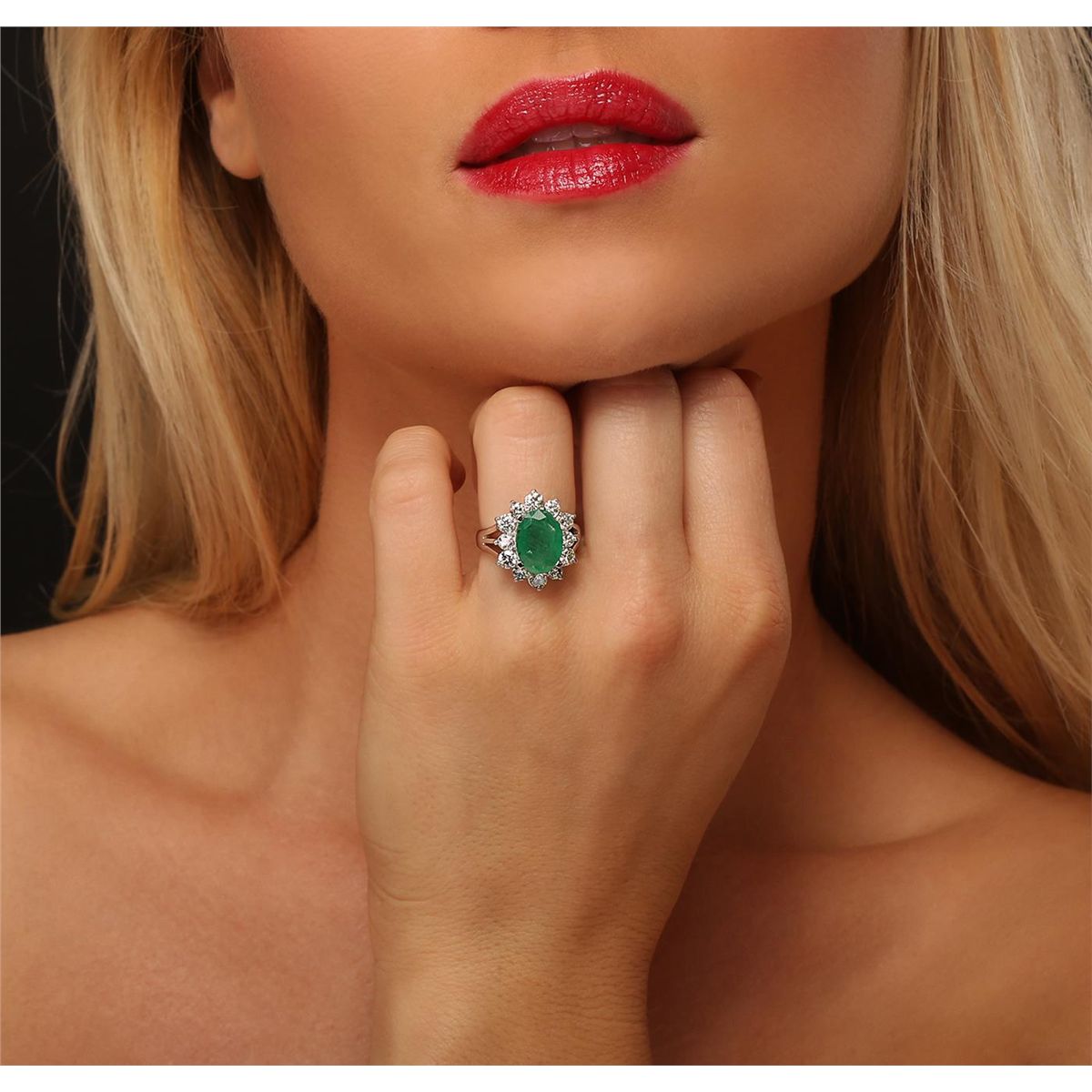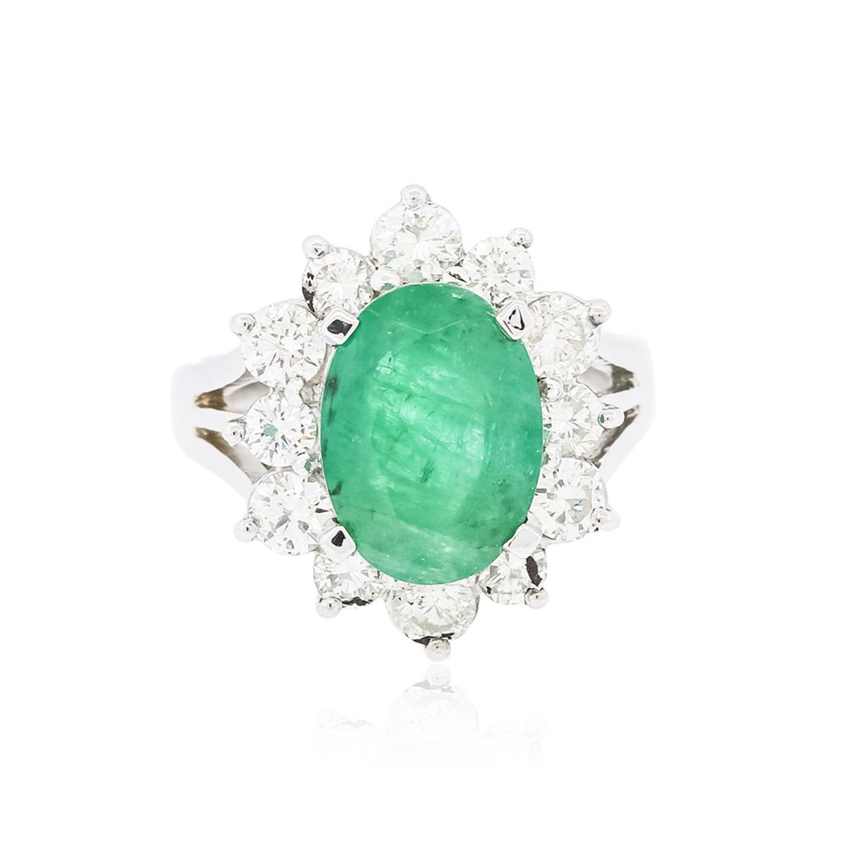 One electronically tested 14KT white gold ladies combination cast & assembled ring with a bright polish finish. Condition is new. Identified with markings of "14K". Containing: One prong set oval modified brilliant cut natural emerald, measuring 11.82 x 8.70 x 5.96mm, approximate weight of 3.41ct., clarity is heavily included, type III, medium, moderately strong, green color, (GIA G 5/4), cut is good. Twelve prong set round brilliant cut diamonds, measuring 3.00 - 2.60 x 1.68mm (depth est.) approximate total weight of 12 Stones = 1.00ct. Clarity: SI-2 to I-1. Color: I - J, Cut is Good. Colored gemstones are presumed to have been subjected to commonly used enhancement processes. All diamonds and colored gemstones are graded in the mounting, unless otherwise stated. Total Weight of Colored Stones 3.41ct. Total Weight of Diamonds 1.00ct. Total Weight of Ring 7.00 grams. GGL Appraised at $11,650.00.