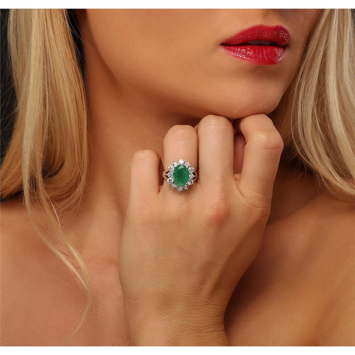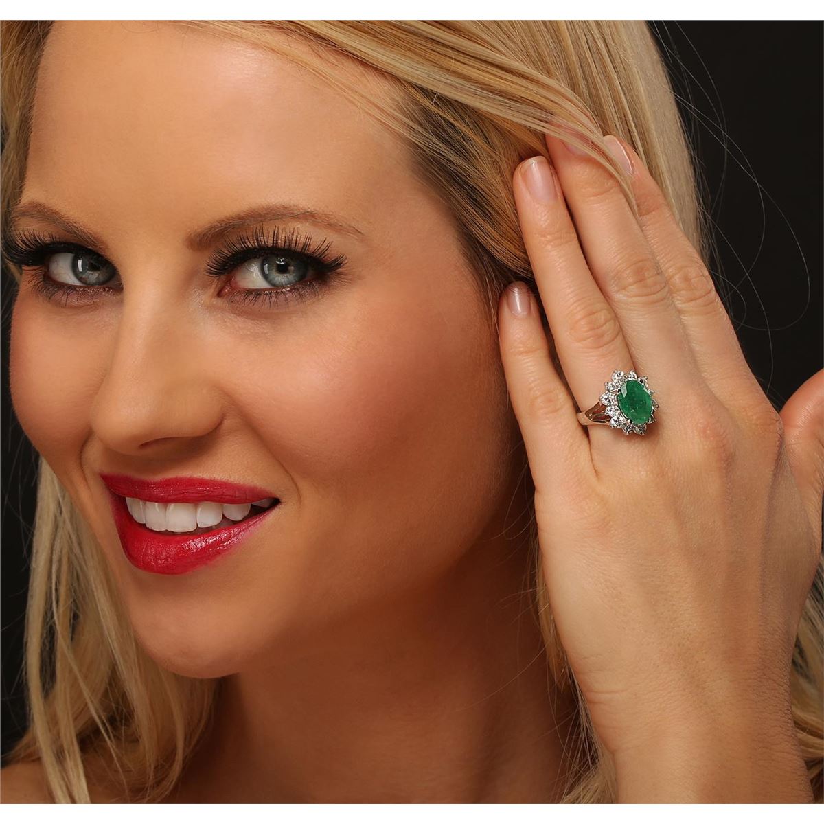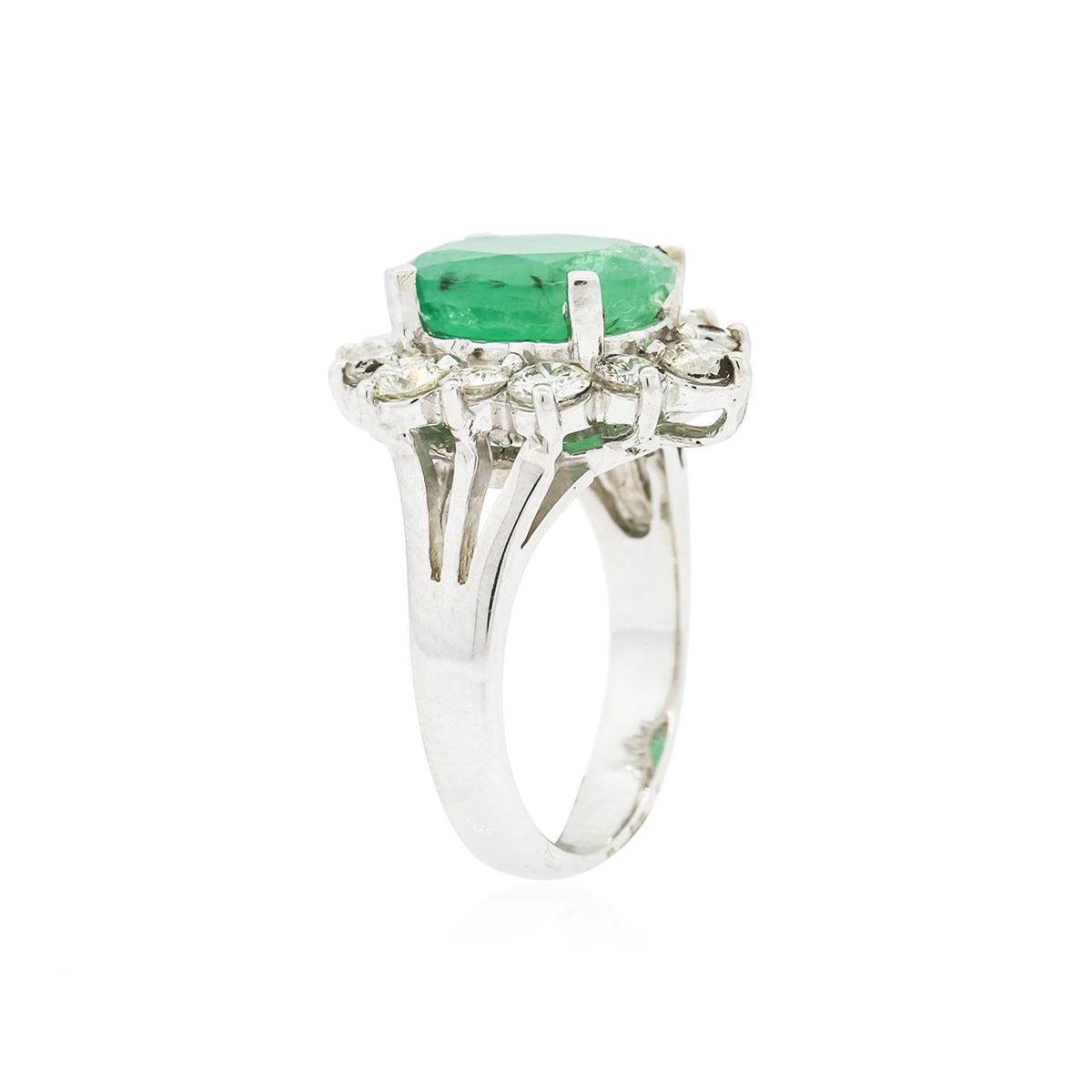 One electronically tested 14KT white gold ladies combination cast & assembled ring with a bright polish finish. Condition is new. Identified with markings of "14K". Containing: One prong set oval modified brilliant cut natural emerald, measuring 11.82 x 8.70 x 5.96mm, approximate weight of 3.41ct., clarity is heavily included, type III, medium, moderately strong, green color, (GIA G 5/4), cut is good. Twelve prong set round brilliant cut diamonds, measuring 3.00 - 2.60 x 1.68mm (depth est.) approximate total weight of 12 Stones = 1.00ct. Clarity: SI-2 to I-1. Color: I - J, Cut is Good. Colored gemstones are presumed to have been subjected to commonly used enhancement processes. All diamonds and colored gemstones are graded in the mounting, unless otherwise stated. Total Weight of Colored Stones 3.41ct. Total Weight of Diamonds 1.00ct. Total Weight of Ring 7.00 grams. GGL Appraised at $11,650.00.