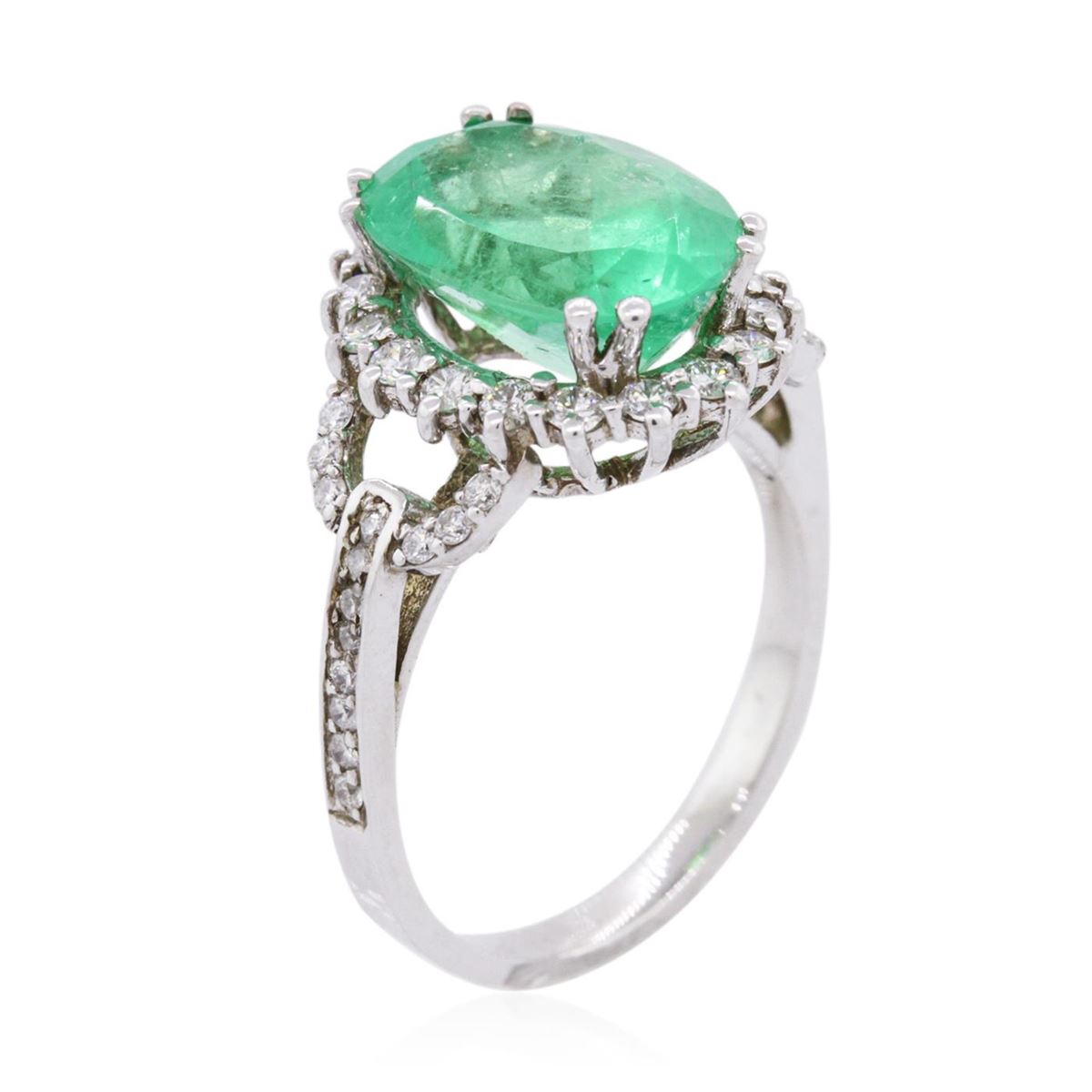 One electronically tested 14KT white gold ladies combination cast & assembled emerald and diamond ring with a split shank with a bright polish finish. Identified with markings of "14K". Condition is new. Containing: One prong set oval modified step cut natural emerald, measuring 12.40 x 8.62 x 5.60mm, approximate weight of 3.42ct., clarity is heavily included, type III, medium light, very slightly grayish, very slightly bluish green color, (GIA vslbG 4/3), cut is good. Twenty-Eight prong set round brilliant cut diamonds, measuring 1.00 - 1.00 x 0.60mm (depth est.) approximate total weight of 28 Stones = 0.10ct. Clarity: I-1. Color: H - I, Cut is Good. Eighteen prong set round brilliant cut diamonds, measuring 1.70 - 1.70 x 1.02mm (depth est.) approximate total weight of 18 Stones = 0.32ct. Clarity: SI-2 to I-1. Color: J, Cut is Good. All diamonds and colored gemstones are graded in the mounting, unless otherwise stated. Colored gemstones are presumed to have been subjected to commonly used enhancement processes. Total Weight of Colored Stones 3.42ct. Total Weight of Diamonds 0.42ct. Total Weight of Ring 4.30 grams. GGL Appraised at $8,995.00.