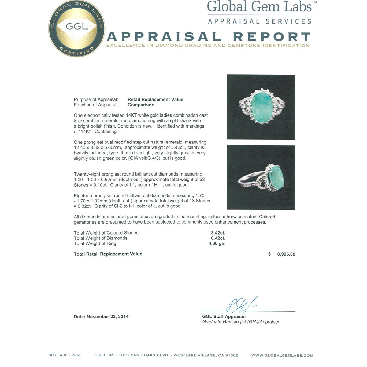 One electronically tested 14KT white gold ladies combination cast & assembled emerald and diamond ring with a split shank with a bright polish finish. Identified with markings of "14K". Condition is new. Containing: One prong set oval modified step cut natural emerald, measuring 12.40 x 8.62 x 5.60mm, approximate weight of 3.42ct., clarity is heavily included, type III, medium light, very slightly grayish, very slightly bluish green color, (GIA vslbG 4/3), cut is good. Twenty-Eight prong set round brilliant cut diamonds, measuring 1.00 - 1.00 x 0.60mm (depth est.) approximate total weight of 28 Stones = 0.10ct. Clarity: I-1. Color: H - I, Cut is Good. Eighteen prong set round brilliant cut diamonds, measuring 1.70 - 1.70 x 1.02mm (depth est.) approximate total weight of 18 Stones = 0.32ct. Clarity: SI-2 to I-1. Color: J, Cut is Good. All diamonds and colored gemstones are graded in the mounting, unless otherwise stated. Colored gemstones are presumed to have been subjected to commonly used enhancement processes. Total Weight of Colored Stones 3.42ct. Total Weight of Diamonds 0.42ct. Total Weight of Ring 4.30 grams. GGL Appraised at $8,995.00.