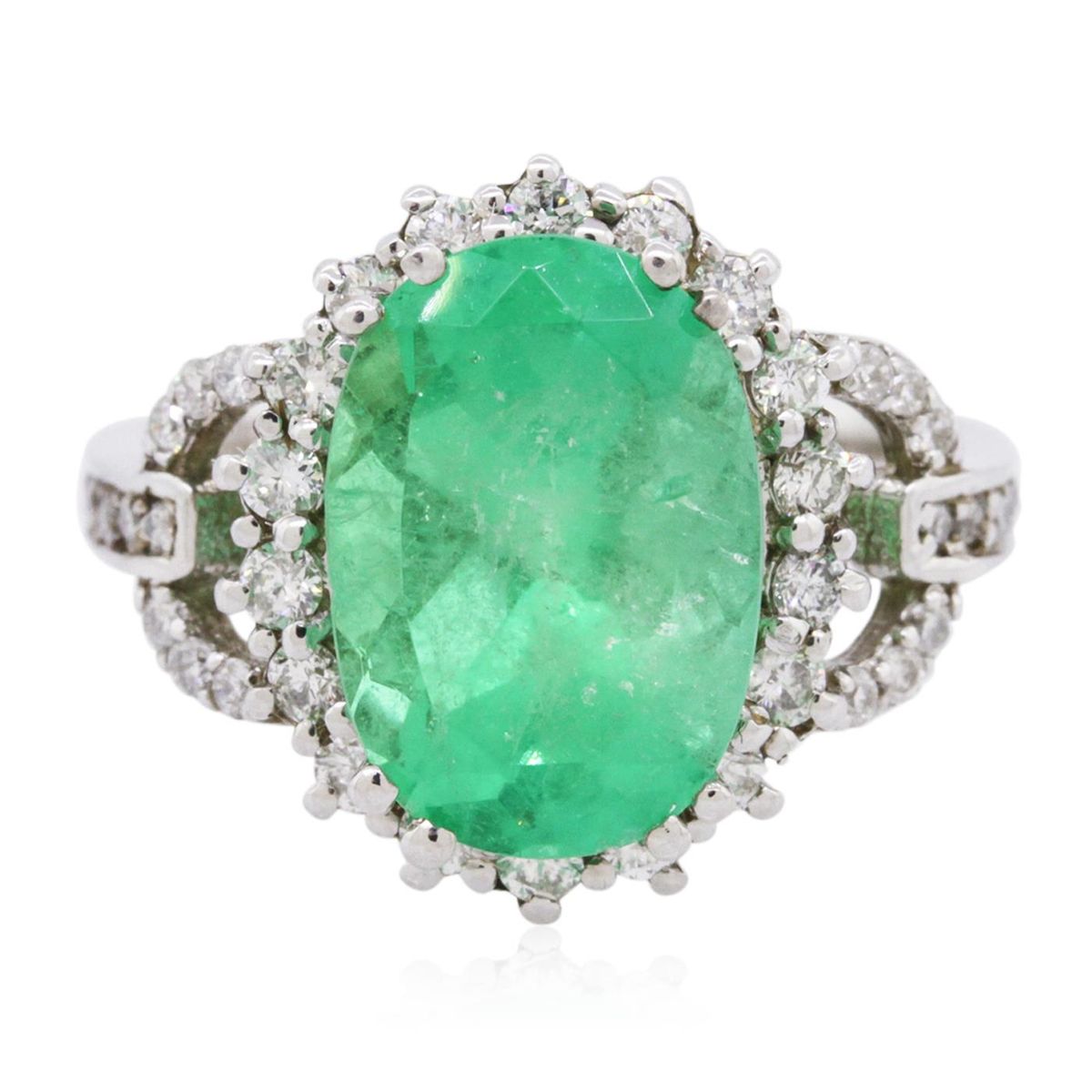One electronically tested 14KT white gold ladies combination cast & assembled emerald and diamond ring with a split shank with a bright polish finish. Identified with markings of "14K". Condition is new. Containing: One prong set oval modified step cut natural emerald, measuring 12.40 x 8.62 x 5.60mm, approximate weight of 3.42ct., clarity is heavily included, type III, medium light, very slightly grayish, very slightly bluish green color, (GIA vslbG 4/3), cut is good. Twenty-Eight prong set round brilliant cut diamonds, measuring 1.00 - 1.00 x 0.60mm (depth est.) approximate total weight of 28 Stones = 0.10ct. Clarity: I-1. Color: H - I, Cut is Good. Eighteen prong set round brilliant cut diamonds, measuring 1.70 - 1.70 x 1.02mm (depth est.) approximate total weight of 18 Stones = 0.32ct. Clarity: SI-2 to I-1. Color: J, Cut is Good. All diamonds and colored gemstones are graded in the mounting, unless otherwise stated. Colored gemstones are presumed to have been subjected to commonly used enhancement processes. Total Weight of Colored Stones 3.42ct. Total Weight of Diamonds 0.42ct. Total Weight of Ring 4.30 grams. GGL Appraised at $8,995.00.