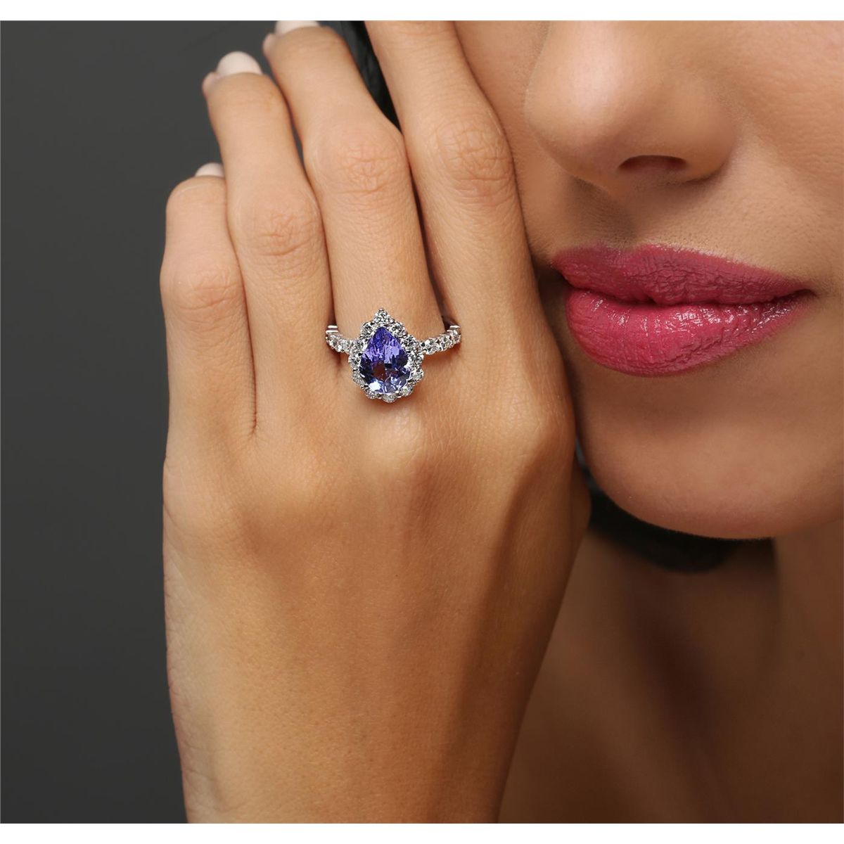 One electronically tested 14KT white gold ladies combination cast & assembled tanzanite and diamond ring with a flat shank with a bright polish finish. Identified with markings of "K14". Condition is new. Containing: One prong set pear modified brilliant cut natural tanzanite, measuring 10.50 x 8.30 x 5.86mm, approximate weight of 3.42ct., clarity is eye clean, type I, medium light, very slightly grayish, violet color, (GIA V 4/3), cut is good. Twenty-Two prong set round brilliant cut diamonds, measuring 2.50 - 2.30 x 1.44mm (depth est.) approximate total weight of 22 Stones = 1.11ct. Clarity: SI-1 to SI-2. Color: I - J, Cut is Good. Colored gemstones are presumed to have been subjected to commonly used enhancement processes. All diamonds and colored gemstones are graded in the mounting, unless otherwise stated. Total Weight of Colored Stones 3.42ct. Total Weight of Diamonds 1.11ct. Total Weight of Ring 4.40 grams. GGL Appraised at $8,700.00.