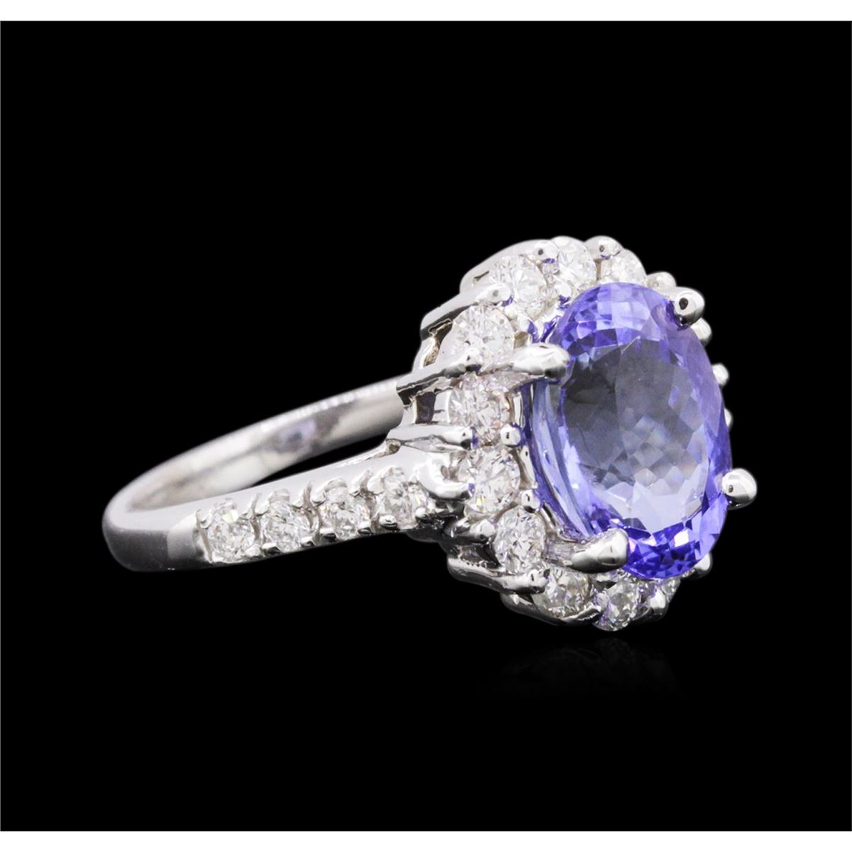 One electronically tested 14KT white gold ladies combination cast & assembled tanzanite and diamond ring with a bright polish finish. Identified with markings of "14K". Condition is new. Containing: One prong set oval modified brilliant cut natural tanzanite, measuring 10.78 x 8.02 x 5.79mm, approximate weight of 3.43ct., clarity is eye clean, type I, medium, moderately strong, violet color, (GIA V 5/4), cut is good. Twenty-Two prong set round brilliant cut diamonds, measuring 2.00 - 2.00 x 1.20mm (depth est.) approximate total  weight of 22 Stones = 0.64ct. Clarity: SI-2 to I-1. Color: I - J, Cut is Good. Colored gemstones are presumed to have been subjected to commonly used enhancement processes. All diamonds and colored gemstones are graded in the mounting, unless otherwise stated. Total Weight of Colored Stones 3.43ct. Total Weight of Diamonds 0.64ct. Total Weight of Ring 5.90 grams. GGL Appraised at $6,360.00.