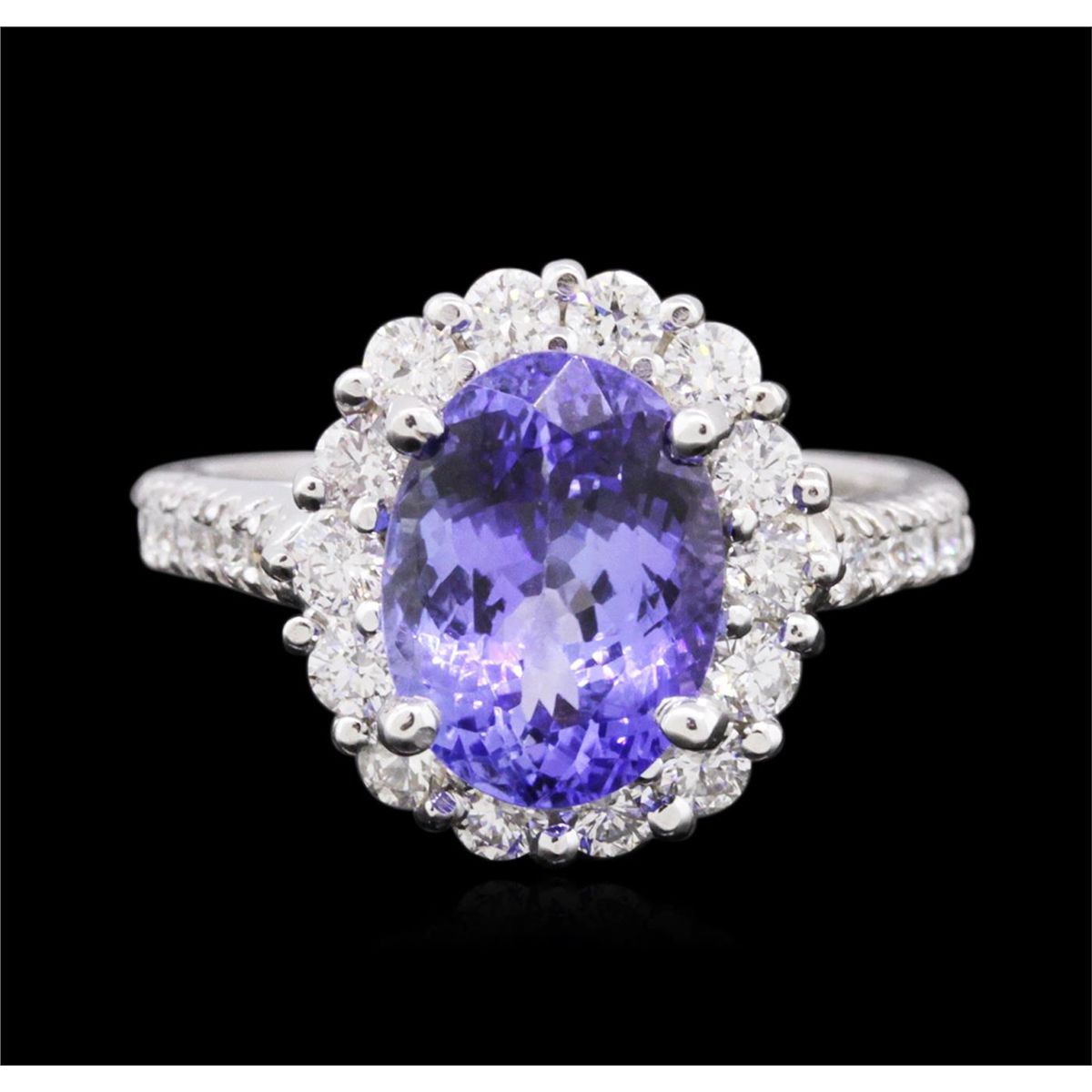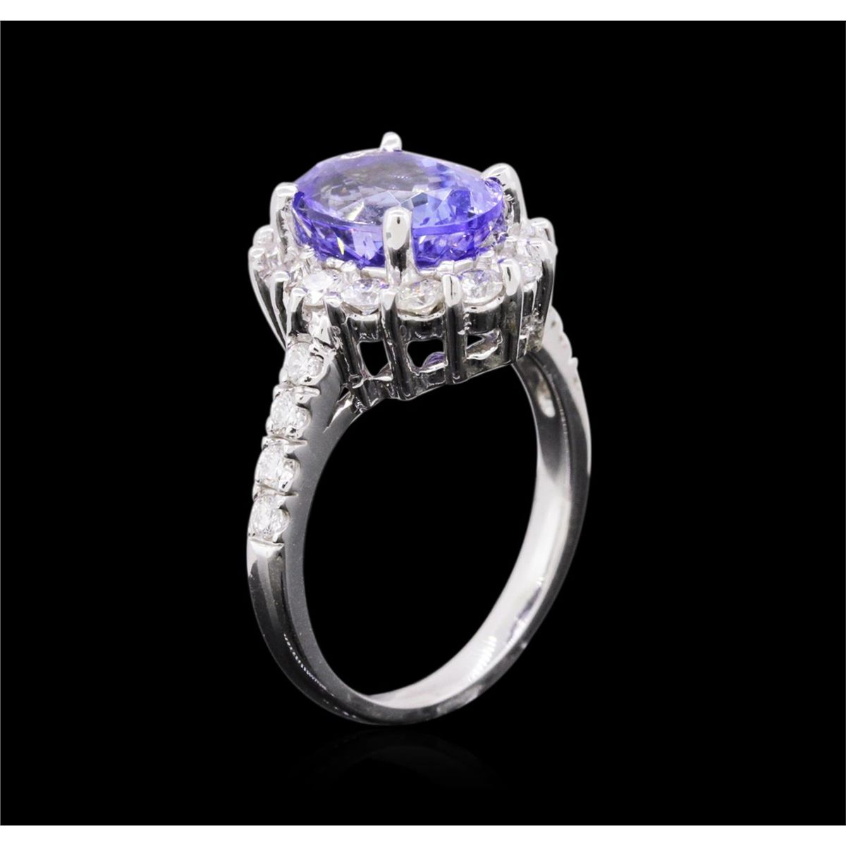 One electronically tested 14KT white gold ladies combination cast & assembled tanzanite and diamond ring with a bright polish finish. Identified with markings of "14K". Condition is new. Containing: One prong set oval modified brilliant cut natural tanzanite, measuring 10.78 x 8.02 x 5.79mm, approximate weight of 3.43ct., clarity is eye clean, type I, medium, moderately strong, violet color, (GIA V 5/4), cut is good. Twenty-Two prong set round brilliant cut diamonds, measuring 2.00 - 2.00 x 1.20mm (depth est.) approximate total  weight of 22 Stones = 0.64ct. Clarity: SI-2 to I-1. Color: I - J, Cut is Good. Colored gemstones are presumed to have been subjected to commonly used enhancement processes. All diamonds and colored gemstones are graded in the mounting, unless otherwise stated. Total Weight of Colored Stones 3.43ct. Total Weight of Diamonds 0.64ct. Total Weight of Ring 5.90 grams. GGL Appraised at $6,360.00.