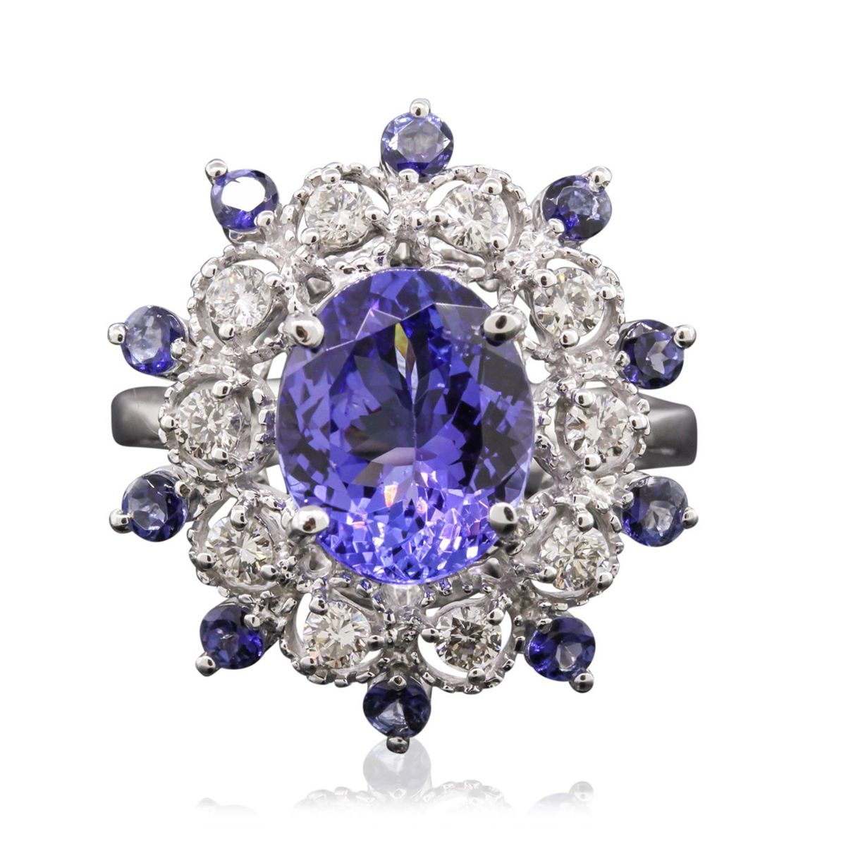 One electronically tested 14KT white gold Ladies combination cast & assembled ring with a bright polish finish. Condition is new. Identified with markings of "14K". Containing: One prong set oval modified brilliant cut natural tanzanite, measuring 10.40 x 8.50 x 4.90mm, approximate weight of 2.93ct., clarity is eye clean, type I, medium light, very slightly grayish, bluish violet color, (GIA bV 4/3), cut is good. Ten prong set round modified brilliant cut natural tanzanites, measuring 2.20 - 2.20 x 1.43 mm, approximate. Total Weight of 0.50ct., clarity is eye clean, type I, medium light, very slightly grayish, bluish violet color, (GIA bV 4/3), cut is very good. Colored gemstones are presumed to have been subjected to commonly used color/clarity enhancement processes. Ten prong set round brilliant cut diamonds, measuring 2.20 - 2.20 x 1.32mm (depth est.) approximate. Total Weight of 10 Stones = 0.39ct. Clarity: SI-2 to I-1. Color: H - I, Cut is Good. All grading of diamonds and colored gemstones in this piece of jewelry are graded in the mounting, unless otherwise stated. Total Weight of Colored Stones 3.43ct. Total Weight of Diamonds 0.39ct. Total Weight of Ring 5.50 grams. GGL Appraised at $7,450.00.