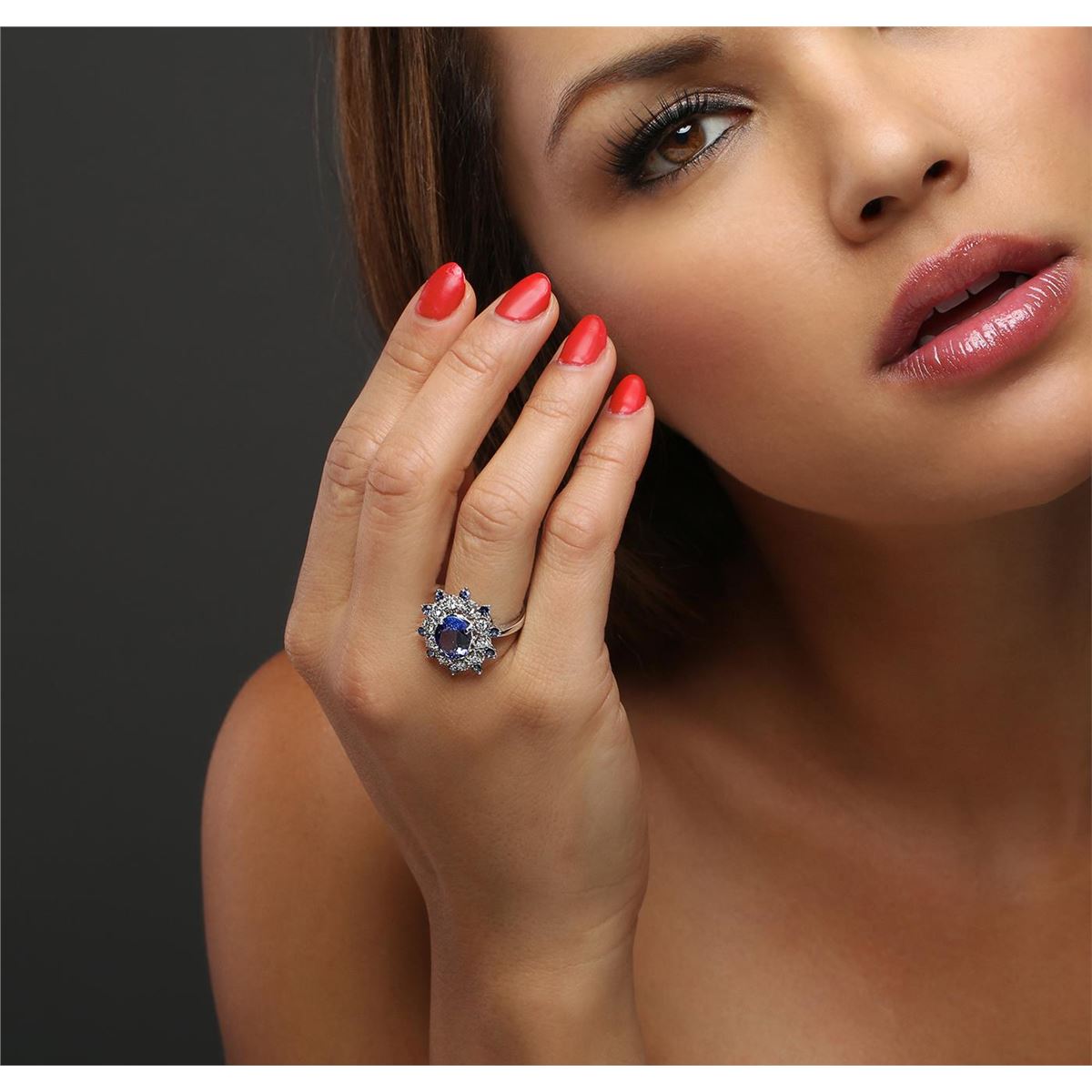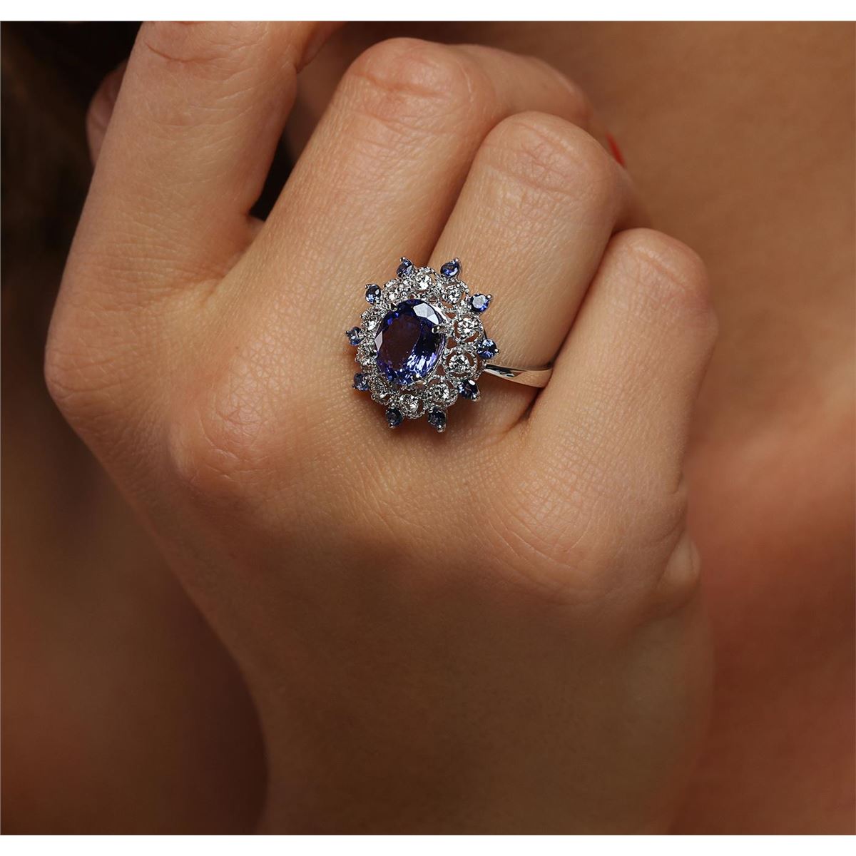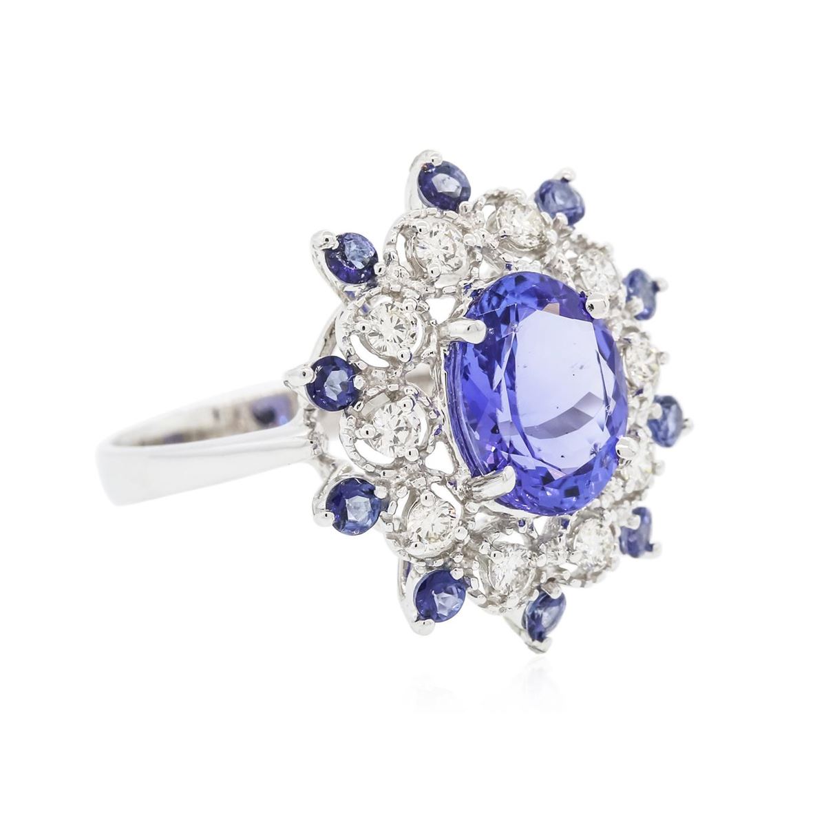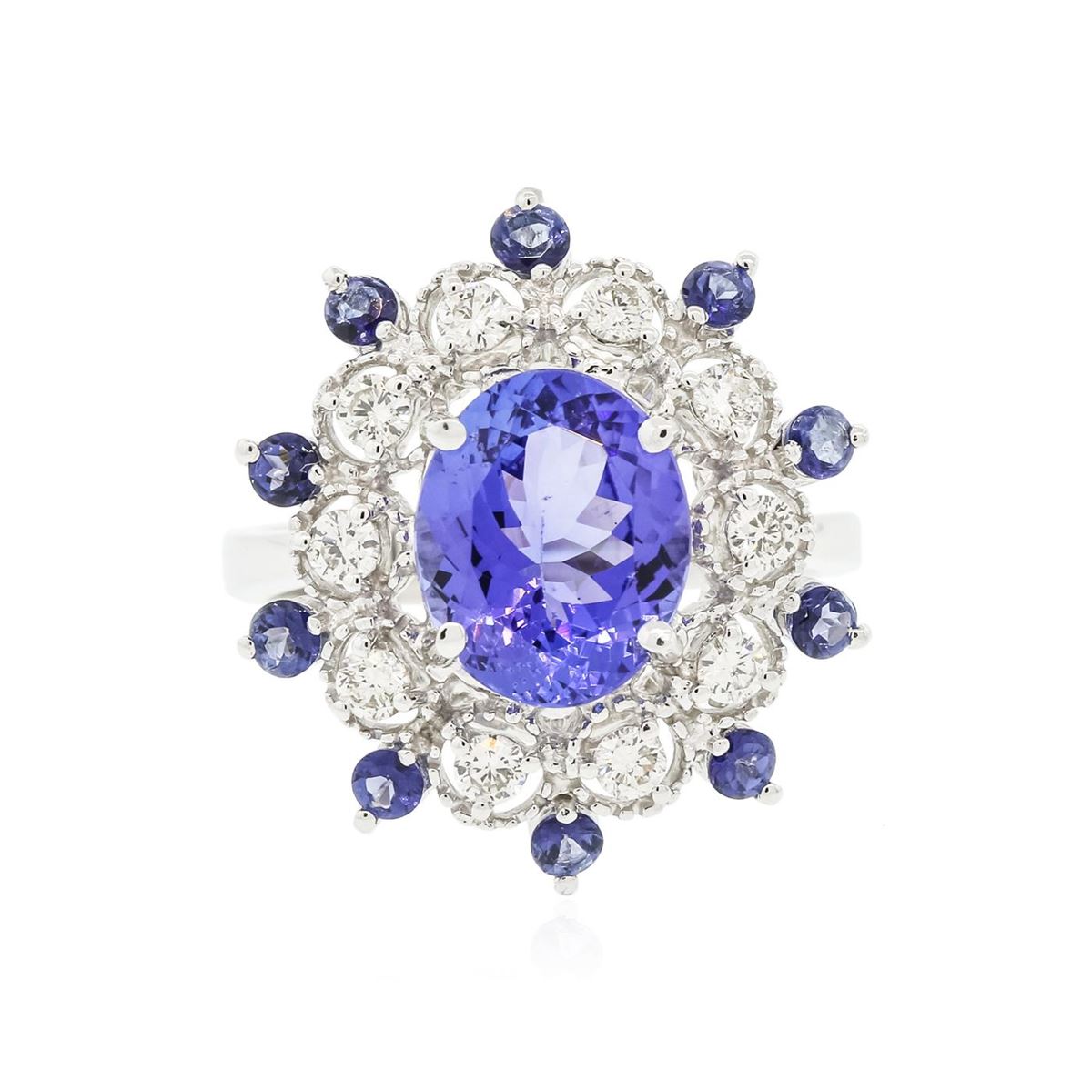 One electronically tested 14KT white gold Ladies combination cast & assembled ring with a bright polish finish. Condition is new. Identified with markings of "14K". Containing: One prong set oval modified brilliant cut natural tanzanite, measuring 10.40 x 8.50 x 4.90mm, approximate weight of 2.93ct., clarity is eye clean, type I, medium light, very slightly grayish, bluish violet color, (GIA bV 4/3), cut is good. Ten prong set round modified brilliant cut natural tanzanites, measuring 2.20 - 2.20 x 1.43 mm, approximate. Total Weight of 0.50ct., clarity is eye clean, type I, medium light, very slightly grayish, bluish violet color, (GIA bV 4/3), cut is very good. Colored gemstones are presumed to have been subjected to commonly used color/clarity enhancement processes. Ten prong set round brilliant cut diamonds, measuring 2.20 - 2.20 x 1.32mm (depth est.) approximate. Total Weight of 10 Stones = 0.39ct. Clarity: SI-2 to I-1. Color: H - I, Cut is Good. All grading of diamonds and colored gemstones in this piece of jewelry are graded in the mounting, unless otherwise stated. Total Weight of Colored Stones 3.43ct. Total Weight of Diamonds 0.39ct. Total Weight of Ring 5.50 grams. GGL Appraised at $7,450.00.