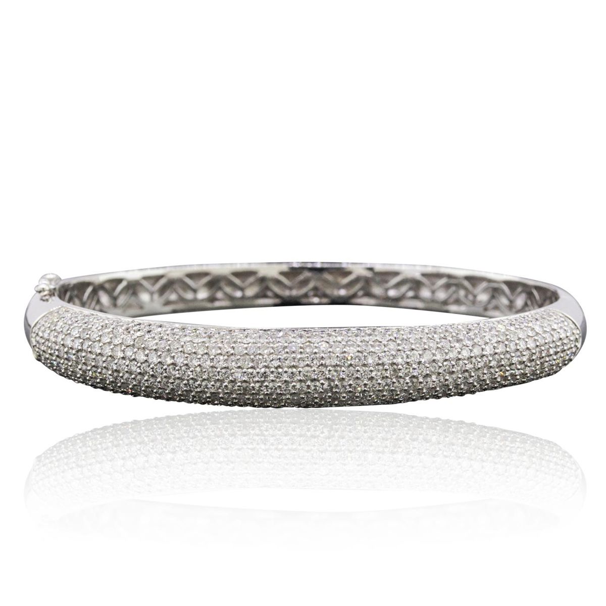 One electronically tested 14KT white gold ladies combination cast & assembled diamond bangle bracelet with a hidden box clasp with safety closer with a bright polish finish. Measurements: 2.50" x 2.20". Identified with markings of "14K". Condition is new. Containing: Four Hundred Thirty prong set round brilliant cut diamonds, measuring 1.30 - 1.30 x 0.78mm (depth est.) approximate total weight of 430 Stones = 3.44ct. . Clarity: I-1 to I-2. Color: H - I, Cut is Good. All diamonds are graded in the mounting, unless otherwise stated.. Total Weight of Diamonds 3.44ct.. Total Weight of Bangle Bracelet 23.30 grams. GGL Appraised at $11,365.00.