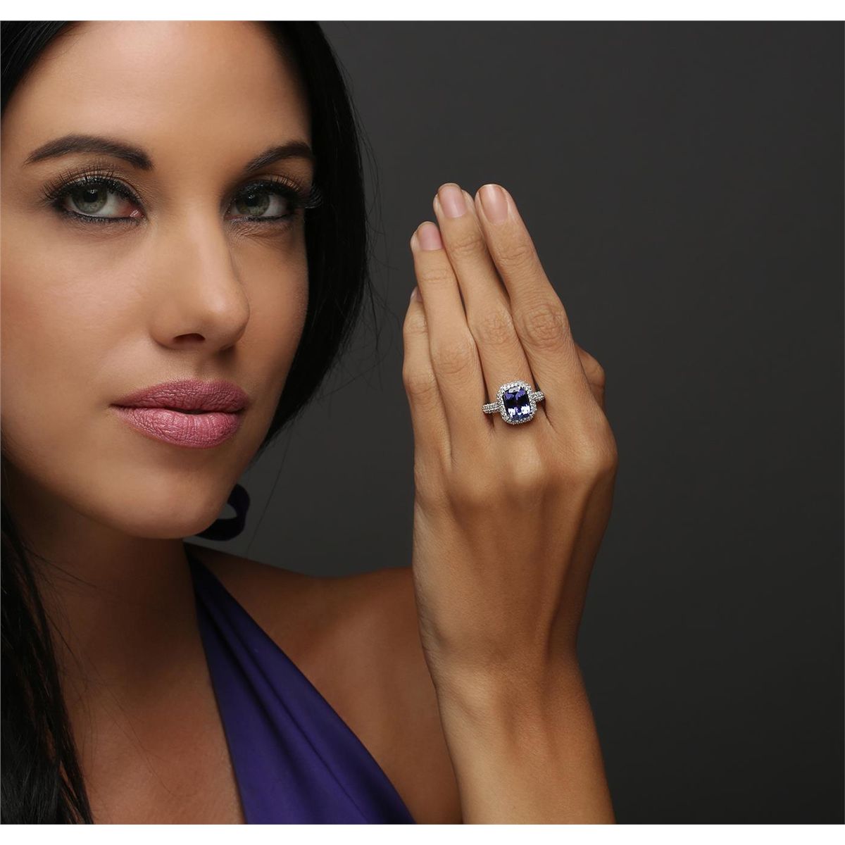 One electronically tested 14KT white gold ladies combination cast & assembled tanzanite and diamond ring with a flat shank with a bright polish finish. Identified with markings of "14K". Condition is new. Containing: One prong set rectangular cushion modified brilliant cut natural tanzanite, measuring 10.51 x 7.09 x 5.88mm, approximate weight of 3.45ct., clarity is eye clean, type I, medium light, moderately strong, bluish violet color, (GIA bV 4/4), cut is good. Forty-Nine prong set round brilliant cut diamonds, measuring 1.50 - 1.50 x 0.90mm (depth est.) approximate total weight of 49 Stones = 0.60ct. Clarity: I-1 to I-2. Color: I - J, Cut is Good. Colored gemstones are presumed to have been subjected to commonly used enhancement processes. All diamonds and colored gemstones are graded in the mounting, unless otherwise stated. Total Weight of Colored Stones 3.45ct. Total Weight of Diamonds 0.60ct. Total Weight of Ring 3.90 grams. GGL Appraised at $7,300.00.