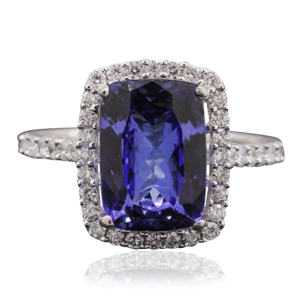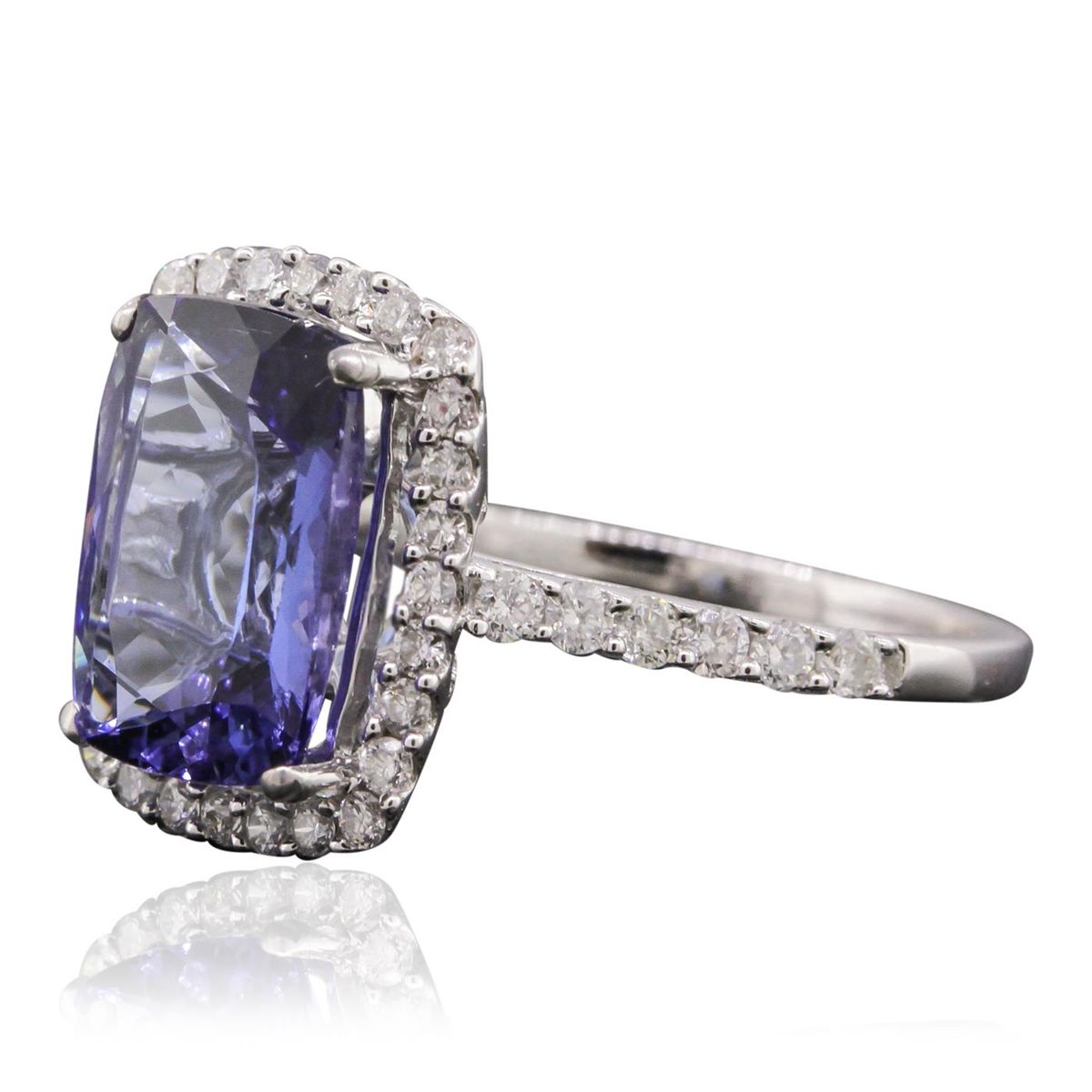 One electronically tested 14KT white gold ladies cast tanzanite and diamond ring with a bright polish finish. The featured tanzanite is set within a diamond bezel, supported by diamond set shoulders and completed by a one and one-half millimeter wide band. Trademark is Orianne. Identified with markings of "14K". Condition is new, good workmanship. Containing: One prong set rectangular cushion mixed cut natural tanzanite, measuring 11.00. x 7.80 x 4.55mm, 8%. bulge factor, approximate weight of 3.45ct., clarity is eye clean, type I, medium dark, very slightly grayish, violet color, (GIA V 6/3), cut is good. Transmitting light with no distortion, transparent. Graded in the setting.Tanzanite is a very rare gemstone that is only found in the country of Tanzania. Originally discovered in 1967. Tiffany & Company, named the stone Tanzanite. It is found in the Usumburu Mountains that border the Umba Valley of northern Tanzania. Tanzanite occurs in gray, brown, violet, blue, reddish-purple, & green. The gem is interesting because of its exceptional pleochroism. Rotated in different directions a tanzanite will exhibit multiple changes of color. Tanzanite has a low tolerance to ultrasonic cleaning, and should not be cleaned using this method.Forty prong set round brilliant cut diamonds, measuring 1.70 - 1.30 x 0.90mm (depth est.) approximate. Total Weight of 40 Stones = 0.52ct. Graded in the setting. Clarity: SI-2 to I-1 . Color: F - H. Total Weight of Colored Stones 3.45ct. Total Weight of Diamonds 0.52ct. Total Weight of Ring 3.20gm. AIG Appraised at $10,400.00.