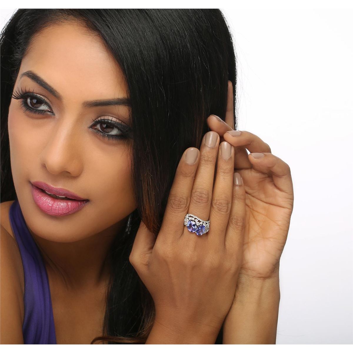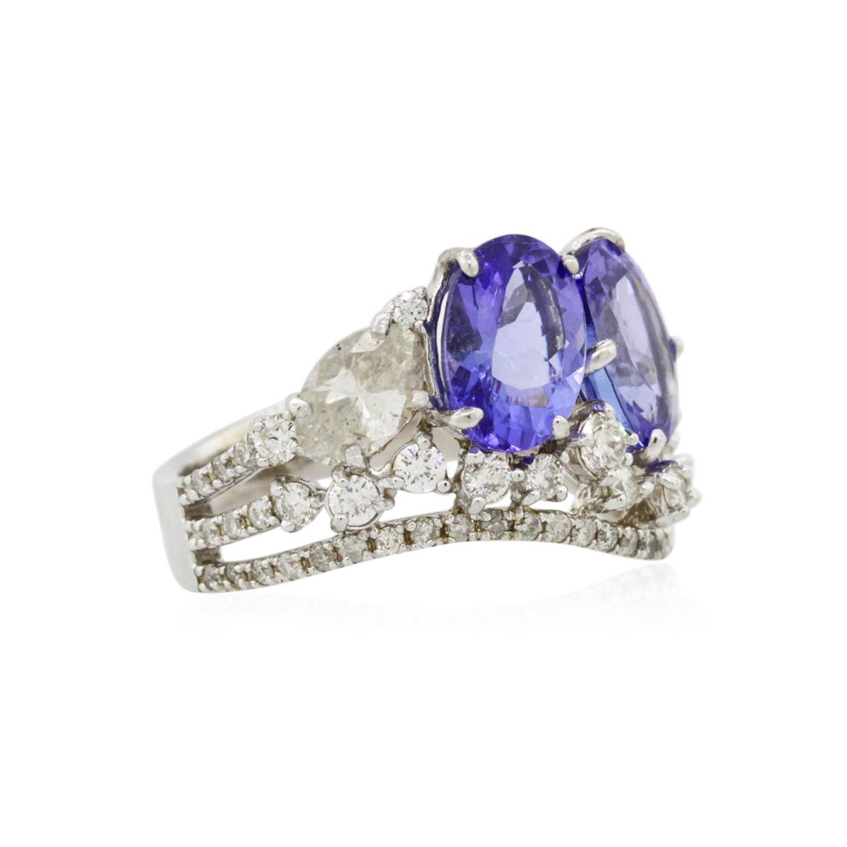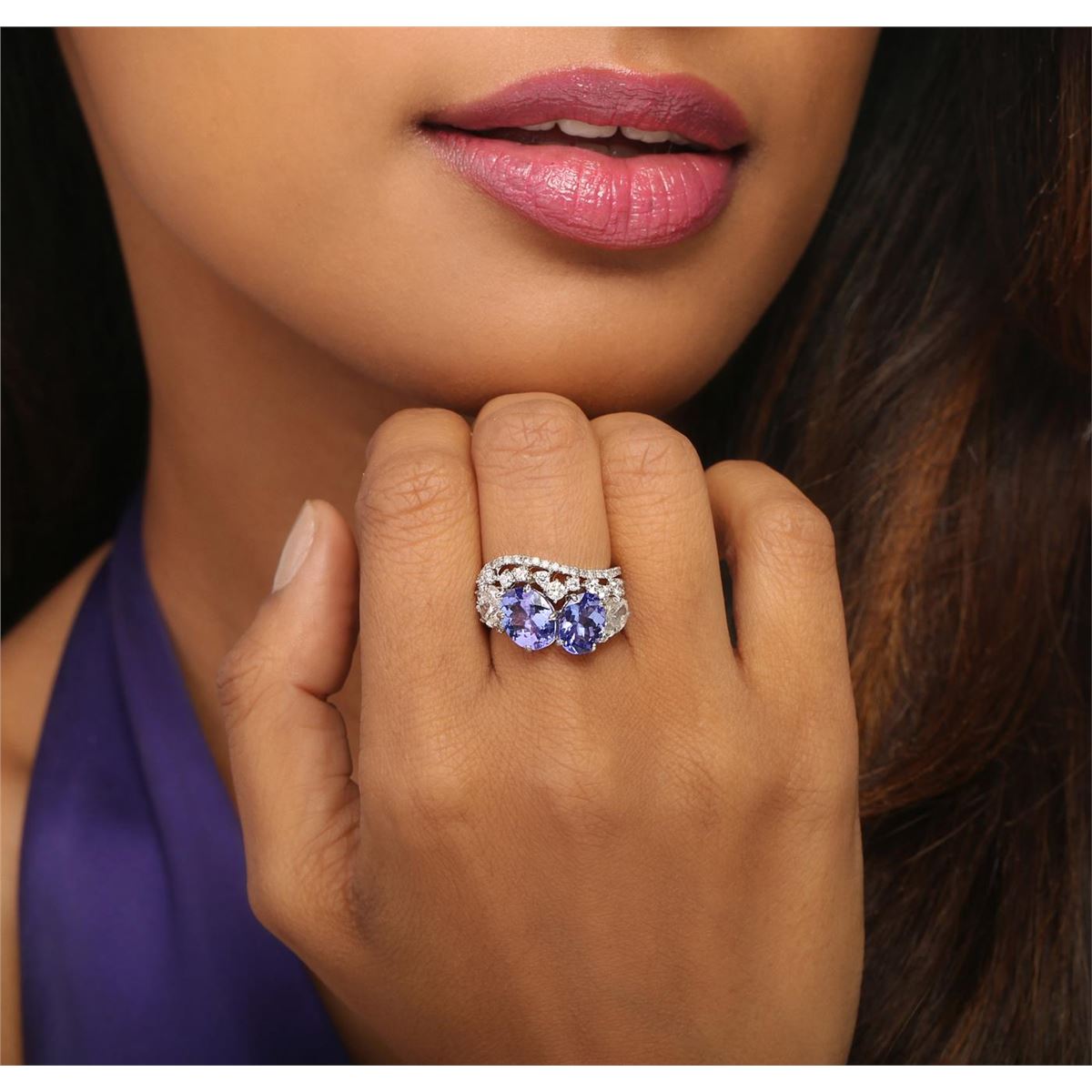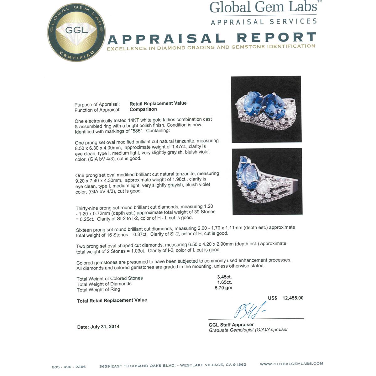 One electronically tested 14KT white gold ladies combination cast & assembled ring with a bright polish finish. Condition is new. Identified with markings of "585". Containing: One prong set oval modified brilliant cut natural tanzanite, measuring 8.50 x 6.30 x 4.00mm, approximate weight of 1.47ct., clarity is eye clean, type I, medium light, very slightly grayish, bluish violet color, (GIA bV 4/3), cut is good. One prong set oval modified brilliant cut natural tanzanite, measuring 9.20 x 7.40 x 4.30mm, approximate weight of 1.98ct., clarity is eye clean, type I, medium light, very slightly grayish, bluish violet color, (GIA bV 4/3), cut is good. Thirty-Nine prong set round brilliant cut diamonds, measuring 1.20 - 1.20 x 0.72mm (depth est.) approximate. Total Weight of 39 Stones = 0.25ct. Clarity: SI-2 to I-2. Color: H - I, Cut is Good. Sixteen prong set round brilliant cut diamonds, measuring 2.00 - 1.70 x 1.11mm (depth est.) approximate. Total Weight of 16 Stones = 0.37ct. Clarity: SI-2. Color: H, Cut is Good. Two prong set oval shaped cut diamonds, measuring 6.50 x 4.20 x 2.90mm (depth est.) approximate. Total Weight of 2 Stones = 1.03ct. Clarity: I-2. Color: I, Cut is Good. Colored gemstones are presumed to have been subjected to commonly used enhancement processes. All diamonds and colored gemstones are graded in the mounting, unless otherwise stated. Total Weight of Colored Stones 3.45ct. Total Weight of Diamonds 1.65ct. Total Weight of Ring 5.70 grams. GGL Appraised at $12,455.00.