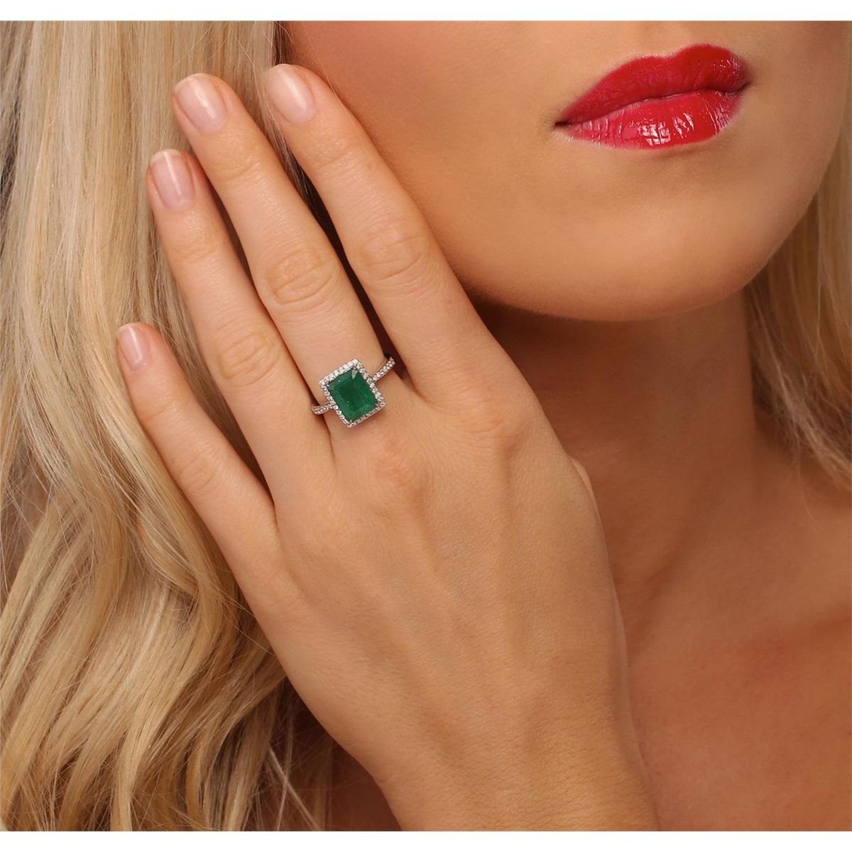 One electronically tested 14KT white gold ladies cast emerald and diamond ring with a bright polish finish. Condition is new, good workmanship. The featured emerald is set within a diamond bezel, supported by diamond set shoulders and completed by a three millimeter wide band. Trademark is CJ. Identified with markings of "14K". Containing: One prong set rectangular step cut natural emerald, measuring 9.90 x 7.80 x 5.65mm, approximate weight of 3.46ct., clarity is heavily included, type III, medium dark, moderately strong, very slightly bluish green color, (GIA vslbG 6/4), cut is good. Transmitting light with a minimum of distortion, transparent to translucent. Naturally occurring internal & external characteristics are present. Indications of oil residue. Graded in the setting. Forty-Six prong & bead set round brilliant cut diamonds, measuring 1.30 - 1.10 x 0.72mm (depth est.) approximate total weight of 46 Stones = 0.42ct. Graded in the setting. Clarity I-1 to I-2. Color F - H. Total Weight of Colored Stones 3.46 ct. Total Weight of Diamonds 0.42 ct. Total Weight of Ring 5.20 grams. AIG Appraised at $9,935.00.
