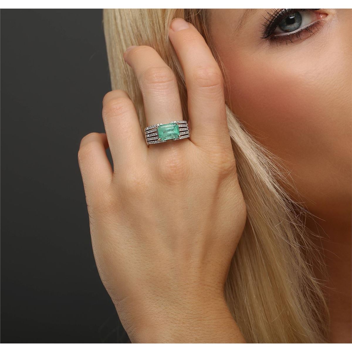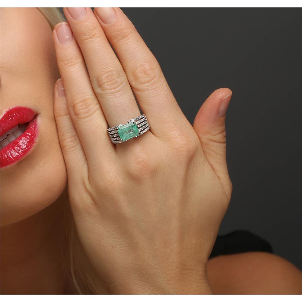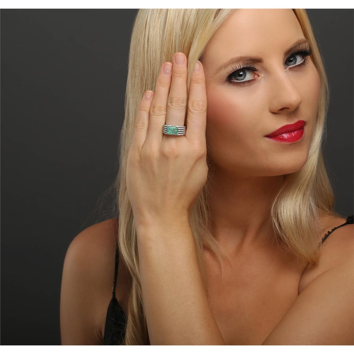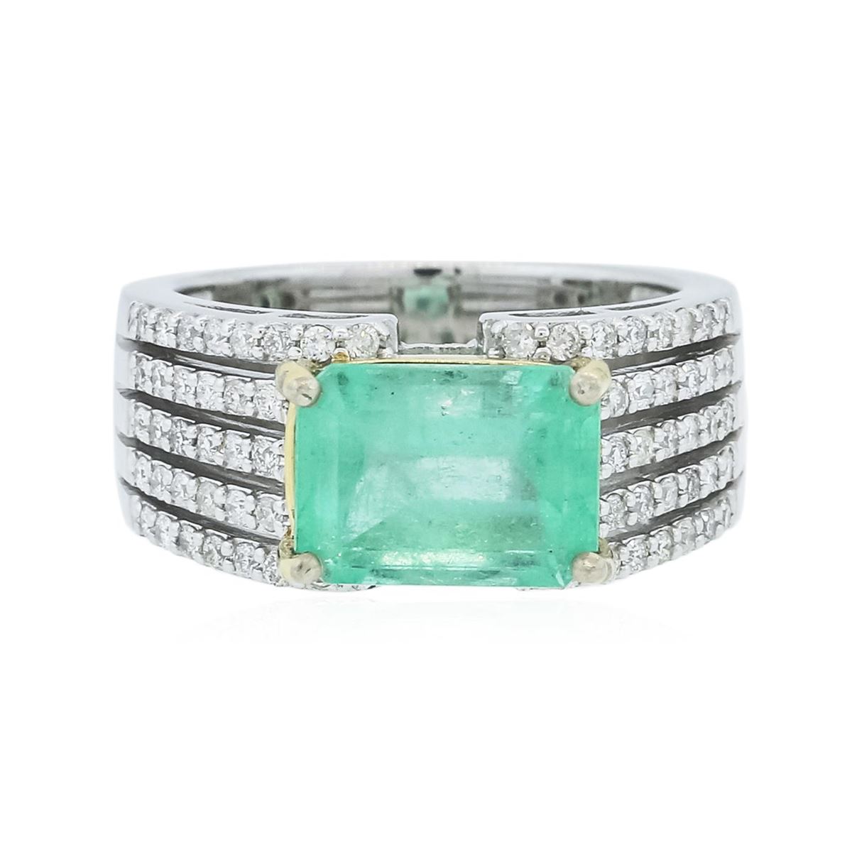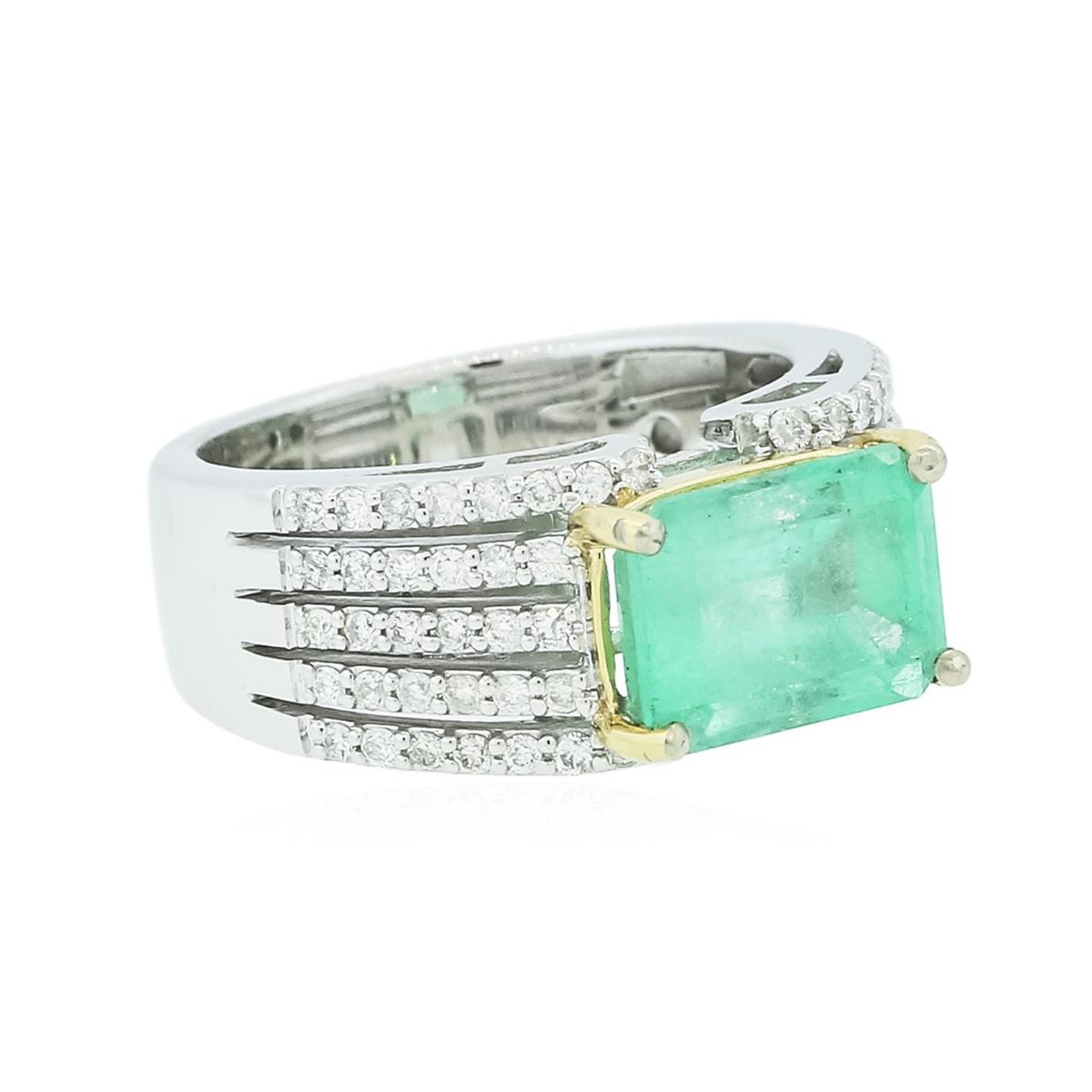 One electronically tested 14KT white gold ladies cast emerald and diamond ring. The featured emerald is set within diamond set five-way split shoulders, completed by a five and one-half millimeter wide band. Bright polish finish with yellow gold accents. Identified with markings of "14K". Condition is new, good workmanship. Containing: One prong set rectangular step cut natural emerald, measuring 10.40 x 7.70 x 5.01mm, 6% bulge factor, approximate weight of 3.47ct., clarity is heavily included, type III, medium, very slightly grayish, very slightly bluish green color, (GIA vslbG 5/3), cut is good. Transmitting light with a minimum of distortion, transparent. Naturally occurring internal & external characteristics are present. Indications of oil residue. Graded in the setting. Sixty-Eight prong set round brilliant cut diamonds, measuring 1.40 - 1.30 x 0.81mm (depth est.) approximate total weight of 68 Stones = 0.72ct. Graded in the setting. Clarity: SI-1 to I-1. Color: G - I. Total Weight of Colored Stones 3.47ct. Total Weight of Diamonds 0.72ct. Total Weight of Ring 8.06 grams. AIG Appraised at $8,170.00.