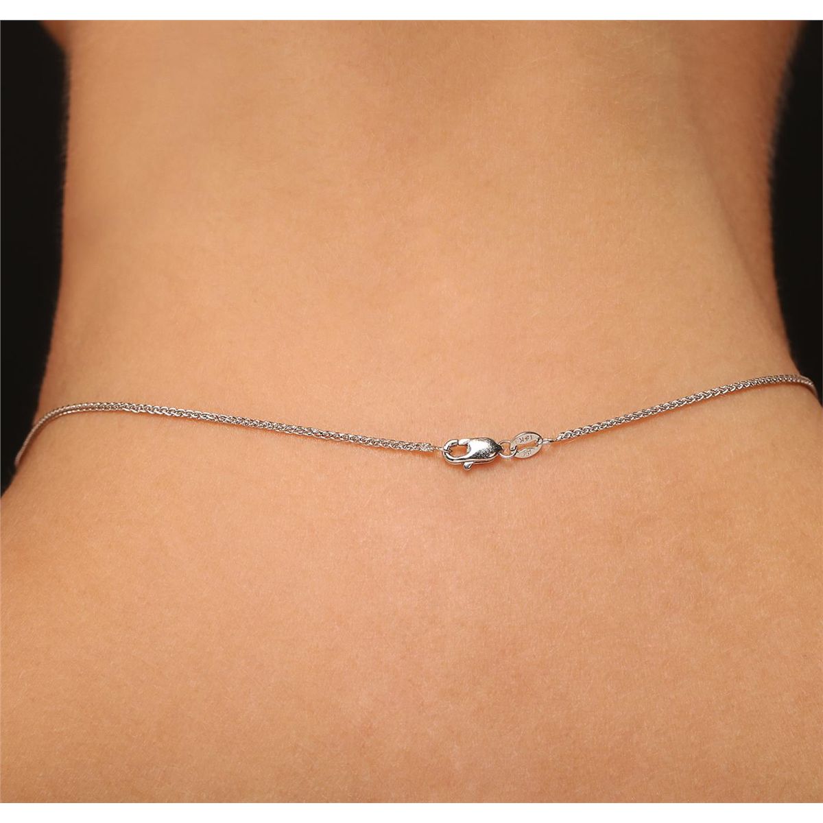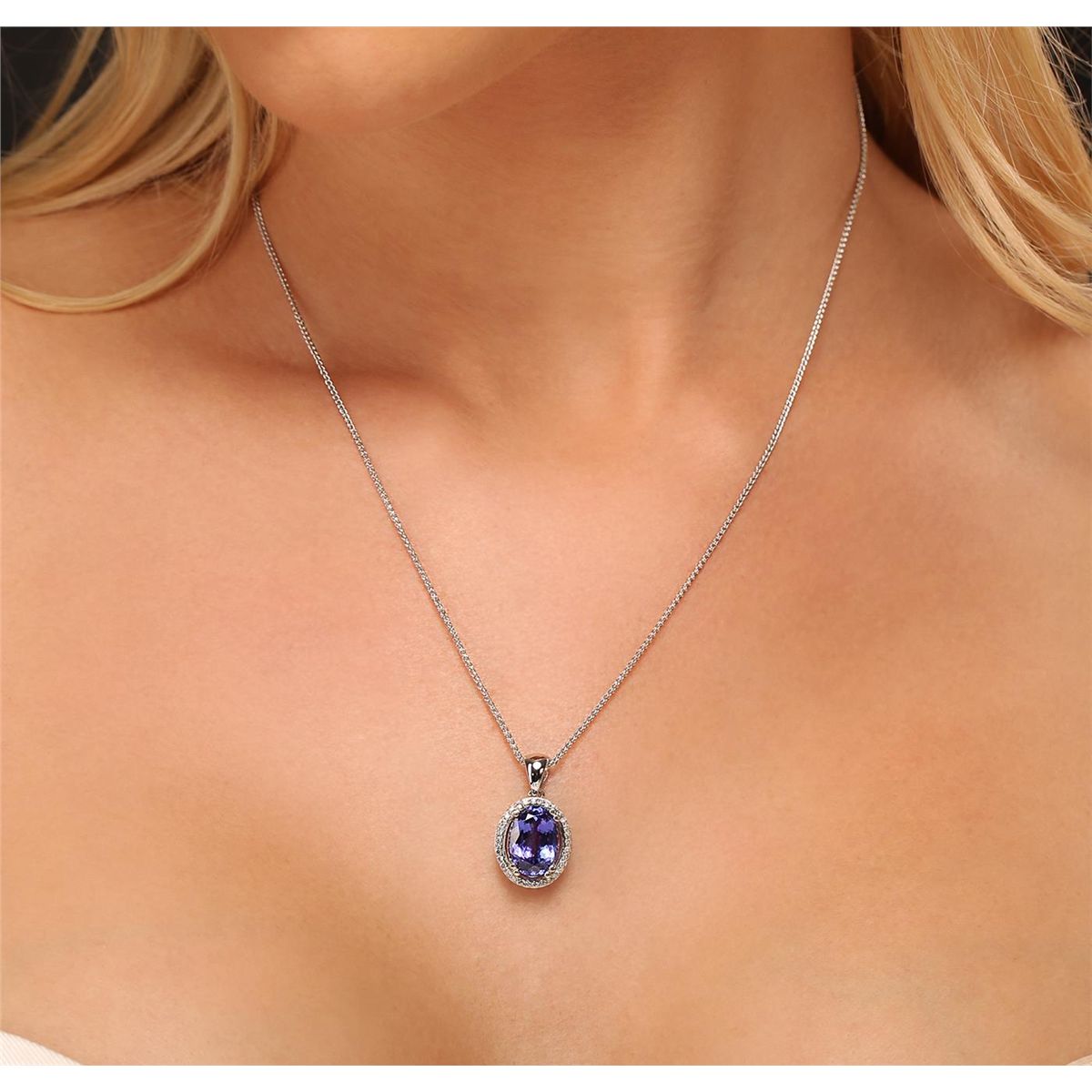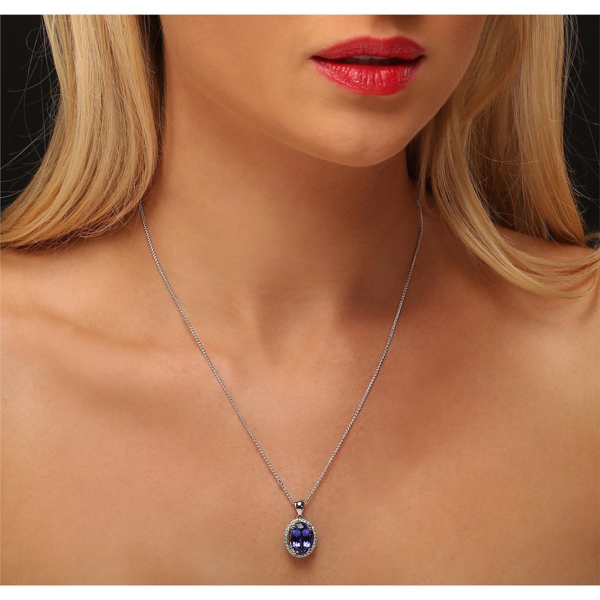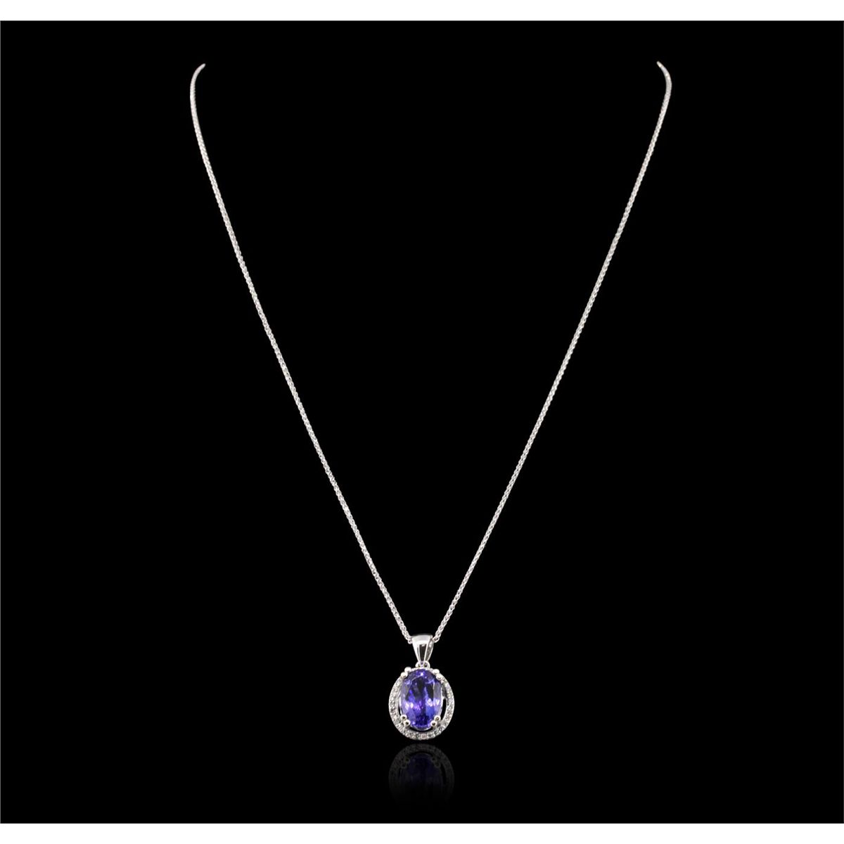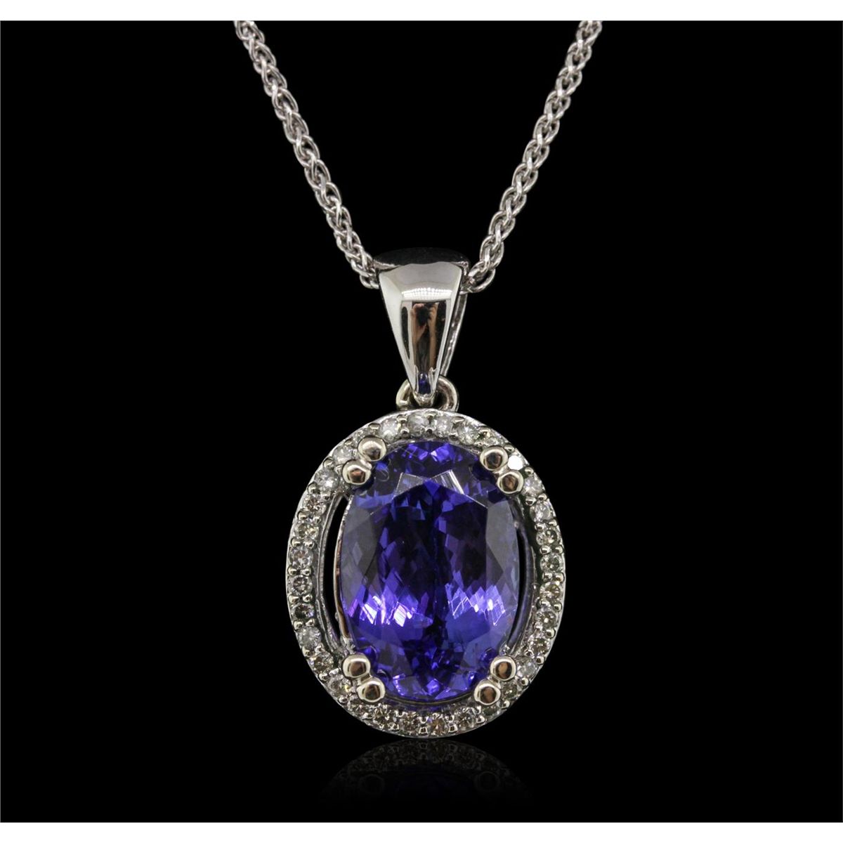 One electronically tested 14KT white gold ladies combination cast & die struck pendant & chain 17.0" long, medium cable link with a lobster claw clasp with a bright polish finish. Condition is new. Identified with markings of "14K". Containing: One prong set oval modified brilliant cut natural tanzanite, measuring 11.40 x 8.00 x 5.50mm, approximate weight of 3.47ct., clarity is eye clean, type I, medium, moderately strong, bluish violet color, (GIA bV 5/4), cut is good. Thirty-Two prong set round brilliant cut diamonds, measuring 1.30 - 1.30 x 0.78mm (depth est.) approximate total weight of 32 Stones = 0.26ct. Clarity: SI-2 to I-1. Color: J - K, Cut is Good. Colored gemstones are presumed to have been subjected to commonly used enhancement processes. All diamonds and colored gemstones are graded in the mounting, unless otherwise stated. Total Weight of Colored Stones 3.47ct. Total Weight of Diamonds 0.26ct. Total Weight of Pendant & Chain 5.80 grams. GGL Appraised at $7,410.00.