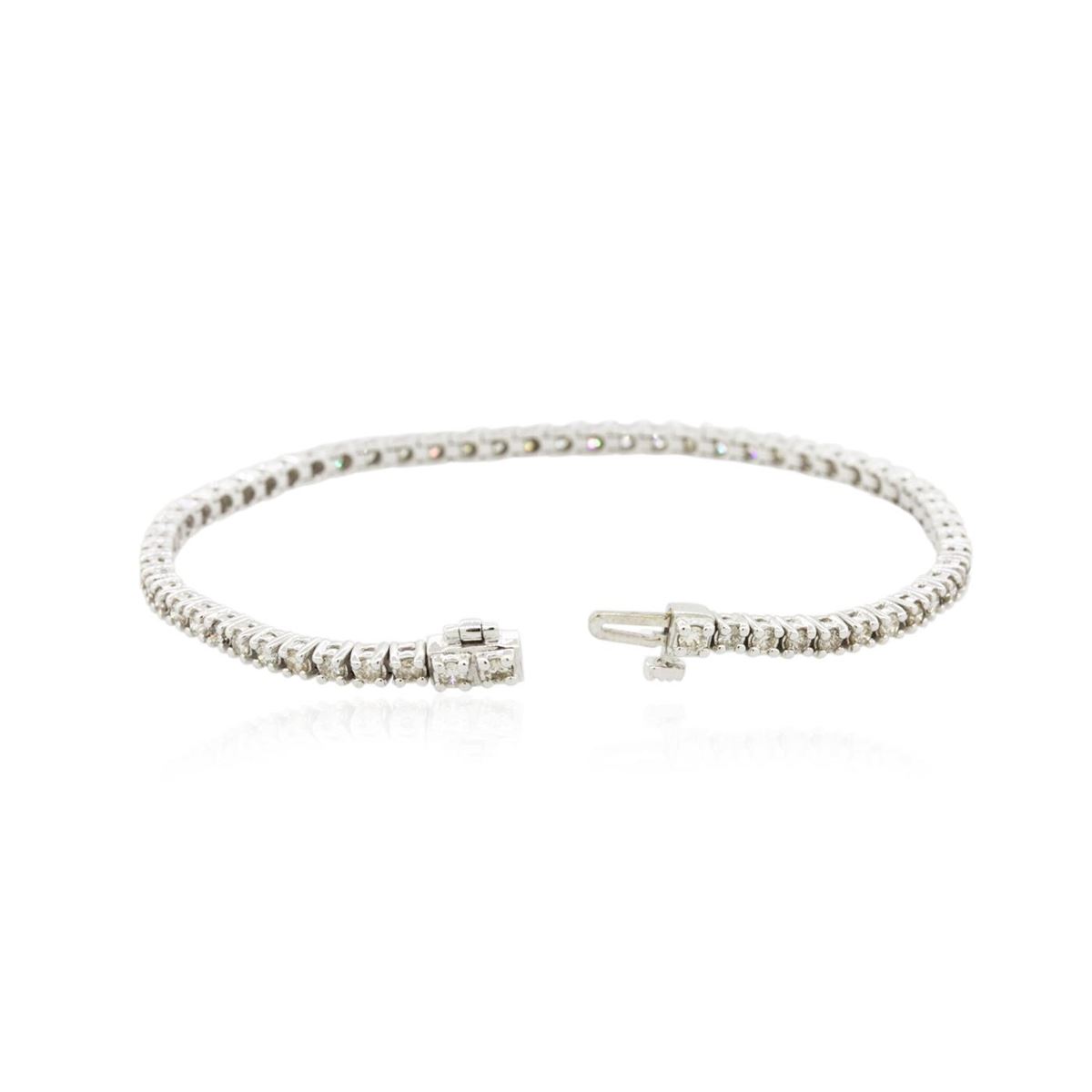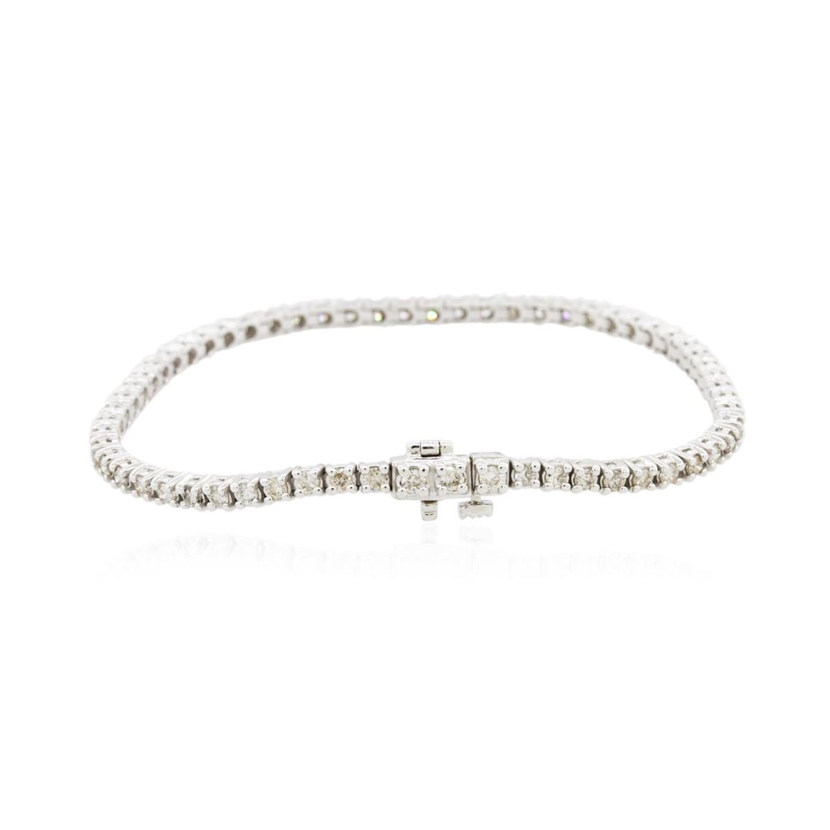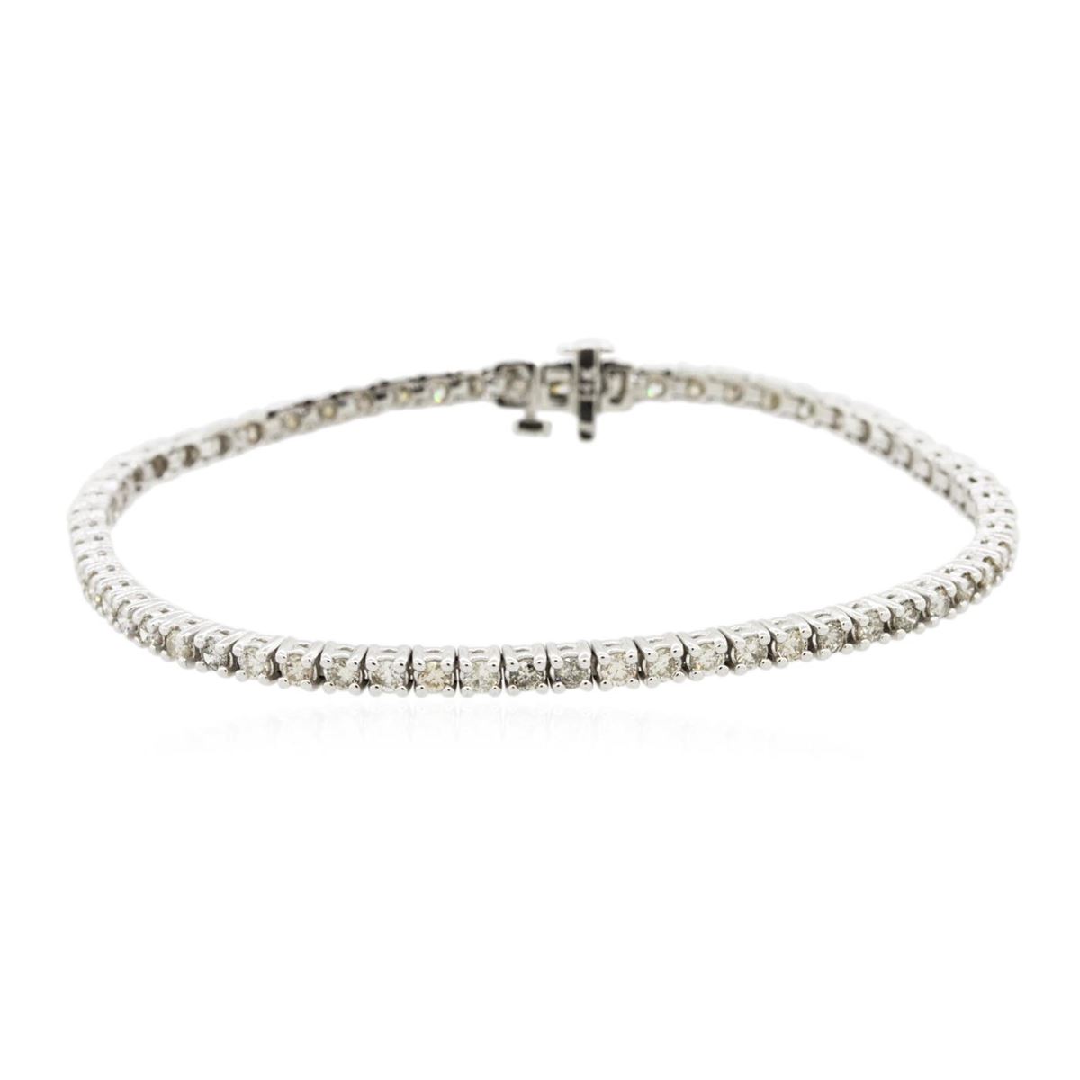 One electronically tested 14KT white gold Ladies combination cast & assembled tennis bracelet with a hidden box clasp with a bright polish finish. Condition is new. Measurements: 7" in length. Identified with markings of "14K". Containing: Sixty-One prong set round brilliant cut diamonds, measuring 2.50 - 2.50 x 1.50mm (depth est.) approximate. Total Weight of 61 Stones = 3.48ct. Clarity: I-1 to I-2. Color: J, Cut is Good. Total Weight of Diamonds 3.48ct. Total Weight of Bracelet 10.80 grams. GGL Appraised at $9,220.00.