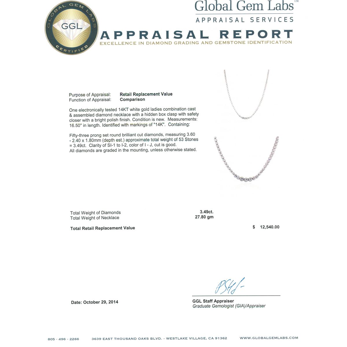 One electronically tested 14KT white gold ladies combination cast & assembled diamond necklace with a hidden box clasp with safety closer with a bright polish finish. Measurements: 16.50 in length. Identified with markings of 14K. Condition is new. Containing: Fifty-Three prong set round brilliant cut diamonds, measuring 3.60 - 2.40 x 1.80mm (depth est.) approximate total weight of 53 Stones = 3.49ct. Clarity: SI-1 to I-2. Color: I - J, Cut is Good. All diamonds are graded in the mounting, unless otherwise stated. Total Weight of Diamonds 3.49ct. Total Weight of Necklace 27.80 grams. GGL Appraised at $12,540.00.