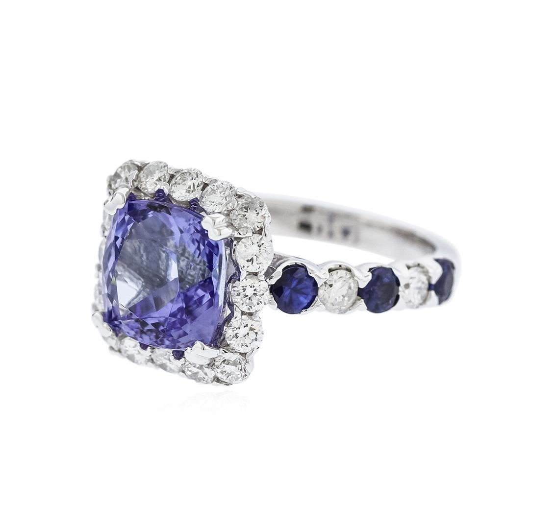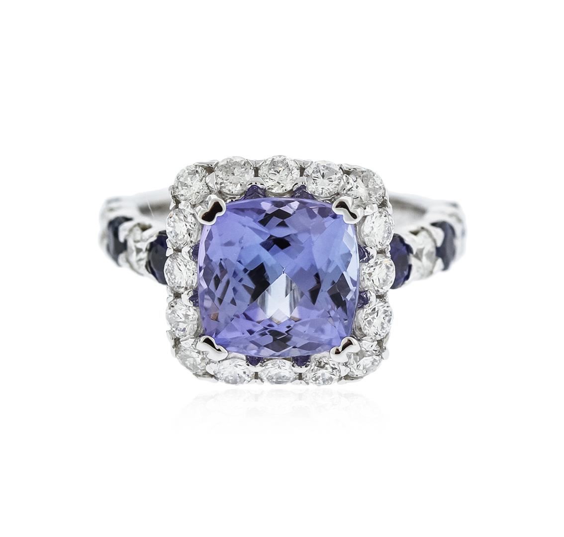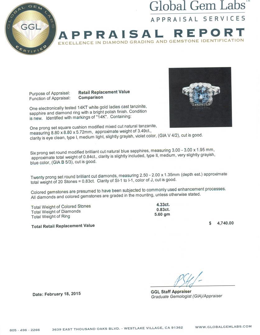 One electronically tested 14KT white gold ladies cast tanzanite, sapphire and diamond ring with a bright polish finish. Identified with markings of "14K". Condition is new. Containing: One prong set square cushion modified mixed cut natural tanzanite, measuring 8.80 x 8.80 x 5.72mm, approximate weight of 3.49ct., clarity is eye clean, type I, medium light, slightly grayish, violet color, (GIA V 4/2), cut is good. Six prong set round modified brilliant cut natural blue sapphires, measuring 3.00 - 3.00 x 1.95 mm, approximate total weight of 0.84ct., clarity is slightly included, type II, medium, very slightly grayish, blue color, (GIA B 5/3), cut is good. Twenty prong set round brilliant cut diamonds, measuring 2.50 - 2.00 x 1.35mm (depth est.) approximate total weight of 20 Stones = 0.83ct. Clarity: SI-1 to I-1. Color: J, Cut is Good. Colored gemstones are presumed to have been subjected to commonly used enhancement processes. All diamonds and colored gemstones are graded in the mounting, unless otherwise stated. Total Weight of Colored Stones 4.33ct. Total Weight of Diamonds 0.83ct. Total Weight of Ring 5.60 grams. GGL Appraised at $4,740.00.